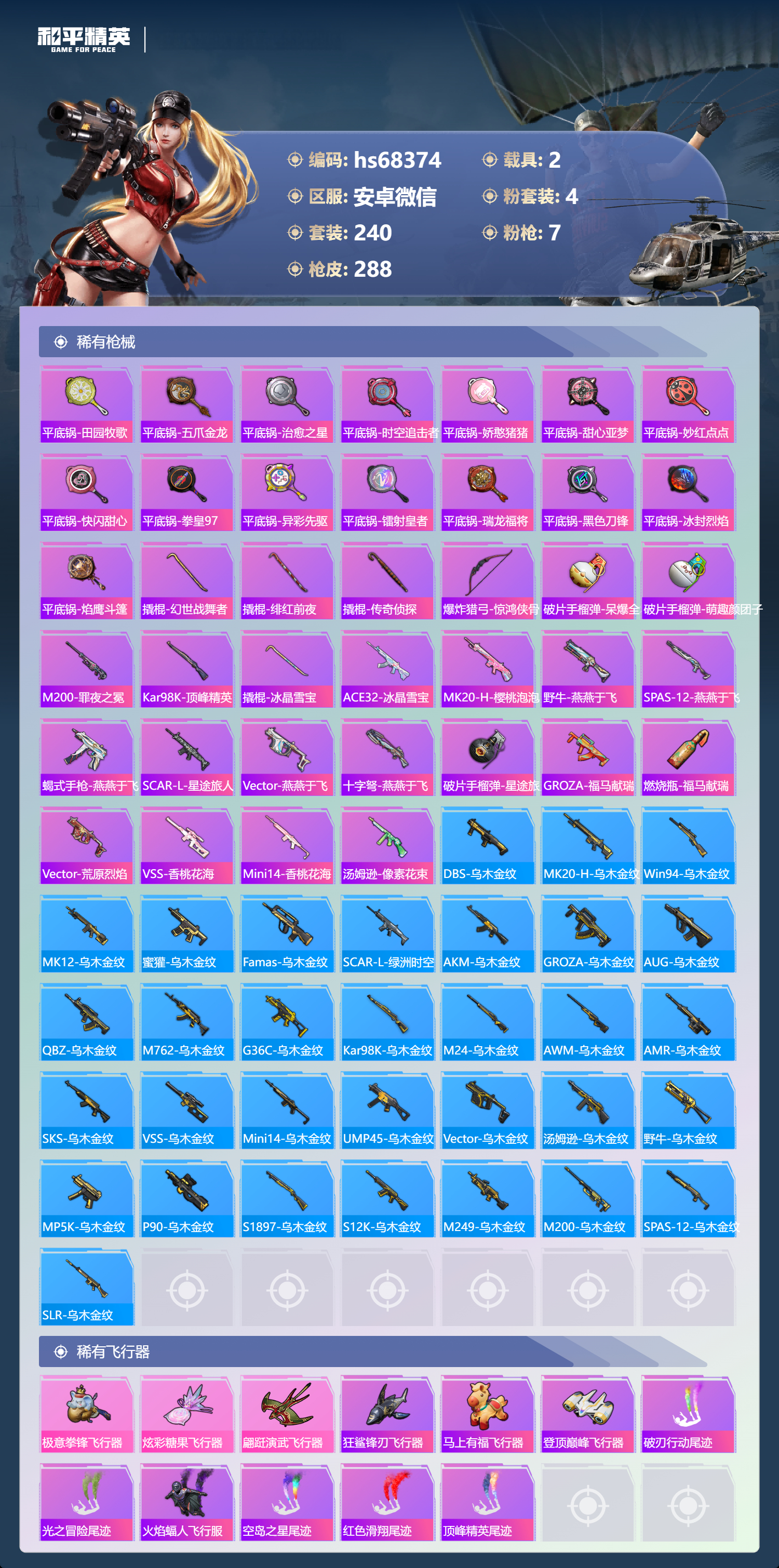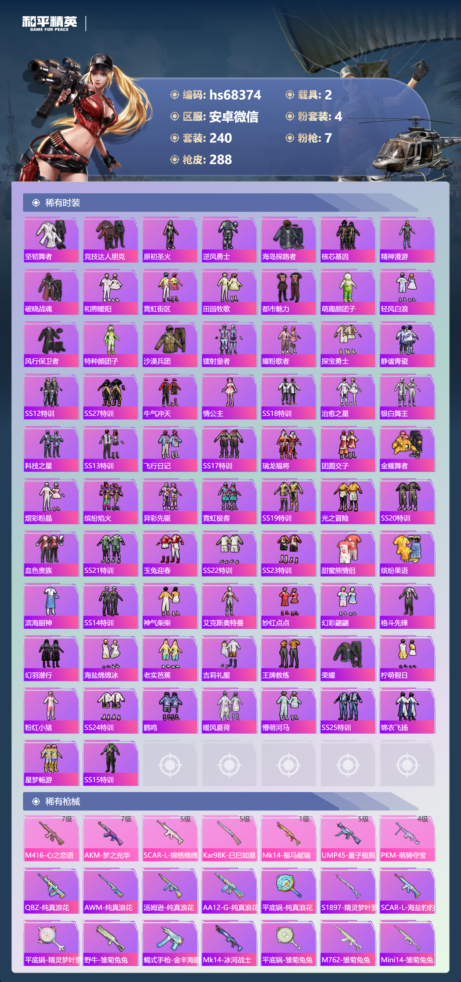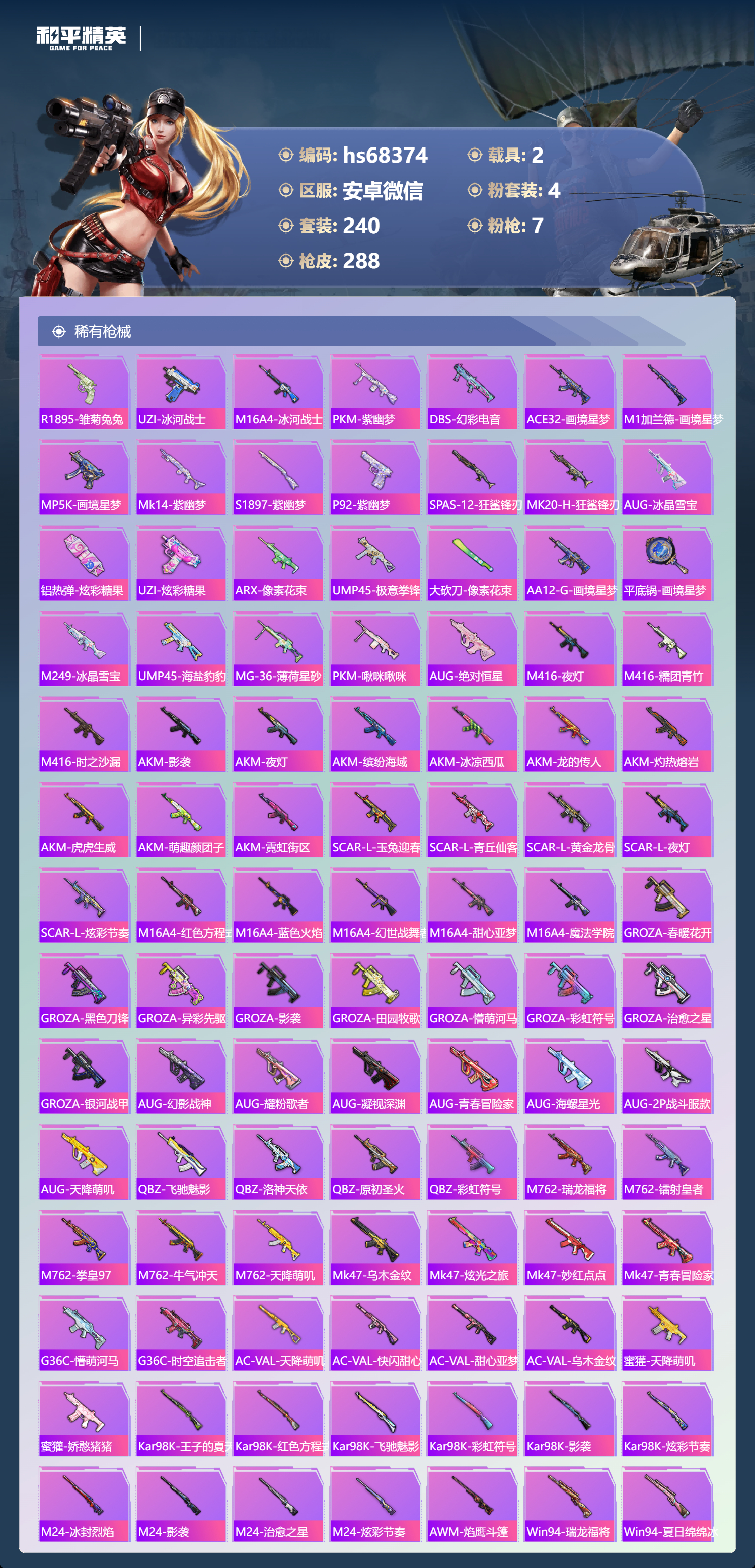 PX_2554269-,安卓微信-12王牌印记-4粉装-7特效枪-2载具-94081热力值-240套装-288枪皮-2卓越印记