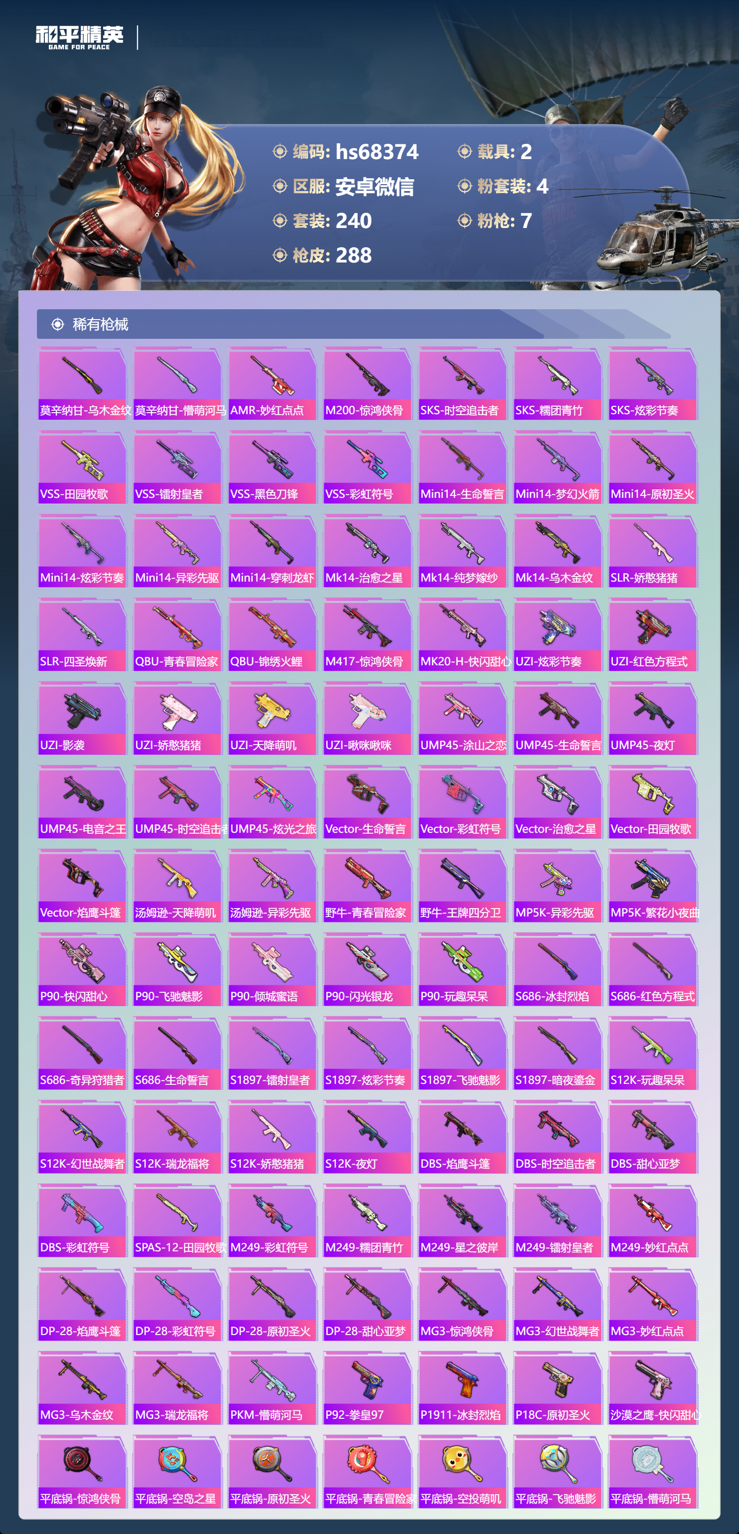 【288稀有枪械】M416-心之恋语/7级,AKM-梦之光华/7级,SCAR-L-锦绣绵绵/5级,Kar98K-巳巳如意/5级,Mk14-福马献瑞/1级,UMP45-量子极限/5级,PKM-萌骑夺宝/4级,QBZ-纯真浪花,AWM-纯真浪花,汤姆逊-纯真浪花,DBS-乌木金纹,AA12-G-纯真浪花,平底锅-纯真浪花,S1897-精灵梦叶罗丽,SCAR-L-海盐豹豹,平底锅-精灵梦叶罗丽,野牛-雏菊兔兔,蝎式手枪-金丰海韵,Mk14-冰河战士,平底锅-雏菊兔兔,M762-雏菊兔兔,Mini14-雏菊兔兔,R1895-雏菊兔兔,UZI-冰河战士,M16A4-冰河战士,MK20-H-乌木金纹,Win94-乌木金纹,MK12-乌木金纹,PKM-紫幽梦,DBS-幻彩电音,ACE32-画境星梦,M1加兰德-画境星梦,MP5K-画境星梦,Mk14-紫幽梦,蜜獾-乌木金纹,S1897-紫幽梦,P92-紫幽梦,SPAS-12-狂鲨锋刃,MK20-H-狂鲨锋刃,AUG-冰晶雪宝,铝热弹-炫彩糖果,UZI-炫彩糖果,ARX-像素花束,UMP45-极意拳锋,大砍刀-像素花束,AA12-G-画境星梦,平底锅-画境星梦,M249-冰晶雪宝,UMP45-海盐豹豹,Famas-乌木金纹,MG-36-薄荷星砂,SCAR-L-绿洲时空,PKM-啾咪啾咪,AUG-绝对恒星,M416-夜灯,M416-糯团青竹,M416-时之沙漏,AKM-影袭,AKM-夜灯,AKM-乌木金纹,AKM-缤纷海域,AKM-冰凉西瓜,AKM-龙的传人,AKM-灼热熔岩,AKM-虎虎生威,AKM-萌趣颜团子,AKM-霓虹街区,SCAR-L-玉兔迎春,SCAR-L-青丘仙客,SCAR-L-黄金龙骨,SCAR-L-夜灯,SCAR-L-炫彩节奏,M16A4-红色方程式,M16A4-蓝色火焰,M16A4-幻世战舞者,M16A4-甜心亚梦,M16A4-魔法学院,GROZA-乌木金纹,GROZA-春暖花开,GROZA-黑色刀锋,GROZA-异彩先驱,GROZA-影袭,GROZA-田园牧歌,GROZA-懵萌河马,GROZA-彩虹符号,GROZA-治愈之星,GROZA-银河战甲,AUG-乌木金纹,AUG-幻影战神,AUG-耀粉歌者,AUG-凝视深渊,AUG-青春冒险家,AUG-海螺星光,AUG-2P战斗服款,AUG-天降萌叽,QBZ-飞驰魅影,QBZ-洛神天依,QBZ-原初圣火,QBZ-乌木金纹,QBZ-彩虹符号,M762-瑞龙福将,M762-镭射皇者,M762-拳皇97,M762-乌木金纹,M762-牛气冲天,M762-天降萌叽,Mk47-乌木金纹,Mk47-炫光之旅,Mk47-妙红点点,Mk47-青春冒险家,G36C-乌木金纹,G36C-懵萌河马,G36C-时空追击者,AC-VAL-天降萌叽,AC-VAL-快闪甜心,AC-VAL-甜心亚梦,AC-VAL-乌木金纹,蜜獾-天降萌叽,蜜獾-娇憨猪猪,Kar98K-乌木金纹,Kar98K-王子的夏天,Kar98K-红色方程式,Kar98K-飞驰魅影,Kar98K-彩虹符号,Kar98K-影袭,Kar98K-炫彩节奏,M24-冰封烈焰,M24-乌木金纹,M24-影袭,M24-治愈之星,M24-炫彩节奏,AWM-乌木金纹,AWM-焰鹰斗篷,Win94-瑞龙福将,Win94-夏日绵绵冰,莫辛纳甘-乌木金纹,莫辛纳甘-懵萌河马,AMR-乌木金纹,AMR-妙红点点,M200-惊鸿侠骨,SKS-时空追击者,SKS-乌木金纹,SKS-糯团青竹,SKS-炫彩节奏,VSS-乌木金纹,VSS-田园牧歌,VSS-镭射皇者,VSS-黑色刀锋,VSS-彩虹符号,Mini14-生命誓言,Mini14-梦幻火箭,Mini14-原初圣火,Mini14-乌木金纹,Mini14-炫彩节奏,Mini14-异彩先驱,Mini14-穿刺龙虾,Mk14-治愈之星,Mk14-纯梦嫁纱,Mk14-乌木金纹,SLR-娇憨猪猪,SLR-四圣焕新,QBU-青春冒险家,QBU-锦绣火鲤,M417-惊鸿侠骨,MK20-H-快闪甜心,UZI-炫彩节奏,UZI-红色方程式,UZI-影袭,UZI-娇憨猪猪,UZI-天降萌叽,UZI-啾咪啾咪,UMP45-涂山之恋,UMP45-生命誓言,UMP45-乌木金纹,UMP45-夜灯,UMP45-电音之王,UMP45-时空追击者,UMP45-炫光之旅,Vector-乌木金纹,Vector-生命誓言,Vector-彩虹符号,Vector-治愈之星,Vector-田园牧歌,Vector-焰鹰斗篷,汤姆逊-天降萌叽,汤姆逊-乌木金纹,汤姆逊-异彩先驱,野牛-乌木金纹,野牛-青春冒险家,野牛-王牌四分卫,MP5K-异彩先驱,MP5K-繁花小夜曲,MP5K-乌木金纹,P90-乌木金纹,P90-快闪甜心,P90-飞驰魅影,P90-倾城蜜语,P90-闪光银龙,P90-玩趣呆呆,S686-冰封烈焰,S686-红色方程式,S686-奇异狩猎者,S686-生命誓言,S1897-镭射皇者,S1897-乌木金纹,S1897-炫彩节奏,S1897-飞驰魅影,S1897-暗夜鎏金,S12K-玩趣呆呆,S12K-幻世战舞者,S12K-乌木金纹,S12K-瑞龙福将,S12K-娇憨猪猪,S12K-夜灯,DBS-焰鹰斗篷,DBS-时空追击者,DBS-甜心亚梦,DBS-彩虹符号,SPAS-12-田园牧歌,M249-彩虹符号,M249-糯团青竹,M249-乌木金纹,M249-星之彼岸,M249-镭射皇者,M249-妙红点点,DP-28-焰鹰斗篷,DP-28-彩虹符号,DP-28-原初圣火,DP-28-甜心亚梦,MG3-惊鸿侠骨,MG3-幻世战舞者,MG3-妙红点点,MG3-乌木金纹,MG3-瑞龙福将,PKM-懵萌河马,P92-拳皇97,P1911-冰封烈焰,P18C-原初圣火,沙漠之鹰-快闪甜心,平底锅-惊鸿侠骨,平底锅-空岛之星,平底锅-原初圣火,平底锅-青春冒险家,平底锅-空投萌叽,平底锅-飞驰魅影,平底锅-懵萌河马,平底锅-田园牧歌,平底锅-五爪金龙,平底锅-治愈之星,平底锅-时空追击者,平底锅-娇憨猪猪,平底锅-甜心亚梦,平底锅-妙红点点,平底锅-快闪甜心,平底锅-拳皇97,平底锅-异彩先驱,平底锅-镭射皇者,平底锅-瑞龙福将,平底锅-黑色刀锋,平底锅-冰封烈焰,平底锅-焰鹰斗篷,撬棍-幻世战舞者,撬棍-绯红前夜,撬棍-传奇侦探,爆炸猎弓-惊鸿侠骨,破片手榴弹-呆爆全场,破片手榴弹-萌趣颜团子,M200-罪夜之冕,Kar98K-顶峰精英,撬棍-冰晶雪宝,ACE32-冰晶雪宝,MK20-H-樱桃泡泡,野牛-燕燕于飞,M200-乌木金纹,SPAS-12-燕燕于飞,蝎式手枪-燕燕于飞,SCAR-L-星途旅人,SPAS-12-乌木金纹,Vector-燕燕于飞,十字弩-燕燕于飞,破片手榴弹-星途旅人,GROZA-福马献瑞,SLR-乌木金纹,燃烧瓶-福马献瑞,Vector-荒原烈焰,VSS-香桃花海,Mini14-香桃花海,汤姆逊-像素花束