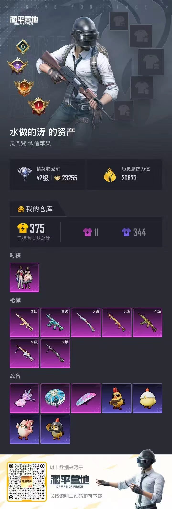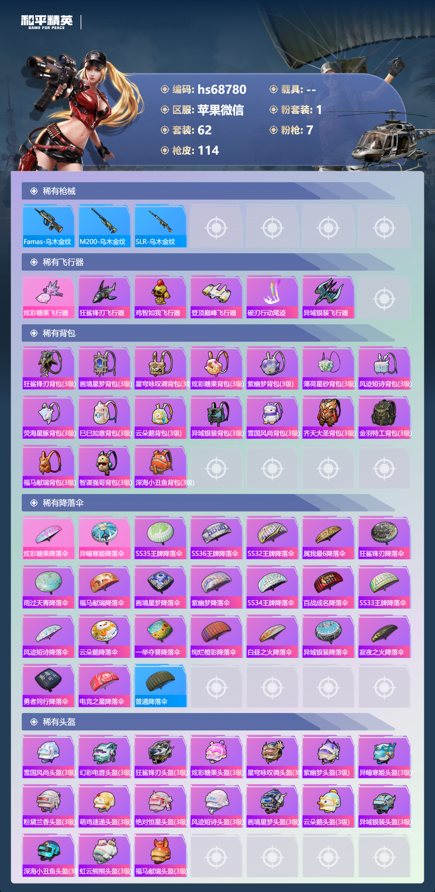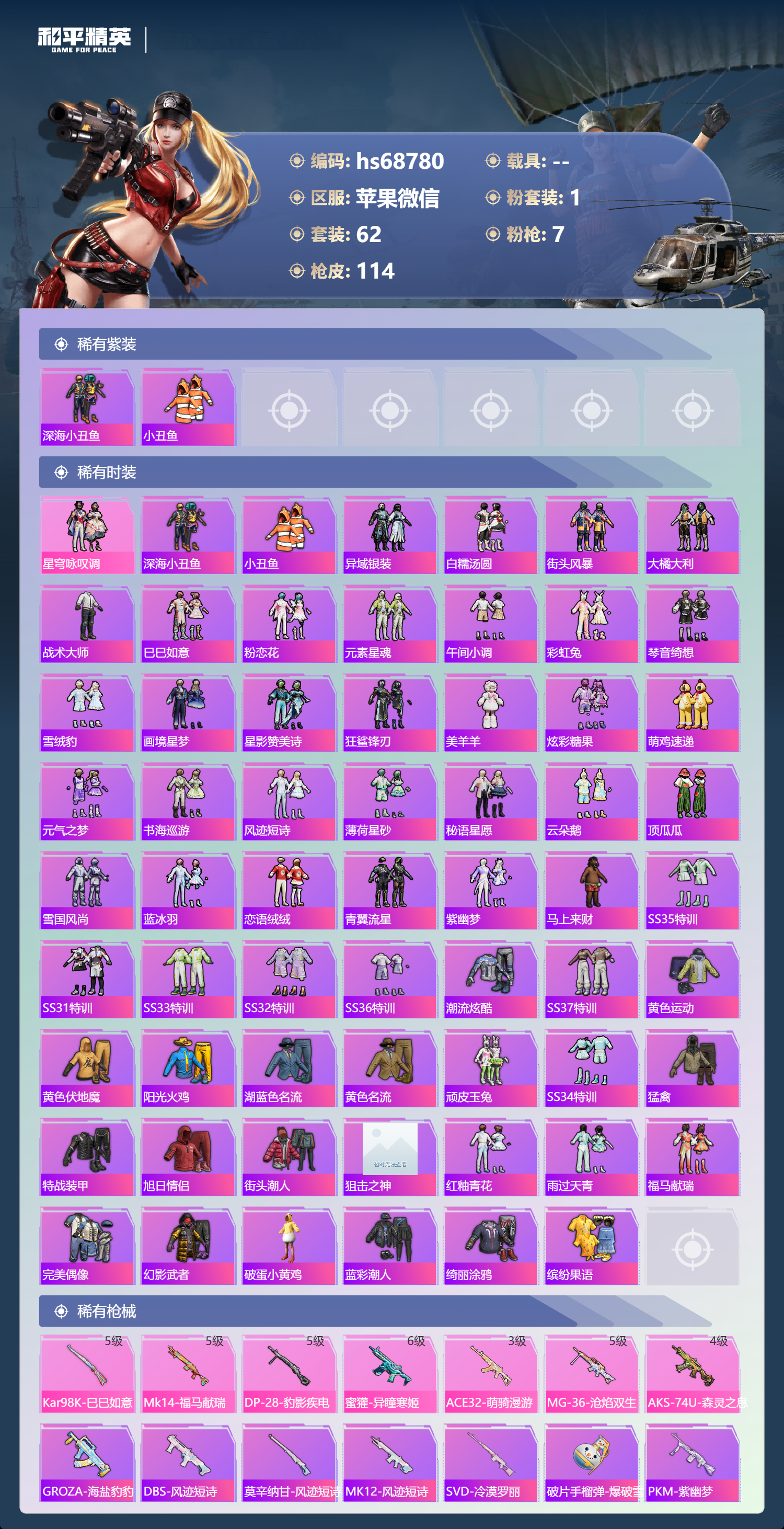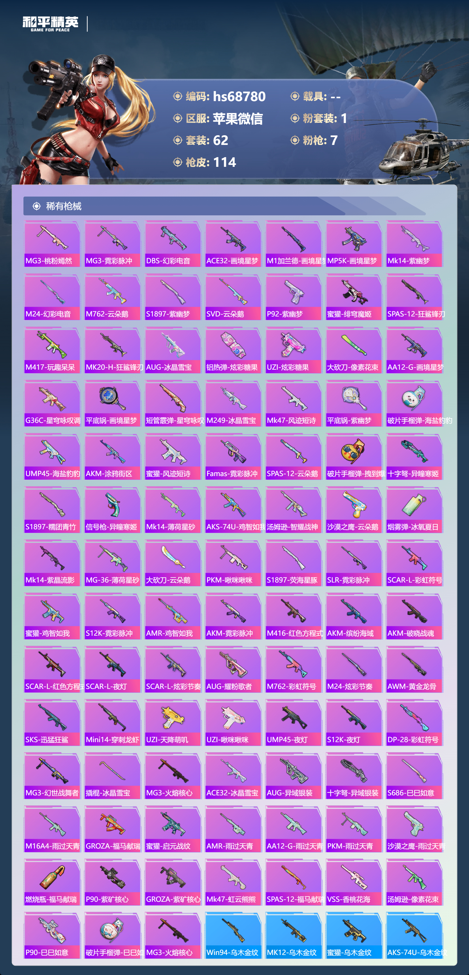 PX_2551715-,苹果微信-6王牌印记-1粉装-7特效枪-26873热力值-62套装-114枪皮-5卓越印记-3传奇印记