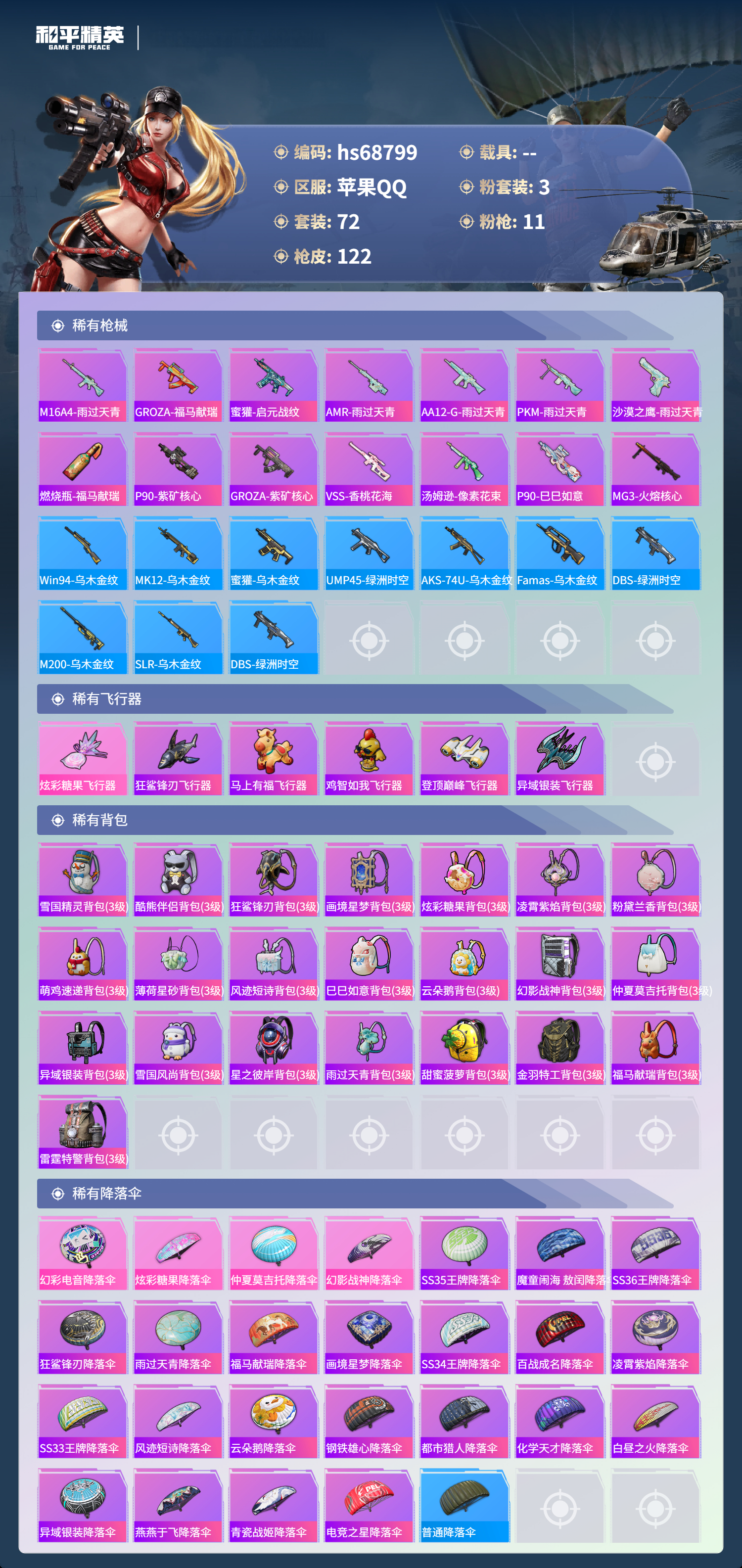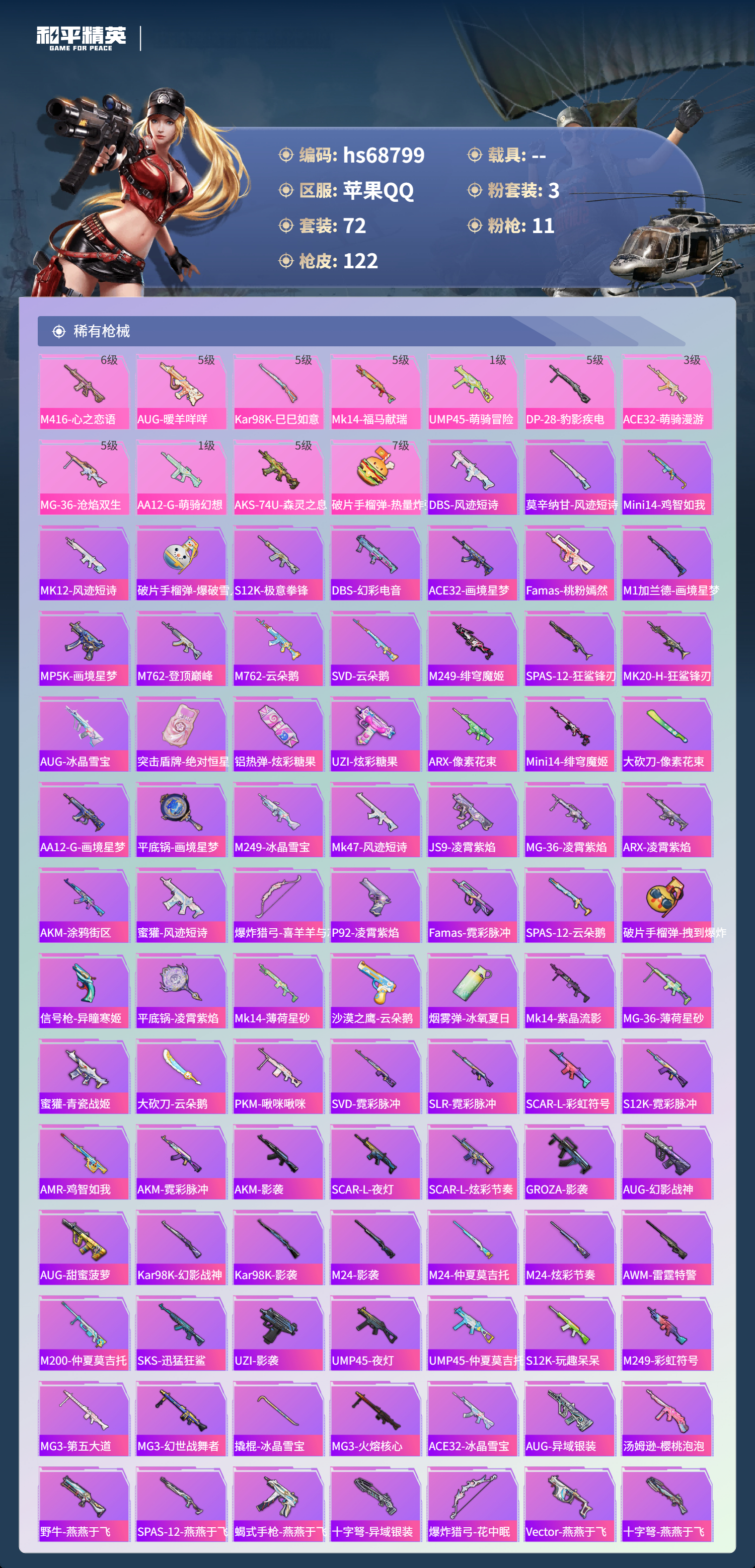 【122稀有枪械】M416-心之恋语/6级,AUG-暖羊咩咩/5级,Kar98K-巳巳如意/5级,Mk14-福马献瑞/5级,UMP45-萌骑冒险/1级,DP-28-豹影疾电/5级,ACE32-萌骑漫游/3级,MG-36-沧焰双生/5级,AA12-G-萌骑幻想/1级,AKS-74U-森灵之息/5级,破片手榴弹-热量炸弹/7级,DBS-风迹短诗,莫辛纳甘-风迹短诗,Mini14-鸡智如我,Win94-乌木金纹,MK12-风迹短诗,MK12-乌木金纹,破片手榴弹-爆破雪人,S12K-极意拳锋,DBS-幻彩电音,ACE32-画境星梦,Famas-桃粉嫣然,M1加兰德-画境星梦,MP5K-画境星梦,M762-登顶巅峰,蜜獾-乌木金纹,M762-云朵鹅,SVD-云朵鹅,M249-绯穹魔姬,SPAS-12-狂鲨锋刃,MK20-H-狂鲨锋刃,AUG-冰晶雪宝,突击盾牌-绝对恒星,铝热弹-炫彩糖果,UZI-炫彩糖果,UMP45-绿洲时空,ARX-像素花束,Mini14-绯穹魔姬,大砍刀-像素花束,AA12-G-画境星梦,平底锅-画境星梦,M249-冰晶雪宝,Mk47-风迹短诗,JS9-凌霄紫焰,MG-36-凌霄紫焰,ARX-凌霄紫焰,AKS-74U-乌木金纹,AKM-涂鸦街区,蜜獾-风迹短诗,爆炸猎弓-喜羊羊与灰太狼,P92-凌霄紫焰,Famas-乌木金纹,Famas-霓彩脉冲,SPAS-12-云朵鹅,破片手榴弹-拽到爆炸,信号枪-异瞳寒姬,平底锅-凌霄紫焰,Mk14-薄荷星砂,沙漠之鹰-云朵鹅,烟雾弹-冰氧夏日,Mk14-紫晶流影,MG-36-薄荷星砂,蜜獾-青瓷战姬,大砍刀-云朵鹅,PKM-啾咪啾咪,SVD-霓彩脉冲,SLR-霓彩脉冲,SCAR-L-彩虹符号,S12K-霓彩脉冲,AMR-鸡智如我,AKM-霓彩脉冲,AKM-影袭,SCAR-L-夜灯,SCAR-L-炫彩节奏,GROZA-影袭,AUG-幻影战神,AUG-甜蜜菠萝,Kar98K-幻影战神,Kar98K-影袭,M24-影袭,M24-仲夏莫吉托,M24-炫彩节奏,AWM-雷霆特警,M200-仲夏莫吉托,SKS-迅猛狂鲨,UZI-影袭,UMP45-夜灯,UMP45-仲夏莫吉托,S12K-玩趣呆呆,M249-彩虹符号,MG3-第五大道,MG3-幻世战舞者,撬棍-冰晶雪宝,DBS-绿洲时空,MG3-火熔核心,ACE32-冰晶雪宝,AUG-异域银装,汤姆逊-樱桃泡泡,野牛-燕燕于飞,M200-乌木金纹,SPAS-12-燕燕于飞,蝎式手枪-燕燕于飞,十字弩-异域银装,爆炸猎弓-花中眠,Vector-燕燕于飞,十字弩-燕燕于飞,M16A4-雨过天青,GROZA-福马献瑞,蜜獾-启元战纹,AMR-雨过天青,SLR-乌木金纹,AA12-G-雨过天青,PKM-雨过天青,沙漠之鹰-雨过天青,燃烧瓶-福马献瑞,P90-紫矿核心,GROZA-紫矿核心,VSS-香桃花海,汤姆逊-像素花束,P90-巳巳如意,DBS-绿洲时空,MG3-火熔核心