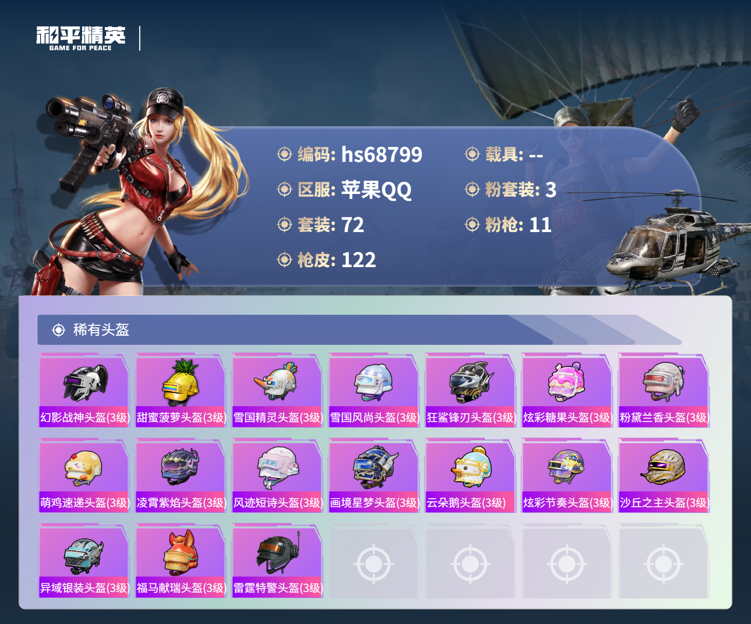 【17稀有头盔】幻影战神头盔(3级),甜蜜菠萝头盔(3级),雪国精灵头盔(3级),雪国风尚头盔(3级),狂鲨锋刃头盔(3级),炫彩糖果头盔(3级),粉黛兰香头盔(3级),萌鸡速递头盔(3级),凌霄紫焰头盔(3级),风迹短诗头盔(3级),画境星梦头盔(3级),云朵鹅头盔(3级),炫彩节奏头盔(3级),沙丘之主头盔(3级),异域银装头盔(3级),福马献瑞头盔(3级),雷霆特警头盔(3级)