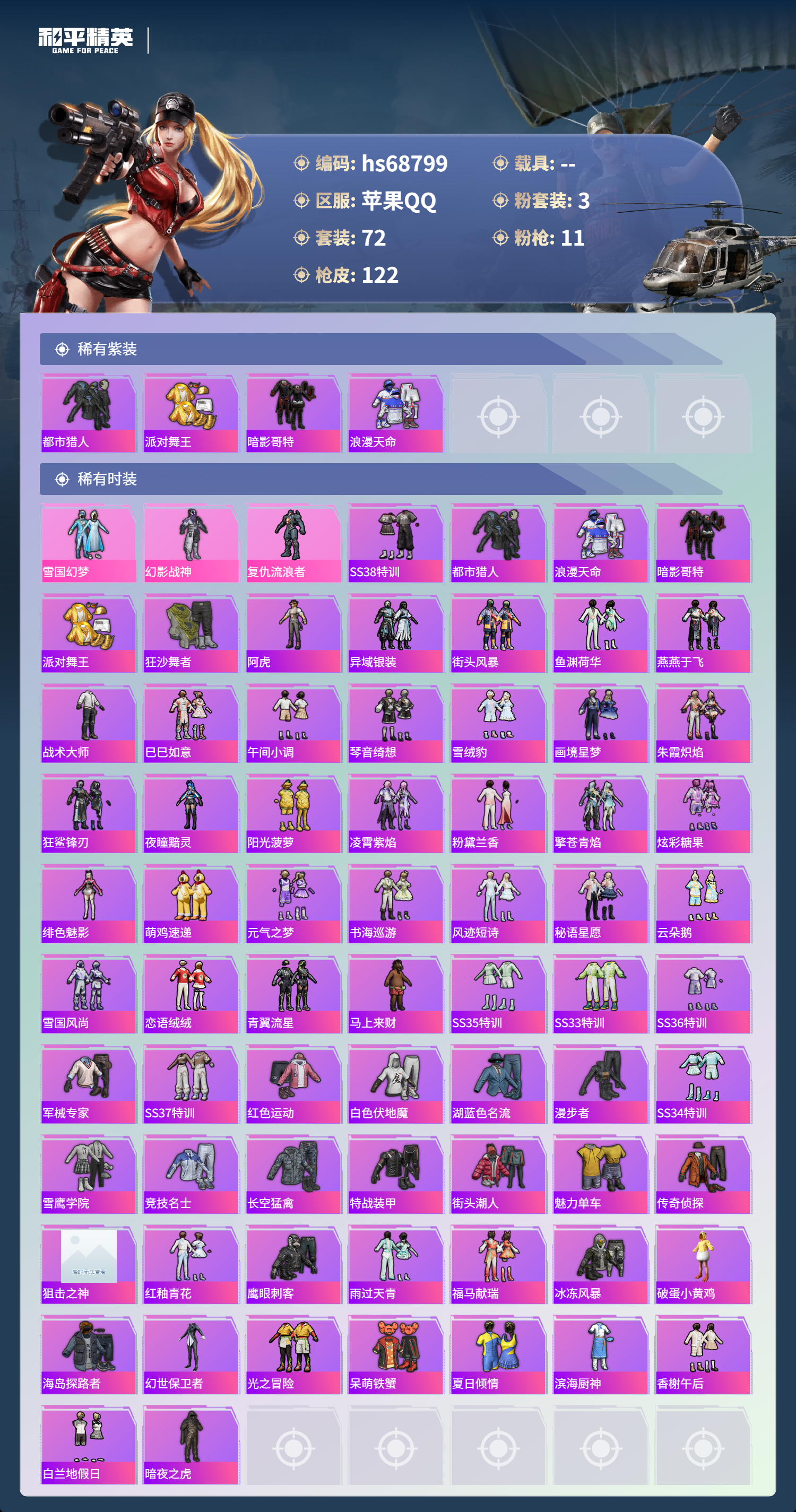 【72稀有时装】雪国幻梦,幻影战神,复仇流浪者,SS38特训,都市猎人,浪漫天命,暗影哥特,派对舞王,狂沙舞者,阿虎,异域银装,街头风暴,鱼渊荷华,燕燕于飞,战术大师,巳巳如意,午间小调,琴音绮想,雪绒豹,画境星梦,朱霞炽焰,狂鲨锋刃,夜瞳黯灵,阳光菠萝,凌霄紫焰,粉黛兰香,擎苍青焰,炫彩糖果,绯色魅影,萌鸡速递,元气之梦,书海巡游,风迹短诗,秘语星愿,云朵鹅,雪国风尚,恋语绒绒,青翼流星,马上来财,SS35特训,SS33特训,SS36特训,军械专家,SS37特训,红色运动,白色伏地魔,湖蓝色名流,漫步者,SS34特训,雪鹰学院,竞技名士,长空猛禽,特战装甲,街头潮人,魅力单车,传奇侦探,狙击之神,红釉青花,鹰眼刺客,雨过天青,福马献瑞,冰冻风暴,破蛋小黄鸡,海岛探路者,幻世保卫者,光之冒险,呆萌铁蟹,夏日倾情,滨海厨神,香榭午后,白兰地假日,暗夜之虎