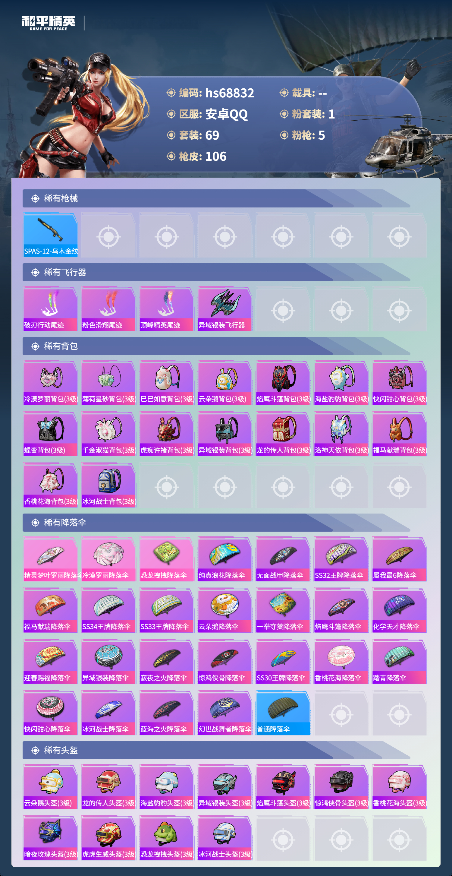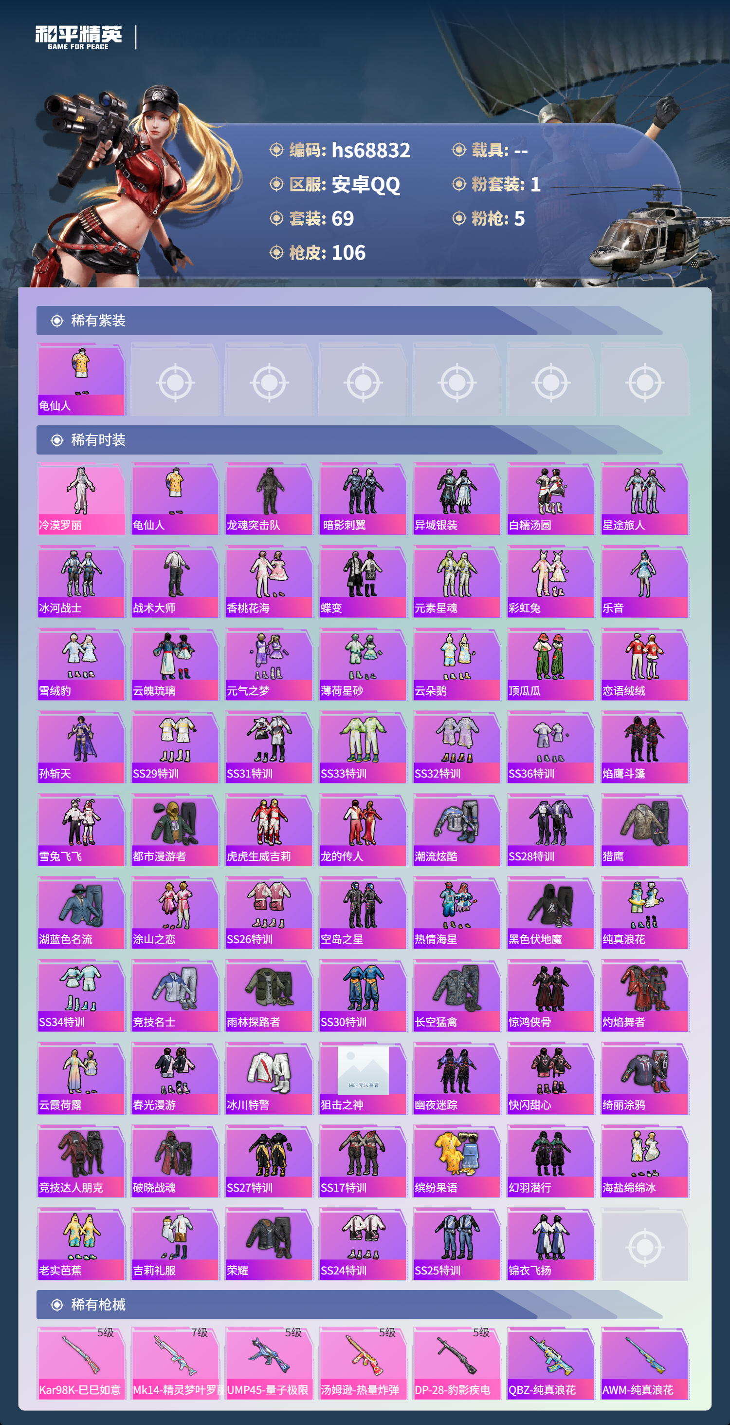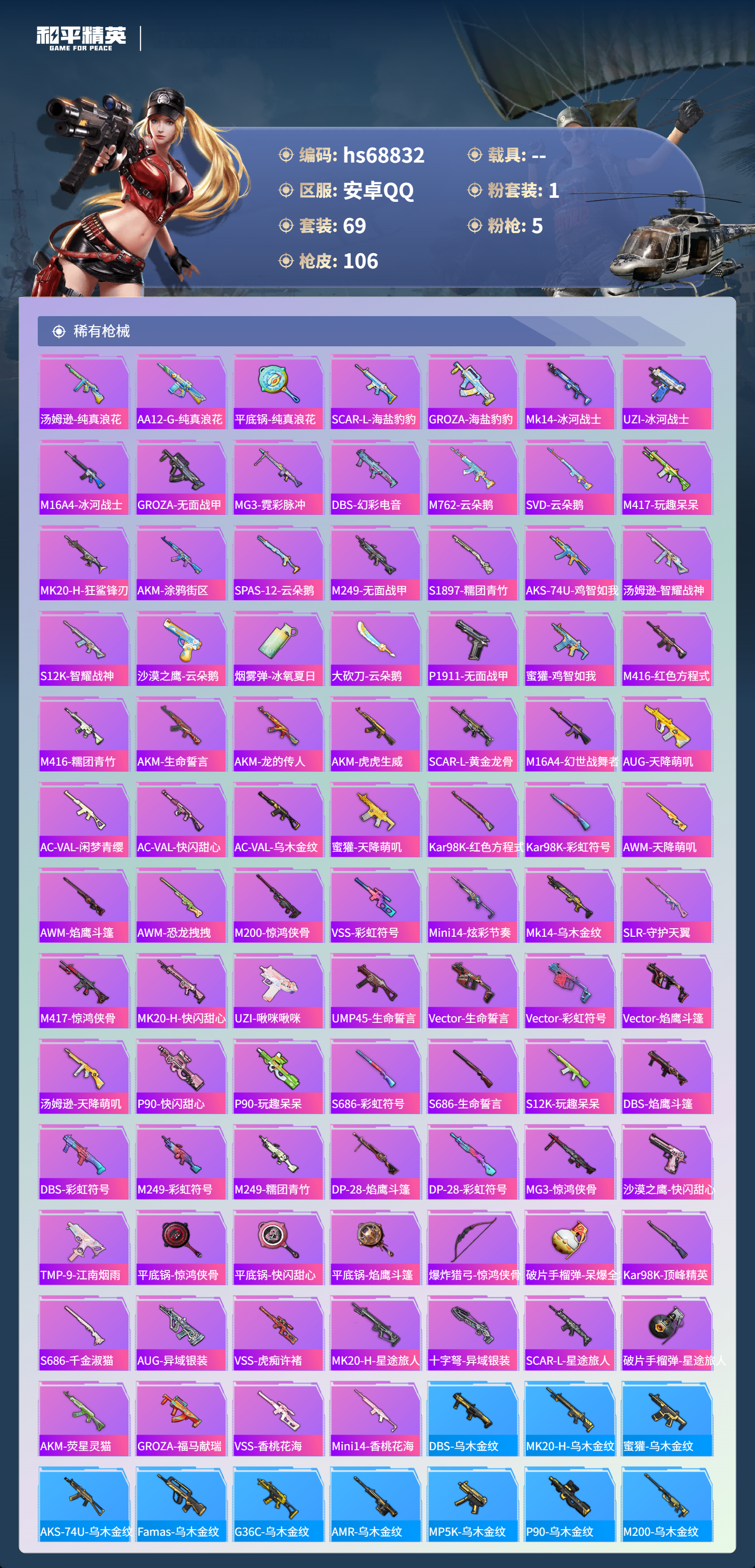 【106稀有枪械】Kar98K-巳巳如意/5级,Mk14-精灵梦叶罗丽/7级,UMP45-量子极限/5级,汤姆逊-热量炸弹/5级,DP-28-豹影疾电/5级,QBZ-纯真浪花,AWM-纯真浪花,汤姆逊-纯真浪花,DBS-乌木金纹,AA12-G-纯真浪花,平底锅-纯真浪花,SCAR-L-海盐豹豹,GROZA-海盐豹豹,Mk14-冰河战士,UZI-冰河战士,M16A4-冰河战士,MK20-H-乌木金纹,GROZA-无面战甲,MG3-霓彩脉冲,DBS-幻彩电音,蜜獾-乌木金纹,M762-云朵鹅,SVD-云朵鹅,M417-玩趣呆呆,MK20-H-狂鲨锋刃,AKS-74U-乌木金纹,AKM-涂鸦街区,Famas-乌木金纹,SPAS-12-云朵鹅,M249-无面战甲,S1897-糯团青竹,AKS-74U-鸡智如我,汤姆逊-智耀战神,S12K-智耀战神,沙漠之鹰-云朵鹅,烟雾弹-冰氧夏日,大砍刀-云朵鹅,P1911-无面战甲,蜜獾-鸡智如我,M416-红色方程式,M416-糯团青竹,AKM-生命誓言,AKM-龙的传人,AKM-虎虎生威,SCAR-L-黄金龙骨,M16A4-幻世战舞者,AUG-天降萌叽,G36C-乌木金纹,AC-VAL-闲梦青缨,AC-VAL-快闪甜心,AC-VAL-乌木金纹,蜜獾-天降萌叽,Kar98K-红色方程式,Kar98K-彩虹符号,AWM-天降萌叽,AWM-焰鹰斗篷,AWM-恐龙拽拽,AMR-乌木金纹,M200-惊鸿侠骨,VSS-彩虹符号,Mini14-炫彩节奏,Mk14-乌木金纹,SLR-守护天翼,M417-惊鸿侠骨,MK20-H-快闪甜心,UZI-啾咪啾咪,UMP45-生命誓言,Vector-生命誓言,Vector-彩虹符号,Vector-焰鹰斗篷,汤姆逊-天降萌叽,MP5K-乌木金纹,P90-乌木金纹,P90-快闪甜心,P90-玩趣呆呆,S686-彩虹符号,S686-生命誓言,S12K-玩趣呆呆,DBS-焰鹰斗篷,DBS-彩虹符号,M249-彩虹符号,M249-糯团青竹,DP-28-焰鹰斗篷,DP-28-彩虹符号,MG3-惊鸿侠骨,沙漠之鹰-快闪甜心,TMP-9-江南烟雨,平底锅-惊鸿侠骨,平底锅-快闪甜心,平底锅-焰鹰斗篷,爆炸猎弓-惊鸿侠骨,破片手榴弹-呆爆全场,Kar98K-顶峰精英,S686-千金淑猫,AUG-异域银装,VSS-虎痴许褚,MK20-H-星途旅人,M200-乌木金纹,十字弩-异域银装,SCAR-L-星途旅人,SPAS-12-乌木金纹,破片手榴弹-星途旅人,AKM-荧星灵猫,GROZA-福马献瑞,VSS-香桃花海,Mini14-香桃花海