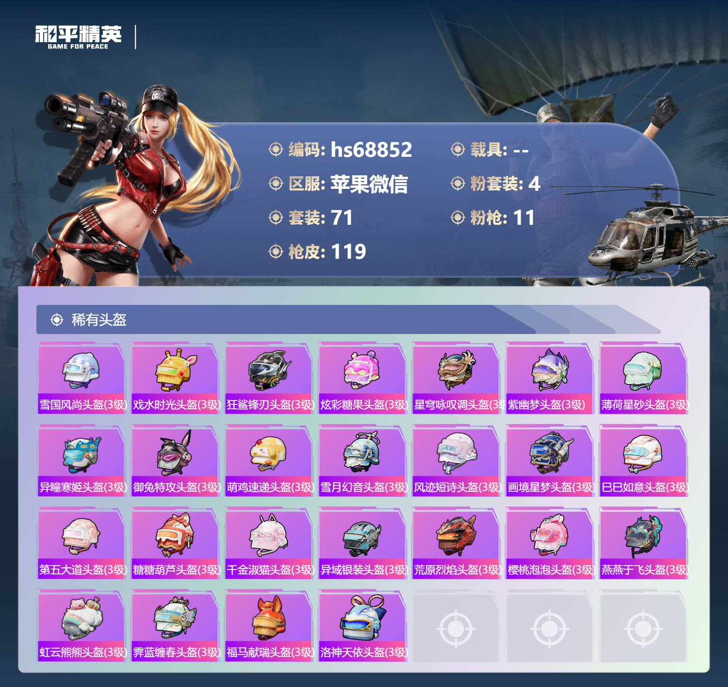 【25稀有头盔】雪国风尚头盔(3级),戏水时光头盔(3级),狂鲨锋刃头盔(3级),炫彩糖果头盔(3级),星穹咏叹调头盔(3级),紫幽梦头盔(3级),薄荷星砂头盔(3级),异瞳寒姬头盔(3级),御兔特攻头盔(3级),萌鸡速递头盔(3级),雪月幻音头盔(3级),风迹短诗头盔(3级),画境星梦头盔(3级),巳巳如意头盔(3级),第五大道头盔(3级),糖糖葫芦头盔(3级),千金淑猫头盔(3级),异域银装头盔(3级),荒原烈焰头盔(3级),樱桃泡泡头盔(3级),燕燕于飞头盔(3级),虹云熊熊头盔(3级),霁蓝缠春头盔(3级),福马献瑞头盔(3级),洛神天依头盔(3级)