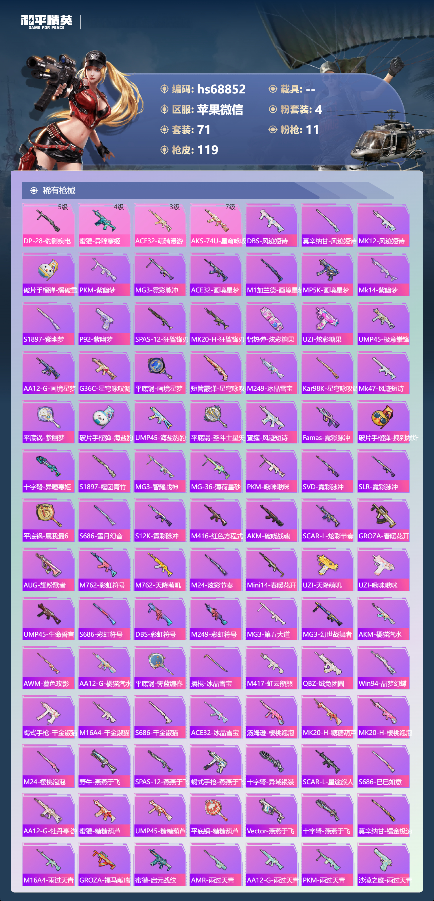 【118稀有枪械】GROZA-镜光银凌/5级,AUG-暖羊咩咩/5级,Kar98K-巳巳如意/5级,AMR-智耀战神/4级,Mk14-福马献瑞/1级,Mk14-樱桃泡泡/5级,DP-28-千金淑猫/5级,DP-28-豹影疾电/5级,蜜獾-异瞳寒姬/4级,ACE32-萌骑漫游/3级,AKS-74U-星穹咏叹调/7级,DBS-风迹短诗,莫辛纳甘-风迹短诗,Win94-乌木金纹,MK12-风迹短诗,MK12-乌木金纹,破片手榴弹-爆破雪人,PKM-紫幽梦,MG3-霓彩脉冲,ACE32-画境星梦,M1加兰德-画境星梦,MP5K-画境星梦,Mk14-紫幽梦,蜜獾-乌木金纹,S1897-紫幽梦,P92-紫幽梦,SPAS-12-狂鲨锋刃,MK20-H-狂鲨锋刃,铝热弹-炫彩糖果,UZI-炫彩糖果,UMP45-极意拳锋,AA12-G-画境星梦,G36C-星穹咏叹调,平底锅-画境星梦,短管霰弹-星穹咏叹调,M249-冰晶雪宝,Kar98K-星穹咏叹调,Mk47-风迹短诗,平底锅-紫幽梦,破片手榴弹-海盐豹豹,UMP45-海盐豹豹,AKS-74U-乌木金纹,平底锅-圣斗士星矢,蜜獾-风迹短诗,Famas-乌木金纹,Famas-霓彩脉冲,破片手榴弹-拽到爆炸,十字弩-异瞳寒姬,S1897-糯团青竹,MG3-智耀战神,MG-36-薄荷星砂,PKM-啾咪啾咪,SVD-霓彩脉冲,SLR-霓彩脉冲,平底锅-属我最6,S686-雪月幻音,S12K-霓彩脉冲,M416-红色方程式,AKM-破晓战魂,SCAR-L-炫彩节奏,GROZA-春暖花开,AUG-耀粉歌者,M762-彩虹符号,M762-天降萌叽,M24-炫彩节奏,Mini14-春暖花开,UZI-天降萌叽,UZI-啾咪啾咪,UMP45-生命誓言,S686-彩虹符号,DBS-彩虹符号,M249-彩虹符号,MG3-第五大道,MG3-幻世战舞者,AKM-橘猫汽水,AWM-暮色玫影,AA12-G-橘猫汽水,平底锅-霁蓝缠春,撬棍-冰晶雪宝,M417-虹云熊熊,QBZ-绒兔团圆,Win94-晶梦幻蝶,蝎式手枪-千金淑猫,M16A4-千金淑猫,S686-千金淑猫,ACE32-冰晶雪宝,汤姆逊-樱桃泡泡,MK20-H-糖糖葫芦,MK20-H-樱桃泡泡,M24-樱桃泡泡,野牛-燕燕于飞,M200-乌木金纹,SPAS-12-燕燕于飞,蝎式手枪-燕燕于飞,十字弩-异域银装,SCAR-L-星途旅人,S686-巳巳如意,AA12-G-牡丹亭·游园,蜜獾-糖糖葫芦,UMP45-糖糖葫芦,SPAS-12-乌木金纹,平底锅-糖糖葫芦,Vector-燕燕于飞,十字弩-燕燕于飞,莫辛纳甘-镭金极速,M16A4-雨过天青,GROZA-福马献瑞,蜜獾-启元战纹,AMR-雨过天青,SLR-乌木金纹,AA12-G-雨过天青,PKM-雨过天青,沙漠之鹰-雨过天青,燃烧瓶-福马献瑞,P18C-糖糖葫芦,P90-巳巳如意,破片手榴弹-巳巳如意,S686-英伦信使