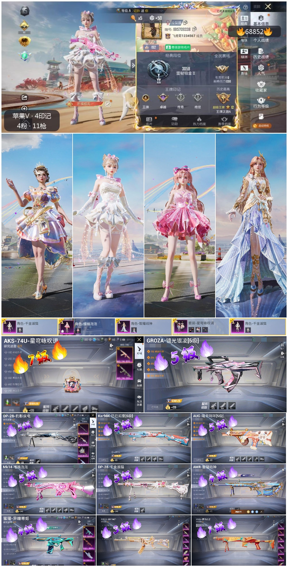 【11特效枪】GROZA-镜光银凌/5级,Mk14-福马献瑞/1级,AUG-暖羊咩咩/5级,AKS-74U-星穹咏叹调/7级,蜜獾-异瞳寒姬/4级,DP-28-豹影疾电/5级,Mk14-樱桃泡泡/5级,ACE32-萌骑漫游/3级,Kar98K-巳巳如意/5级,DP-28-千金淑猫/5级,AMR-智耀战神/4级