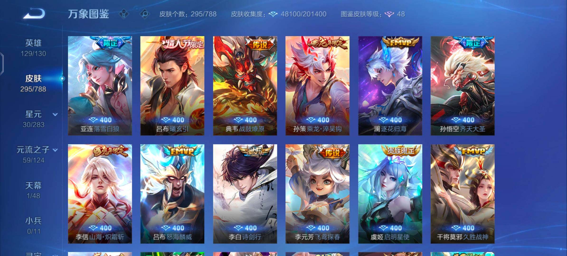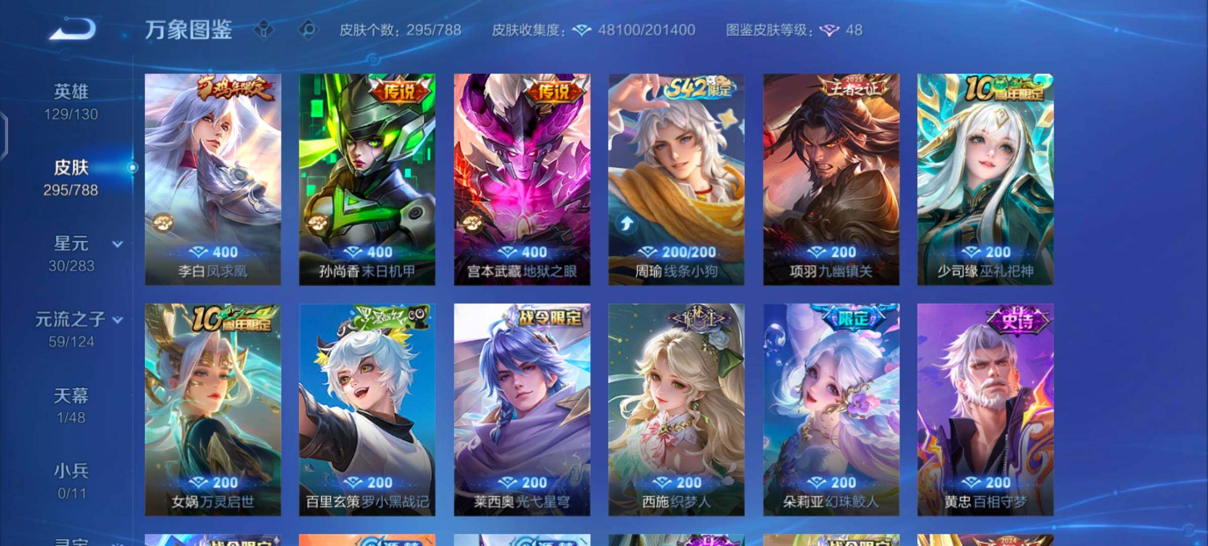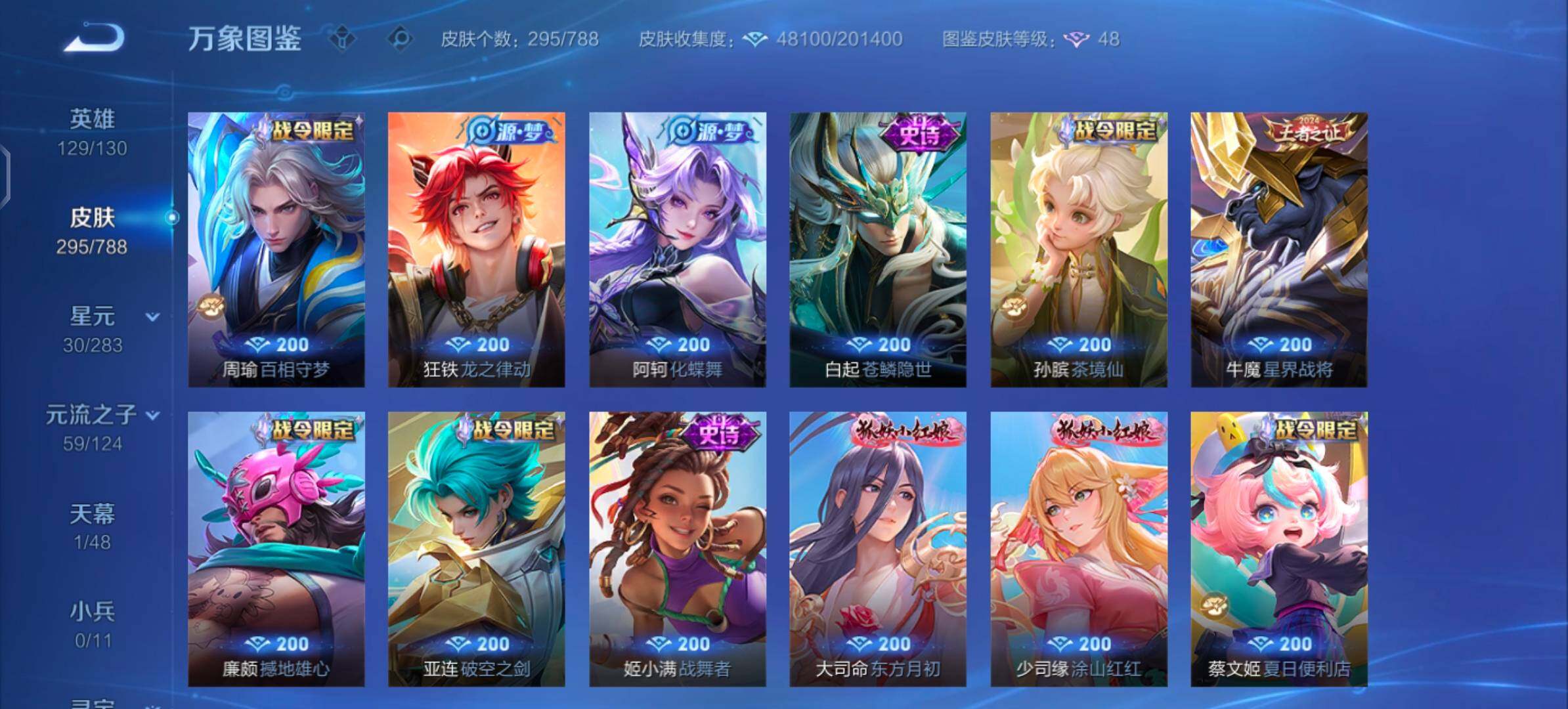【史诗皮肤】:周瑜线条小狗,项羽九幽镇关,少司缘巫礼祀神,女娲万灵启世,百里玄策罗小黑战记,莱西奥光弋星穹,西施织梦人,朵莉亚幻珠鲛人,黄忠百相守梦,周瑜百相守梦,狂铁龙之律动,阿轲化蝶舞,白起苍鳞隐世,孙膑茶境仙,牛魔星界战将,亚连破空之剑,廉颇撼地雄心,姬小满战舞者,大司命东方月初,少司缘涂山红红,蔡文姬夏日便利店,黄忠怒海争锋,镜青焰无极,鲁班七号蔬乡物语,伽罗琥珀纪元,蒙恬荣光圣徽,高渐离燃音魔法,妲己灵卜魔法,蒙犽百解令,阿古朵江河有灵,司空震地狱燃心,李元芳匿光侦查者,戈娅驭风魔法,刘禅电玩爆裂旋风,扁鹊奇幻香踪,马可波罗山海玄木吟,暃星界游侠,梦奇顽趣,鬼谷子五谷丰年,貂蝉唤灵魅影,赵云百木心枪,嫦娥拒霜思,司马懿暗渊魔法,米莱狄胡桃异想国,云中君纤云弄巧,百里玄策原初追逐者,马可波罗暗影游猎,孙尚香时之恋人,橘右京修罗,娜可露露晚萤,上官婉儿梁祝,狄仁杰鹰眼统帅,典韦蓝屏警告,大乔猫狗日记,阿轲节奏热浪,白起星夜王子,程咬金功夫厨神,李元芳逐浪之夏,刘禅天才门将,铠曙光守护者,百里守约特工魅影,安琪拉心灵骇客,雅典娜冰冠公主,兰陵王暗隐猎兽者,夏侯惇乘风破浪,刘邦德古拉伯爵,花木兰水晶猎龙者,张飞乱世虎臣,吕布末日机甲,曹操幽灵船长,刘禅绅士熊喵,吕布圣诞狂欢,墨子金属风暴,墨子龙骑士,妲己女仆咖啡,妲己魅力维加斯,嬴政摇滚巨星,孙尚香水果甜心,孙尚香蔷薇恋人,宫本武藏鬼剑武藏,廉颇地狱岩魂,狄仁杰魔术师,甄姬冰雪圆舞曲,貂蝉圣诞恋歌,赵云未来纪元,赵云皇家上将,露娜紫霞仙子