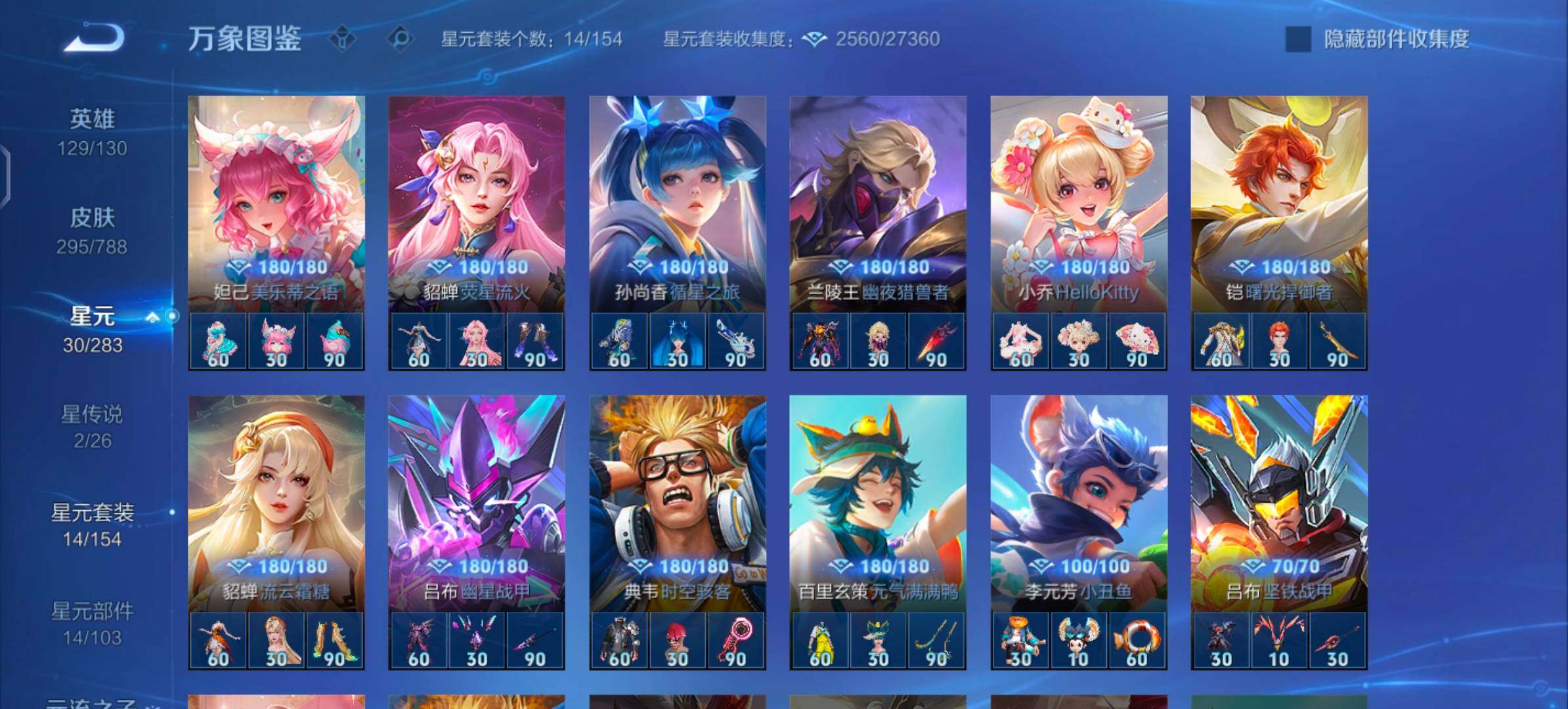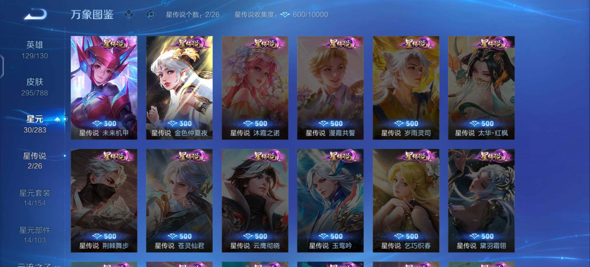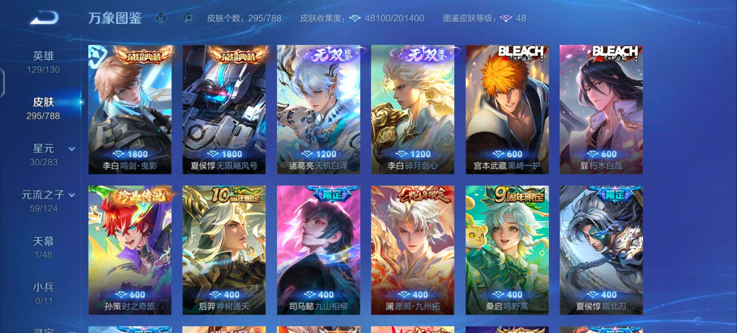 【史诗皮肤】:周瑜线条小狗,项羽九幽镇关,少司缘巫礼祀神,女娲万灵启世,百里玄策罗小黑战记,莱西奥光弋星穹,西施织梦人,朵莉亚幻珠鲛人,黄忠百相守梦,周瑜百相守梦,狂铁龙之律动,阿轲化蝶舞,白起苍鳞隐世,孙膑茶境仙,牛魔星界战将,亚连破空之剑,廉颇撼地雄心,姬小满战舞者,大司命东方月初,少司缘涂山红红,蔡文姬夏日便利店,黄忠怒海争锋,镜青焰无极,鲁班七号蔬乡物语,伽罗琥珀纪元,蒙恬荣光圣徽,高渐离燃音魔法,妲己灵卜魔法,蒙犽百解令,阿古朵江河有灵,司空震地狱燃心,李元芳匿光侦查者,戈娅驭风魔法,刘禅电玩爆裂旋风,扁鹊奇幻香踪,马可波罗山海玄木吟,暃星界游侠,梦奇顽趣,鬼谷子五谷丰年,貂蝉唤灵魅影,赵云百木心枪,嫦娥拒霜思,司马懿暗渊魔法,米莱狄胡桃异想国,云中君纤云弄巧,百里玄策原初追逐者,马可波罗暗影游猎,孙尚香时之恋人,橘右京修罗,娜可露露晚萤,上官婉儿梁祝,狄仁杰鹰眼统帅,典韦蓝屏警告,大乔猫狗日记,阿轲节奏热浪,白起星夜王子,程咬金功夫厨神,李元芳逐浪之夏,刘禅天才门将,铠曙光守护者,百里守约特工魅影,安琪拉心灵骇客,雅典娜冰冠公主,兰陵王暗隐猎兽者,夏侯惇乘风破浪,刘邦德古拉伯爵,花木兰水晶猎龙者,张飞乱世虎臣,吕布末日机甲,曹操幽灵船长,刘禅绅士熊喵,吕布圣诞狂欢,墨子金属风暴,墨子龙骑士,妲己女仆咖啡,妲己魅力维加斯,嬴政摇滚巨星,孙尚香水果甜心,孙尚香蔷薇恋人,宫本武藏鬼剑武藏,廉颇地狱岩魂,狄仁杰魔术师,甄姬冰雪圆舞曲,貂蝉圣诞恋歌,赵云未来纪元,赵云皇家上将,露娜紫霞仙子