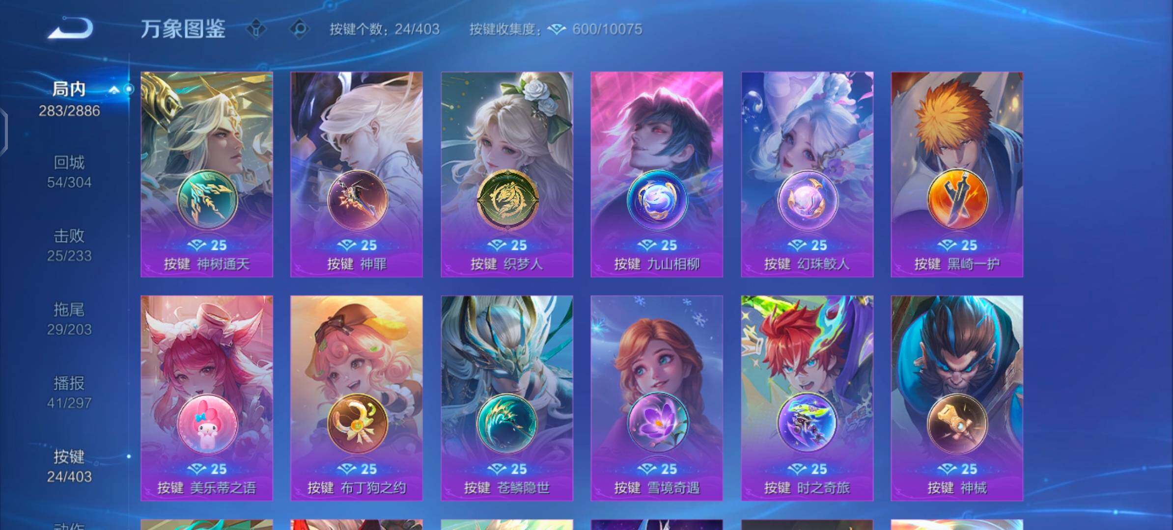 【其他皮肤】:影百相守梦,桑启线条小狗,虞姬溯影追猎,艾琳鹤鸣心笺,孙权径山谋武,明世隐往忆晖光,亚瑟荣光之誓,哪吒罗小黑战记,鬼谷子克喵,莱西奥踏浪烽翎,空空儿戏梦巡演,庄周锦麟游梦,孙策百相守梦,甄姬逆浪荇歌,白起死霸装,姬小满小满鸭,露娜命运加冕,阿古朵布丁狗之约,张良灵野札记,苏烈春野闲踪,钟馗虚灵犬护,戈娅玫蓝誓约,姜子牙星梦巡礼,西施雪境奇遇,马超访茗客,典韦铁骨偃魂,太乙真人谧流熔炉,苍苍林狼骑,干将莫邪雾都夜雨,东皇太一噬灭天穹,盘古敬我三分,孙悟空神迹守卫,虞姬夏日便利店,姜子牙天穹之誓,貂蝉长夏之忆,杨戬破阵退雄兵,大司命暗都幽影,项羽苍威无极,程咬金群星魔术团,刘邦剑破天穹,李元芳蔬乡物语,钟无艳春野之旅,沈梦溪龙舞盛年,亚瑟鸿运当头,廉颇功夫炙烤,嫦娥漠中幻影,海诺时空谍影,妲己灵卜魔法,鬼谷子天穹祈灯,后羿完美运算,曹操决胜大满贯,亚连破局者,钟无艳聚星闪耀,张良古海寻踪,艾琳流音漫舞,哪吒热血海滩,李元芳妄想特派,姬小满零食大作战,西施玲珑珍味,鲁班大师探海日志,太乙真人劲辣红锅,杨戬潮玩骑兵,裴擒虎擒涛扼浪,赵怀真太极少年,猪八戒潮玩探月行,海月幻泉雾影,嫦娥暖冬兔眠,桑启海盐诗旅,戈娅危途狂花,李元芳云中旅人,蒙恬蔚蓝守将,沈梦溪大漠名商,米莱狄契约魔法,刘禅唤灵魔甲,兰陵王金庭之子,程咬金无双福将,达摩沙漠行僧,典韦铁甲之心,鲁班大师乓乓大师,张良缤纷绘卷,刘禅秘密基地,亚瑟潮玩骑士王,狂铁特工战影,盾山圆桌骑士,哪吒次元突破,姜子牙炽热元素使,沈梦溪鲨炮海盗猫,孙膑归虚梦演,吕布野性能量,小乔丁香结,明世隐虹云星官,鬼谷子幻乐之宴,诸葛亮掌控之力,老夫子功夫老勺,狂铁命运角斗场,钟无艳海滩丽影,关羽龙腾万里,刘备汉昭烈帝,刘备纽约教父,狄仁杰阴阳师,宫本武藏万象初新,刘备万事如意,甄姬花好人间,张飞五福同心,花木兰兔女郎,达摩拳王,亚瑟死亡骑士,典韦黄金武士,妲己少女阿狸,孙膑天使之翼,安琪拉玩偶对对碰,宫本武藏未来纪元,扁鹊救世之瞳,牛魔西部大镖客,白起白色死神,艾琳女武神,芈月红桃皇后,赵云忍炎影,赵云白执事,阿轲爱心护理,露娜哥特玫瑰,韩信街头霸王,韩信教廷特使,项羽海滩派对,桑启画中游,暃碧珀绯影,金蝉前尘,云缨赤焰之缨,司空震启蛰,澜孤猎,蒙恬秩序猎龙将,西施归虚梦演,马超幸存者,曜归虚梦演,云中君荷鲁斯之眼,瑶森,猪八戒年年有余,嫦娥露花倒影,上官婉儿修竹墨客,李信灼热之刃,沈梦溪棒球奇才,伽罗花见巫女,司马懿魇语军师,孙策海之征途,元歌午夜歌剧院,米莱狄精准探案法,弈星踏雪寻梅,裴擒虎街头旋风,杨玉环霓裳曲,公孙离花间舞,女娲尼罗河女神,梦奇美梦成真,苏烈爱与和平,百里玄策威尼斯狂欢,百里守约绝影神枪,铠龙域领主,鬼谷子阿摩司公爵,干将莫邪第七人偶,东皇太一东海龙王,黄忠芝加哥教父,诸葛亮星航指挥官,杨戬埃及法老,苍维京掠夺者,马可波罗激情绿茵,夏侯惇战争骑士,蔡文姬蔷薇王座,关羽天启骑士,李元芳特种部队,李白范海辛,兰陵王隐刃,刘禅英喵野望,后羿精灵王,周瑜海军大将,孙悟空西部大镖客,小乔万圣前夜,王昭君精灵公主,老夫子潮流仙人,貂蝉异域舞娘,钟无艳生化警戒,项羽帝国元帅,高渐离金属狂潮,鲁班七号福禄兄弟