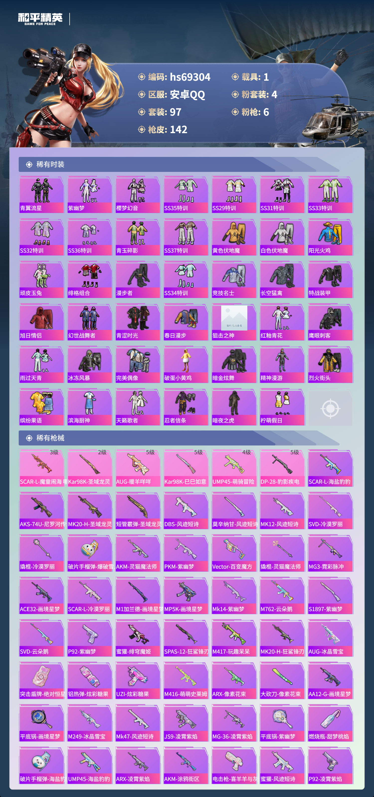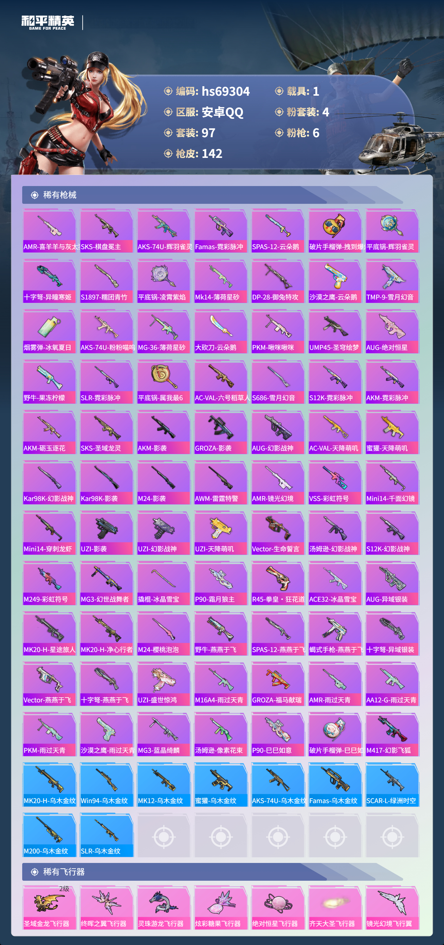 【142稀有枪械】SCAR-L-魔童闹海,哪吒/3级,Kar98K-圣域龙灵/2级,AUG-暖羊咩咩/5级,Kar98K-巳巳如意/5级,UMP45-萌骑冒险/4级,DP-28-豹影疾电/5级,SCAR-L-海盐豹豹,AKS-74U-尼罗河传说,MK20-H-乌木金纹,MK20-H-圣域龙灵,短管霰弹-圣域龙灵,DBS-风迹短诗,莫辛纳甘-风迹短诗,Win94-乌木金纹,MK12-风迹短诗,MK12-乌木金纹,SVD-冷漠罗丽,撬棍-冷漠罗丽,破片手榴弹-爆破雪人,AKM-灵猫魔法师,PKM-紫幽梦,Vector-百变魔方,撬棍-灵猫魔法师,MG3-霓彩脉冲,ACE32-画境星梦,SCAR-L-冷漠罗丽,M1加兰德-画境星梦,MP5K-画境星梦,Mk14-紫幽梦,蜜獾-乌木金纹,M762-云朵鹅,S1897-紫幽梦,SVD-云朵鹅,P92-紫幽梦,蜜獾-绯穹魔姬,SPAS-12-狂鲨锋刃,M417-玩趣呆呆,MK20-H-狂鲨锋刃,AUG-冰晶雪宝,突击盾牌-绝对恒星,铝热弹-炫彩糖果,UZI-炫彩糖果,M416-萌萌史莱姆,ARX-像素花束,大砍刀-像素花束,AA12-G-画境星梦,平底锅-画境星梦,M249-冰晶雪宝,Mk47-风迹短诗,JS9-凌霄紫焰,MG-36-凌霄紫焰,平底锅-紫幽梦,燃烧瓶-甜梦桃焰,破片手榴弹-海盐豹豹,UMP45-海盐豹豹,ARX-凌霄紫焰,AKS-74U-乌木金纹,AKM-涂鸦街区,电击枪-喜羊羊与灰太狼,蜜獾-风迹短诗,P92-凌霄紫焰,AMR-喜羊羊与灰太狼,SKS-棋盘冕主,AKS-74U-辉羽雀灵,Famas-乌木金纹,Famas-霓彩脉冲,SPAS-12-云朵鹅,破片手榴弹-拽到爆炸,平底锅-辉羽雀灵,十字弩-异瞳寒姬,S1897-糯团青竹,平底锅-凌霄紫焰,Mk14-薄荷星砂,DP-28-御兔特攻,沙漠之鹰-云朵鹅,TMP-9-雪月幻音,烟雾弹-冰氧夏日,AKS-74U-粉粉喵呜,MG-36-薄荷星砂,SCAR-L-绿洲时空,大砍刀-云朵鹅,PKM-啾咪啾咪,UMP45-圣穹绘梦,AUG-绝对恒星,野牛-果冻柠檬,SLR-霓彩脉冲,平底锅-属我最6,AC-VAL-六号稻草人,S686-雪月幻音,S12K-霓彩脉冲,AKM-霓彩脉冲,AKM-砺玉逐花,SKS-圣域龙灵,AKM-影袭,GROZA-影袭,AUG-幻影战神,AC-VAL-天降萌叽,蜜獾-天降萌叽,Kar98K-幻影战神,Kar98K-影袭,M24-影袭,AWM-雷霆特警,AMR-镜光幻境,VSS-彩虹符号,Mini14-千面幻镜,Mini14-穿刺龙虾,UZI-影袭,UZI-幻影战神,UZI-天降萌叽,Vector-生命誓言,汤姆逊-幻影战神,S12K-幻影战神,M249-彩虹符号,MG3-幻世战舞者,撬棍-冰晶雪宝,P90-霜月狼主,R45-拳皇·狂花道,ACE32-冰晶雪宝,AUG-异域银装,MK20-H-星途旅人,MK20-H-净心行者,M24-樱桃泡泡,野牛-燕燕于飞,M200-乌木金纹,SPAS-12-燕燕于飞,蝎式手枪-燕燕于飞,十字弩-异域银装,Vector-燕燕于飞,十字弩-燕燕于飞,UZI-盛世惊鸿,M16A4-雨过天青,GROZA-福马献瑞,AMR-雨过天青,SLR-乌木金纹,AA12-G-雨过天青,PKM-雨过天青,沙漠之鹰-雨过天青,MG3-蓝晶绮麟,汤姆逊-像素花束,P90-巳巳如意,破片手榴弹-巳巳如意,M417-幻影飞狐
