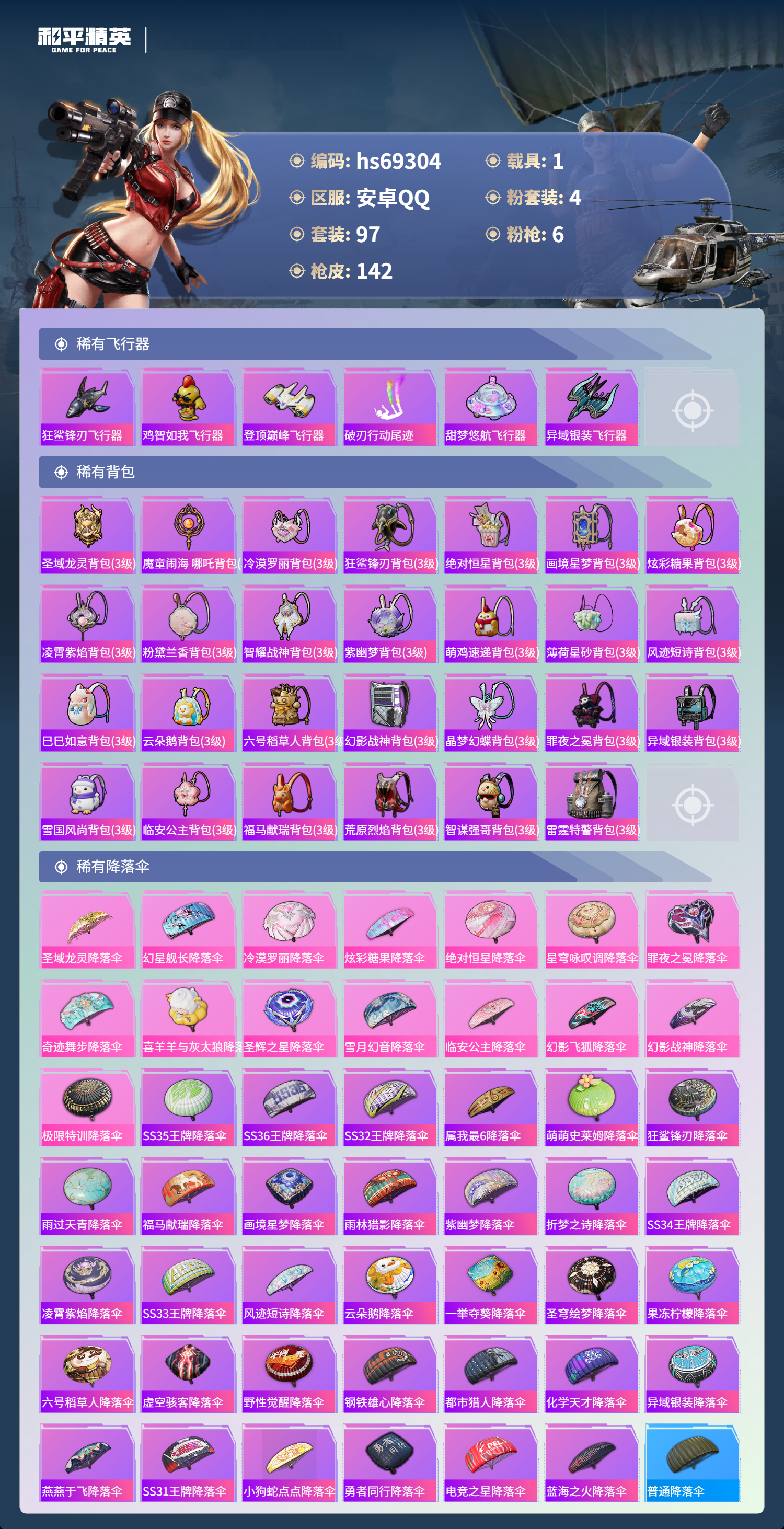【49稀有降落伞】SS35王牌降落伞,圣域龙灵降落伞,SS36王牌降落伞,幻星舰长降落伞,冷漠罗丽降落伞,SS32王牌降落伞,属我最6降落伞,炫彩糖果降落伞,萌萌史莱姆降落伞,绝对恒星降落伞,狂鲨锋刃降落伞,星穹咏叹调降落伞,雨过天青降落伞,福马献瑞降落伞,罪夜之冕降落伞,画境星梦降落伞,奇迹舞步降落伞,雨林猎影降落伞,紫幽梦降落伞,折梦之诗降落伞,SS34王牌降落伞,喜羊羊与灰太狼降落伞,凌霄紫焰降落伞,SS33王牌降落伞,圣辉之星降落伞,风迹短诗降落伞,云朵鹅降落伞,一举夺葵降落伞,圣穹绘梦降落伞,雪月幻音降落伞,果冻柠檬降落伞,六号稻草人降落伞,虚空骇客降落伞,野性觉醒降落伞,钢铁雄心降落伞,都市猎人降落伞,普通降落伞,化学天才降落伞,异域银装降落伞,燕燕于飞降落伞,SS31王牌降落伞,小狗蛇点点降落伞,临安公主降落伞,幻影飞狐降落伞,幻影战神降落伞,勇者同行降落伞,电竞之星降落伞,蓝海之火降落伞,极限特训降落伞