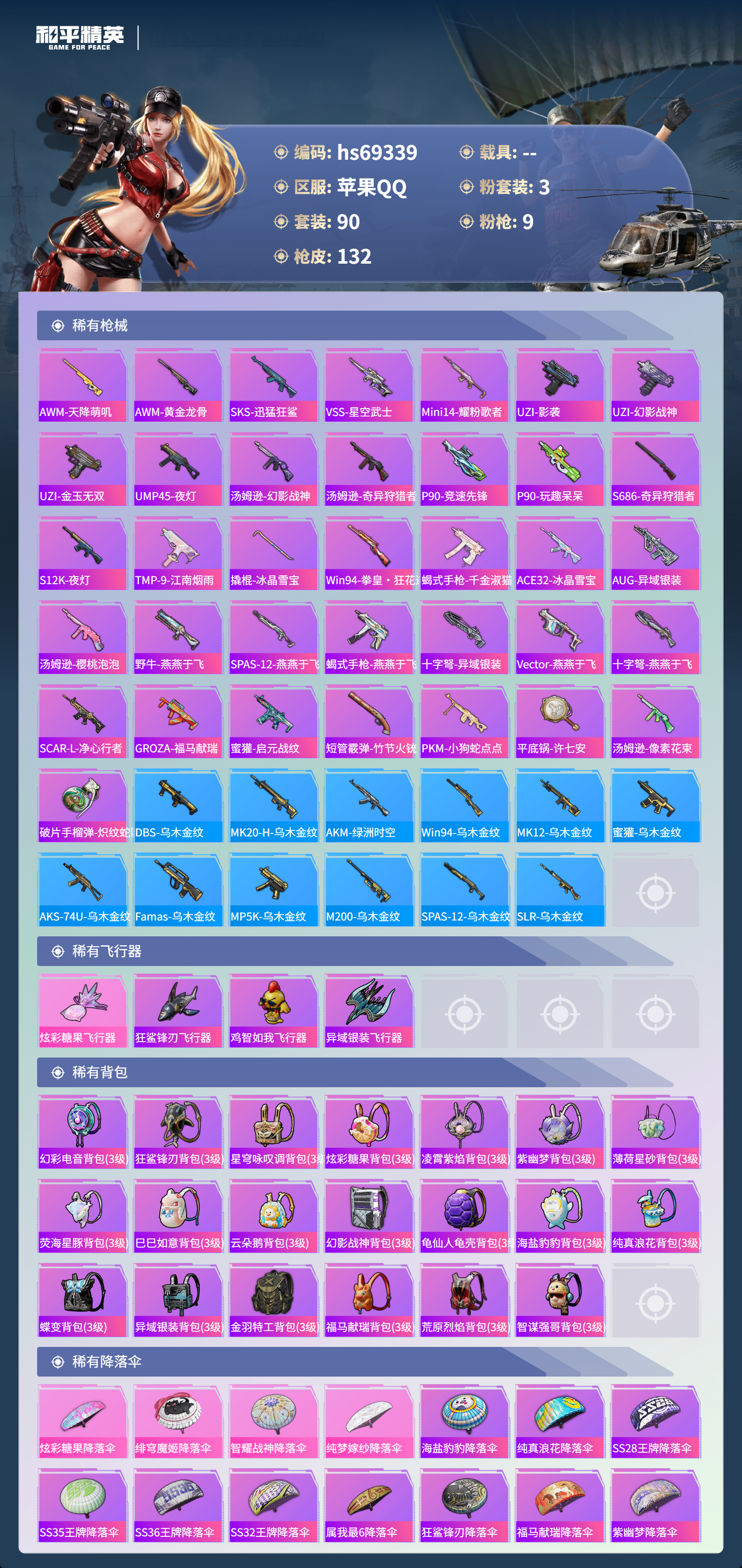 【132稀有枪械】M416-女娲灵识/3级,M416-心之恋语/4级,AKM-炫紫旋律/6级,SCAR-L-锦绣绵绵/5级,Kar98K-巳巳如意/5级,Mk14-福马献瑞/2级,UMP45-萌骑冒险/5级,P90-冷漠罗丽/5级,DP-28-豹影疾电/5级,QBZ-纯真浪花,AWM-纯真浪花,汤姆逊-纯真浪花,DBS-乌木金纹,AA12-G-纯真浪花,平底锅-纯真浪花,Vector-创世·救赎,S1897-精灵梦叶罗丽,SCAR-L-海盐豹豹,野牛-雏菊兔兔,Mk14-冰河战士,平底锅-雏菊兔兔,M762-雏菊兔兔,Mini14-雏菊兔兔,R1895-雏菊兔兔,UZI-冰河战士,M16A4-冰河战士,MK20-H-乌木金纹,DBS-风迹短诗,莫辛纳甘-风迹短诗,Mini14-鸡智如我,AKM-绿洲时空,Win94-乌木金纹,MK12-风迹短诗,MK12-乌木金纹,PKM-紫幽梦,MG3-霓彩脉冲,Mk14-紫幽梦,蜜獾-乌木金纹,M762-云朵鹅,S1897-紫幽梦,SVD-云朵鹅,P92-紫幽梦,SPAS-12-狂鲨锋刃,M417-玩趣呆呆,MK20-H-狂鲨锋刃,UZI-炫彩糖果,ARX-像素花束,大砍刀-像素花束,Mk47-风迹短诗,JS9-凌霄紫焰,MG-36-凌霄紫焰,平底锅-紫幽梦,破片手榴弹-海盐豹豹,UMP45-海盐豹豹,ARX-凌霄紫焰,AKS-74U-乌木金纹,AKM-涂鸦街区,蜜獾-风迹短诗,爆炸猎弓-喜羊羊与灰太狼,P92-凌霄紫焰,AMR-喜羊羊与灰太狼,Famas-乌木金纹,Famas-霓彩脉冲,SPAS-12-云朵鹅,破片手榴弹-拽到爆炸,S1897-糯团青竹,平底锅-凌霄紫焰,Mk14-薄荷星砂,沙漠之鹰-云朵鹅,MG-36-薄荷星砂,大砍刀-云朵鹅,PKM-啾咪啾咪,S1897-荧海星豚,DBS-荧海星豚,SLR-霓彩脉冲,SCAR-L-彩虹符号,AUG-紫晶流影,AMR-鸡智如我,M416-黄金龙骨,AKM-影袭,AKM-缤纷海域,AKM-春暖花开,SCAR-L-夜灯,M16A4-快乐主宰,GROZA-影袭,QBZ-彩虹符号,M762-奇异狩猎者,蜜獾-天降萌叽,Kar98K-幻影战神,Kar98K-影袭,M24-影袭,M24-奇异狩猎者,AWM-天降萌叽,AWM-黄金龙骨,SKS-迅猛狂鲨,VSS-星空武士,Mini14-耀粉歌者,UZI-影袭,UZI-幻影战神,UZI-金玉无双,UMP45-夜灯,汤姆逊-幻影战神,汤姆逊-奇异狩猎者,MP5K-乌木金纹,P90-竞速先锋,P90-玩趣呆呆,S686-奇异狩猎者,S12K-夜灯,TMP-9-江南烟雨,撬棍-冰晶雪宝,Win94-拳皇·狂花道,蝎式手枪-千金淑猫,ACE32-冰晶雪宝,AUG-异域银装,汤姆逊-樱桃泡泡,野牛-燕燕于飞,M200-乌木金纹,SPAS-12-燕燕于飞,蝎式手枪-燕燕于飞,十字弩-异域银装,SPAS-12-乌木金纹,Vector-燕燕于飞,十字弩-燕燕于飞,SCAR-L-净心行者,GROZA-福马献瑞,蜜獾-启元战纹,短管霰弹-竹节火铳,PKM-小狗蛇点点,SLR-乌木金纹,平底锅-许七安,汤姆逊-像素花束,破片手榴弹-炽纹蛇影