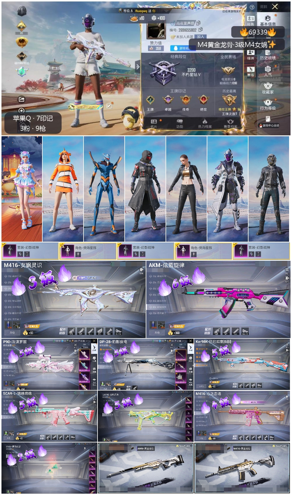 【9特效枪】SCAR-L-锦绣绵绵/5级,DP-28-豹影疾电/5级,AKM-炫紫旋律/6级,M416-女娲灵识/3级,Kar98K-巳巳如意/5级,Mk14-福马献瑞/2级,P90-冷漠罗丽/5级,M416-心之恋语/4级,UMP45-萌骑冒险/5级