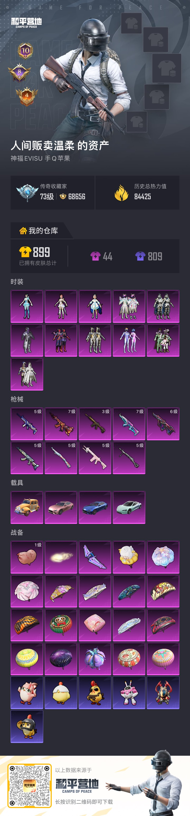 PX_2564750-4载具-178套装-250枪皮-2稀有4载具11粉装9特效枪30热门178套装250枪皮,84425热力值,10印记,历史传奇王牌19星,【2稀有】,AKM-缤纷海域,浪漫天命,【4载具】,玛莎拉蒂蓝色,玛莎拉蒂粉色,特斯拉R水滴蓝,萌喵橘座,【11粉装】,圣堂之誓,梦幻火箭,洛天依,异瞳寒姬,幻影战神,精灵迷巫,绚金战神,冰霜白皇,星之彼岸,银龙傲海,山涧鹿灵,【9特效枪】,M416-五爪金龙,(3级),Kar98K-巳巳如意,(5级),DP-28-豹影疾电,(5级),M762-激战未来,(5级),AUG-星之彼岸,(6级),M417-第五大道,(5级),AKM-梦之光华,(7级),M416-风花雪月,(7级),SCAR-L-青春物语,(5级),【30热门】,龟仙人,呆萌铁蟹,软萌银虎,金羽特工,DKG战队服,裁决冥王,梦起落英,神秘黑猫,暗夜契约,迪迦奥特曼,赛罗奥特曼,团圆交子,瑞龙福将,冰爽海盐,影双刃,抹茶蜜豆,静谧青瓷,破蛋小黄鸡,弄潮海豚,Kar98K-终极赛罗,M416-仓鼠灰灰,M416-梨园星光,M762-奇异狩猎者,M762-瑞龙福将,M24-奇异狩猎者,M249-古堡领主,Kar98K-深海曼妙,M24-香水柠檬,AWM-激战未来,AKM-山经魅狐,【2飞行器】,梦幻火箭飞行器,齐天大圣飞行器,【4头盔】,精灵迷巫头盔,梦幻火箭头盔,甜心宝贝头盔,金风玉露头盔,【3背包】,甜心宝贝背包,萌熊伴侣背包,神秘黑猫背包,营地ID: