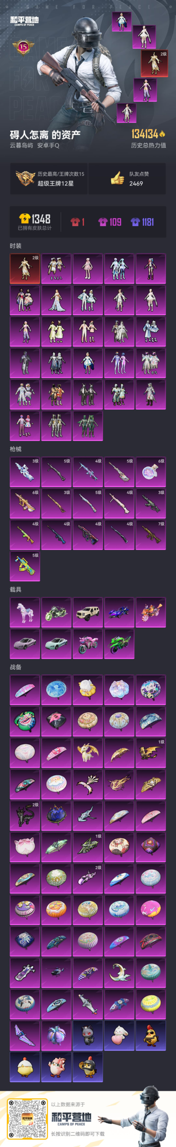 PX_2565091-9载具-242套装-333枪皮-1红装1稀有10载具27粉装16特效枪26热门242套装333枪皮,热力值,15印记,历史超级王牌12星,【1红装】,金蛇镇世-烛九,(2级),【1稀有】,AKM-百万伏特,【10载具】,乔治巴顿乳石白,特斯拉R水滴蓝,特斯拉R沁心粉,海龙奔腾,晶梦灵驹,双人摩托梦幻火箭,双刃魅影绿色,幽焰风驰摩托车,鬼马风驰,空客蔚蓝之翼僚机,【27粉装】,狂魅哈莉,梦幻火箭,天使彩虹糖,千金淑猫,洛天依,雪月幻音,月影灵韵,极意拳锋,星穹咏叹调,金域紫灵,羊梦糖心,幻影战神,闲梦青缨,智耀战神,幻彩电音,数码大师,第五大道,翡翠骑士,绚金战神,冰霜白皇,傲雪凌霜,银刃赛罗,绮梦青鸾,葫芦兄弟,山涧鹿灵,彩虹鹿灵,吟月归客,【16特效枪】,M416-五爪金龙,(7级),P90-魔童闹海敖丙,(3级),AKM-幽焰骑士,(3级),Kar98K-圣域龙灵,(3级),Kar98K-巳巳如意,(5级),MG-36-幻彩电音,(4级),DP-28-千金淑猫,(4级),DP-28-豹影疾电,(5级),AUG-圣斗士星矢,(6级),AMR-智耀战神,(5级),GROZA-香水柠檬,(5级),Kar98K-暗翼战神,(4级),AUG-星之彼岸,(4级),SLR-暗夜玫瑰,(4级),SKS-碧影闪光,(4级),破片手榴弹-瓶中星球,(6级),【26热门】,龟仙人,呆萌铁蟹,鹰眼刺客,AG战队服,山经魅狐,梦起落英,暗夜契约,赛罗奥特曼,SS1特训,醒狮腾龙,团圆交子,瑞龙福将,纯白誓言,冰爽海盐,影双刃,破蛋小黄鸡,极速红龙,英勇保护者,Kar98K-终极赛罗,M762-瑞龙福将,S686-奇异狩猎者,M24-香水柠檬,AWM-激战未来,AKM-山经魅狐,汤姆逊-林间仙鹿,GROZA-林间仙鹿,【5飞行器】,龙翔九天飞行器,梦幻火箭飞行器,绮梦青鸾飞行器,终极赛罗飞行器,王牌四分卫飞行器,【5头盔】,精灵迷巫头盔,梦幻火箭头盔,幻影战神头盔,深海小丑鱼头盔,花间之火头盔,【4背包】,梦幻火箭背包,甜心宝贝背包,百万伏特背包,夏日绵绵冰背包,圣域龙宝僚机,营地ID: