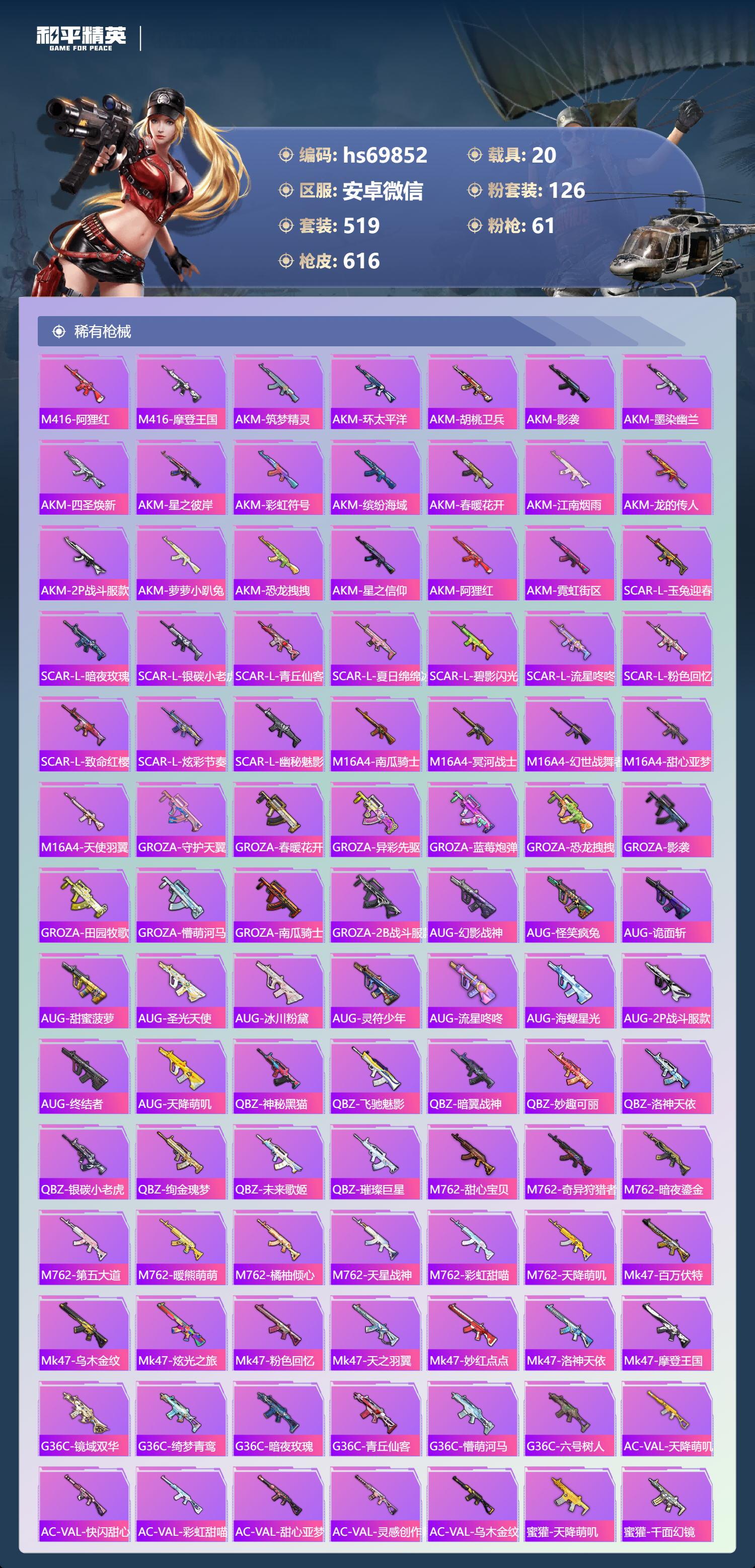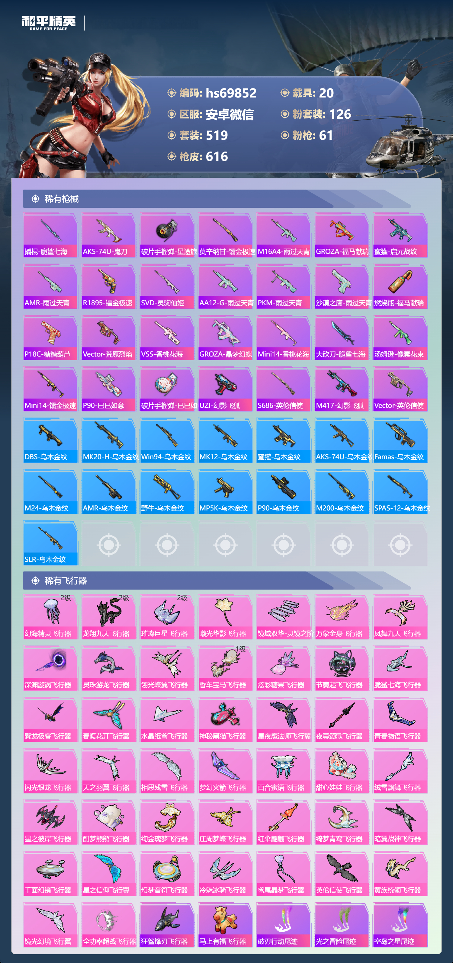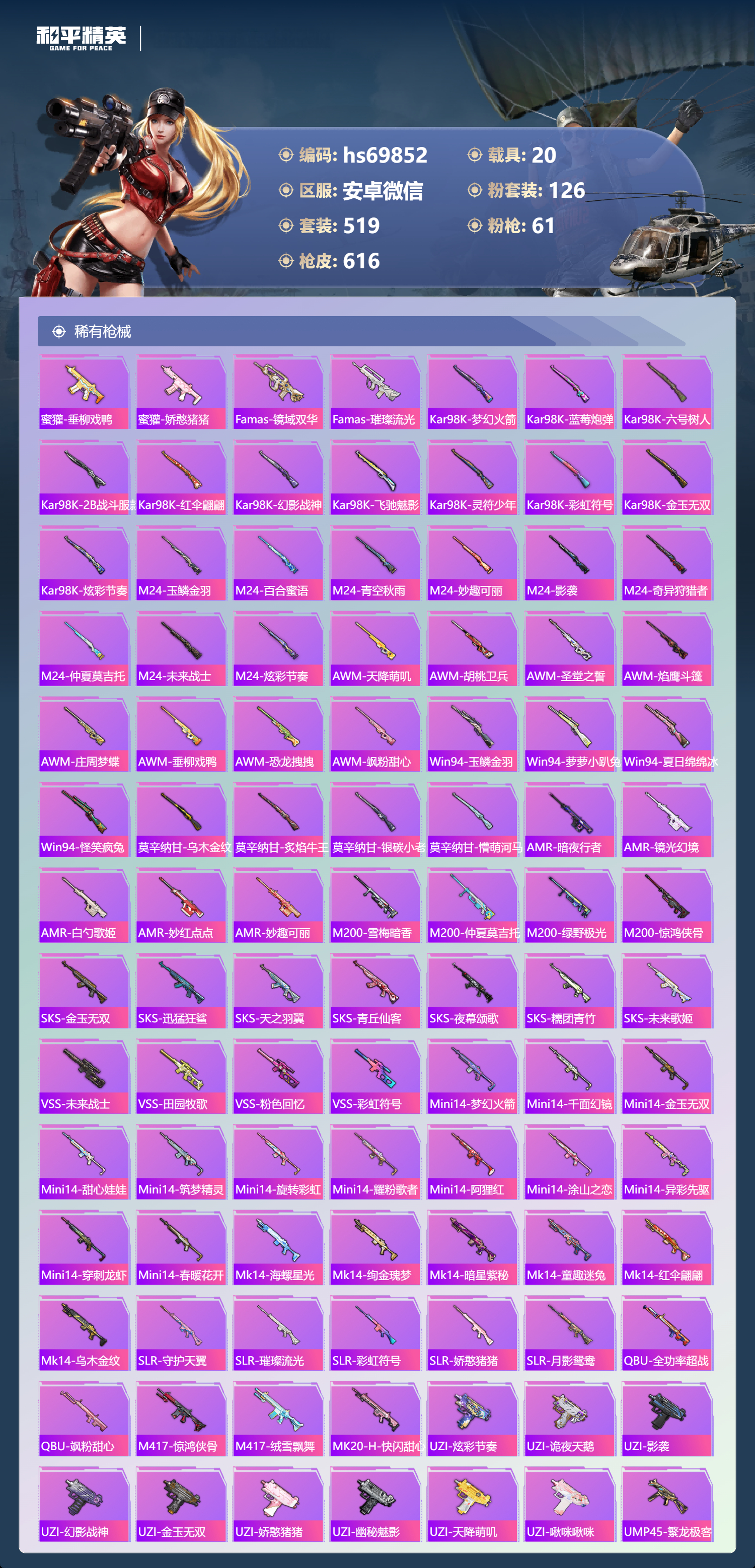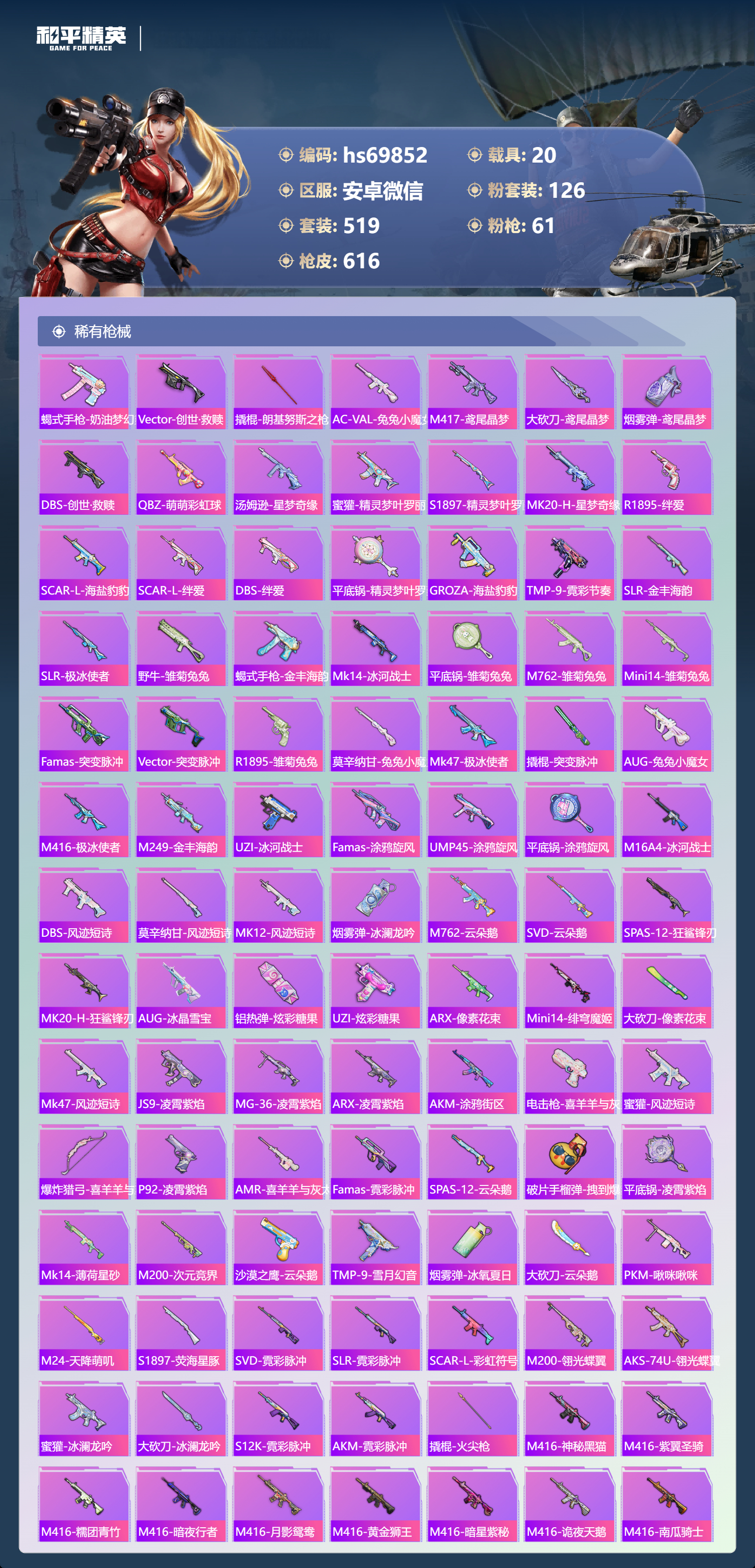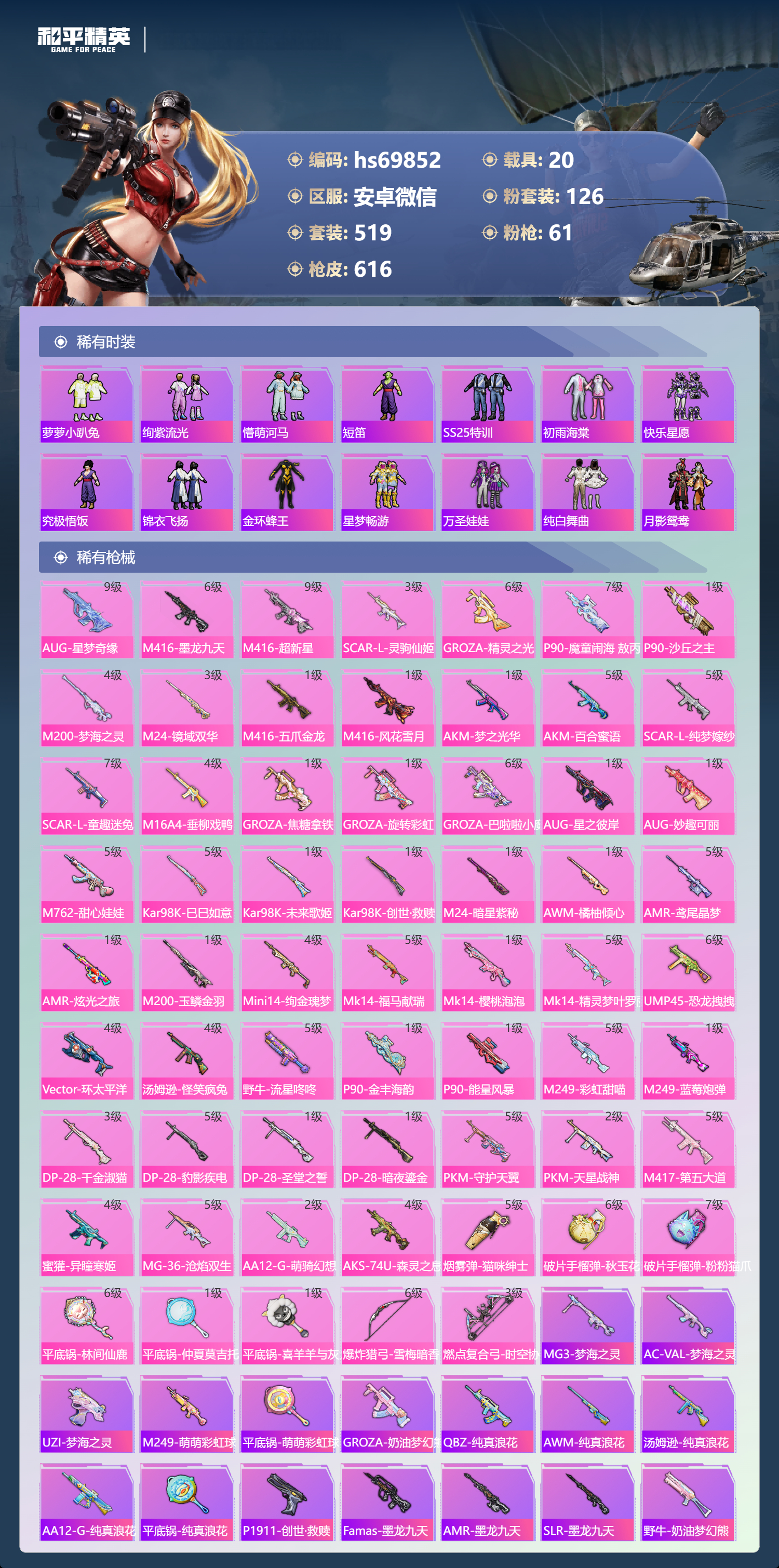 【610稀有枪械】AUG-星梦奇缘/9级,M416-墨龙九天/6级,M416-超新星/9级,SCAR-L-灵驹仙姬/3级,GROZA-精灵之光/6级,P90-魔童闹海,敖丙/7级,P90-沙丘之主/1级,M200-梦海之灵/4级,M24-镜域双华/3级,M416-五爪金龙/1级,M416-风花雪月/1级,AKM-梦之光华/1级,AKM-百合蜜语/5级,SCAR-L-纯梦嫁纱/5级,SCAR-L-童趣迷兔/7级,M16A4-垂柳戏鸭/4级,GROZA-焦糖拿铁/1级,GROZA-旋转彩虹/1级,GROZA-巴啦啦小魔仙/6级,AUG-星之彼岸/1级,AUG-妙趣可丽/1级,M762-甜心娃娃/5级,Kar98K-巳巳如意/5级,Kar98K-未来歌姬/1级,Kar98K-创世·救赎/1级,M24-暗星紫秘/1级,AWM-橘柚倾心/1级,AMR-鸢尾晶梦/5级,AMR-炫光之旅/1级,M200-玉鳞金羽/1级,Mini14-绚金瑰梦/4级,Mk14-福马献瑞/5级,Mk14-樱桃泡泡/1级,Mk14-精灵梦叶罗丽/5级,UMP45-恐龙拽拽/6级,Vector-环太平洋/4级,汤姆逊-怪笑疯兔/4级,野牛-流星咚咚/5级,P90-金丰海韵/1级,P90-能量风暴/1级,M249-彩虹甜喵/5级,M249-蓝莓炮弹/1级,DP-28-千金淑猫/3级,DP-28-豹影疾电/5级,DP-28-圣堂之誓/1级,DP-28-暗夜鎏金/1级,PKM-守护天翼/5级,PKM-天星战神/2级,M417-第五大道/5级,蜜獾-异瞳寒姬/4级,MG-36-沧焰双生/5级,AA12-G-萌骑幻想/2级,AKS-74U-森灵之息/4级,烟雾弹-猫咪绅士/5级,破片手榴弹-秋玉花灯/6级,破片手榴弹-粉粉猫爪/7级,平底锅-林间仙鹿/6级,平底锅-仲夏莫吉托/1级,平底锅-喜羊羊与灰太狼/1级,爆炸猎弓-雪梅暗香/6级,燃点复合弓-时空协奏/3级,MG3-梦海之灵,AC-VAL-梦海之灵,UZI-梦海之灵,M249-萌萌彩虹球,平底锅-萌萌彩虹球,GROZA-奶油梦幻熊,QBZ-纯真浪花,AWM-纯真浪花,汤姆逊-纯真浪花,DBS-乌木金纹,AA12-G-纯真浪花,平底锅-纯真浪花,P1911-创世·救赎,Famas-墨龙九天,AMR-墨龙九天,SLR-墨龙九天,野牛-奶油梦幻熊,蝎式手枪-奶油梦幻熊,Vector-创世·救赎,撬棍-朗基努斯之枪,AC-VAL-兔兔小魔女,M417-鸢尾晶梦,大砍刀-鸢尾晶梦,烟雾弹-鸢尾晶梦,DBS-创世·救赎,QBZ-萌萌彩虹球,汤姆逊-星梦奇缘,蜜獾-精灵梦叶罗丽,S1897-精灵梦叶罗丽,MK20-H-星梦奇缘,R1895-绊爱,SCAR-L-海盐豹豹,SCAR-L-绊爱,DBS-绊爱,平底锅-精灵梦叶罗丽,GROZA-海盐豹豹,TMP-9-霓彩节奏,SLR-金丰海韵,SLR-极冰使者,野牛-雏菊兔兔,蝎式手枪-金丰海韵,Mk14-冰河战士,平底锅-雏菊兔兔,M762-雏菊兔兔,Mini14-雏菊兔兔,Famas-突变脉冲,Vector-突变脉冲,R1895-雏菊兔兔,莫辛纳甘-兔兔小魔女,Mk47-极冰使者,撬棍-突变脉冲,AUG-兔兔小魔女,M416-极冰使者,M249-金丰海韵,UZI-冰河战士,Famas-涂鸦旋风,UMP45-涂鸦旋风,平底锅-涂鸦旋风,M16A4-冰河战士,MK20-H-乌木金纹,DBS-风迹短诗,莫辛纳甘-风迹短诗,Win94-乌木金纹,MK12-风迹短诗,MK12-乌木金纹,烟雾弹-冰澜龙吟,蜜獾-乌木金纹,M762-云朵鹅,SVD-云朵鹅,SPAS-12-狂鲨锋刃,MK20-H-狂鲨锋刃,AUG-冰晶雪宝,铝热弹-炫彩糖果,UZI-炫彩糖果,ARX-像素花束,Mini14-绯穹魔姬,大砍刀-像素花束,Mk47-风迹短诗,JS9-凌霄紫焰,MG-36-凌霄紫焰,ARX-凌霄紫焰,AKS-74U-乌木金纹,AKM-涂鸦街区,电击枪-喜羊羊与灰太狼,蜜獾-风迹短诗,爆炸猎弓-喜羊羊与灰太狼,P92-凌霄紫焰,AMR-喜羊羊与灰太狼,Famas-乌木金纹,Famas-霓彩脉冲,SPAS-12-云朵鹅,破片手榴弹-拽到爆炸,平底锅-凌霄紫焰,Mk14-薄荷星砂,M200-次元竞界,沙漠之鹰-云朵鹅,TMP-9-雪月幻音,烟雾弹-冰氧夏日,大砍刀-云朵鹅,PKM-啾咪啾咪,M24-天降萌叽,S1897-荧海星豚,SVD-霓彩脉冲,SLR-霓彩脉冲,SCAR-L-彩虹符号,M200-翎光蝶翼,AKS-74U-翎光蝶翼,蜜獾-冰澜龙吟,大砍刀-冰澜龙吟,S12K-霓彩脉冲,AKM-霓彩脉冲,撬棍-火尖枪,M416-神秘黑猫,M416-紫翼圣骑,M416-糯团青竹,M416-暗夜行者,M416-月影鸳鸯,M416-黄金狮王,M416-暗星紫秘,M416-诡夜天鹅,M416-南瓜骑士,M416-阿狸红,M416-摩登王国,AKM-筑梦精灵,AKM-环太平洋,AKM-胡桃卫兵,AKM-影袭,AKM-墨染幽兰,AKM-四圣焕新,AKM-星之彼岸,AKM-彩虹符号,AKM-缤纷海域,AKM-春暖花开,AKM-江南烟雨,AKM-龙的传人,AKM-2P战斗服款,AKM-萝萝小趴兔,AKM-恐龙拽拽,AKM-星之信仰,AKM-阿狸红,AKM-霓虹街区,SCAR-L-玉兔迎春,SCAR-L-暗夜玫瑰,SCAR-L-银碳小老虎,SCAR-L-青丘仙客,SCAR-L-夏日绵绵冰,SCAR-L-碧影闪光,SCAR-L-流星咚咚,SCAR-L-粉色回忆,SCAR-L-致命红樱,SCAR-L-炫彩节奏,SCAR-L-幽秘魅影,M16A4-南瓜骑士,M16A4-冥河战士,M16A4-幻世战舞者,M16A4-甜心亚梦,M16A4-天使羽翼,GROZA-守护天翼,GROZA-春暖花开,GROZA-异彩先驱,GROZA-蓝莓炮弹,GROZA-恐龙拽拽,GROZA-影袭,GROZA-田园牧歌,GROZA-懵萌河马,GROZA-南瓜骑士,GROZA-2B战斗服款,AUG-幻影战神,AUG-怪笑疯兔,AUG-诡面斩,AUG-甜蜜菠萝,AUG-圣光天使,AUG-冰川粉黛,AUG-灵符少年,AUG-流星咚咚,AUG-海螺星光,AUG-2P战斗服款,AUG-终结者,AUG-天降萌叽,QBZ-神秘黑猫,QBZ-飞驰魅影,QBZ-暗翼战神,QBZ-妙趣可丽,QBZ-洛神天依,QBZ-银碳小老虎,QBZ-绚金瑰梦,QBZ-未来歌姬,QBZ-璀璨巨星,M762-甜心宝贝,M762-奇异狩猎者,M762-暗夜鎏金,M762-第五大道,M762-暖熊萌萌,M762-橘柚倾心,M762-天星战神,M762-彩虹甜喵,M762-天降萌叽,Mk47-百万伏特,Mk47-乌木金纹,Mk47-炫光之旅,Mk47-粉色回忆,Mk47-天之羽翼,Mk47-妙红点点,Mk47-洛神天依,Mk47-摩登王国,G36C-镜域双华,G36C-绮梦青鸾,G36C-暗夜玫瑰,G36C-青丘仙客,G36C-懵萌河马,G36C-六号树人,AC-VAL-天降萌叽,AC-VAL-快闪甜心,AC-VAL-彩虹甜喵,AC-VAL-甜心亚梦,AC-VAL-灵感创作师,AC-VAL-乌木金纹,蜜獾-天降萌叽,蜜獾-千面幻镜,蜜獾-垂柳戏鸭,蜜獾-娇憨猪猪,Famas-镜域双华,Famas-璀璨流光,Kar98K-梦幻火箭,Kar98K-蓝莓炮弹,Kar98K-六号树人,Kar98K-2B战斗服款,Kar98K-红伞翩翩,Kar98K-幻影战神,Kar98K-飞驰魅影,Kar98K-灵符少年,Kar98K-彩虹符号,Kar9