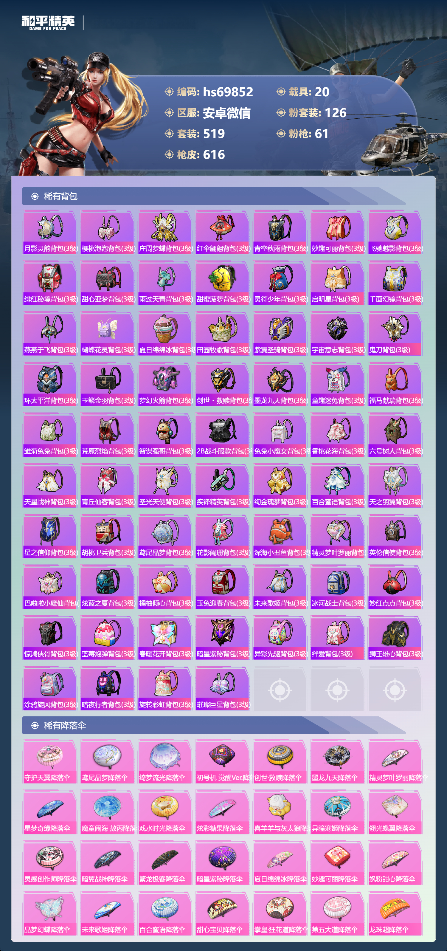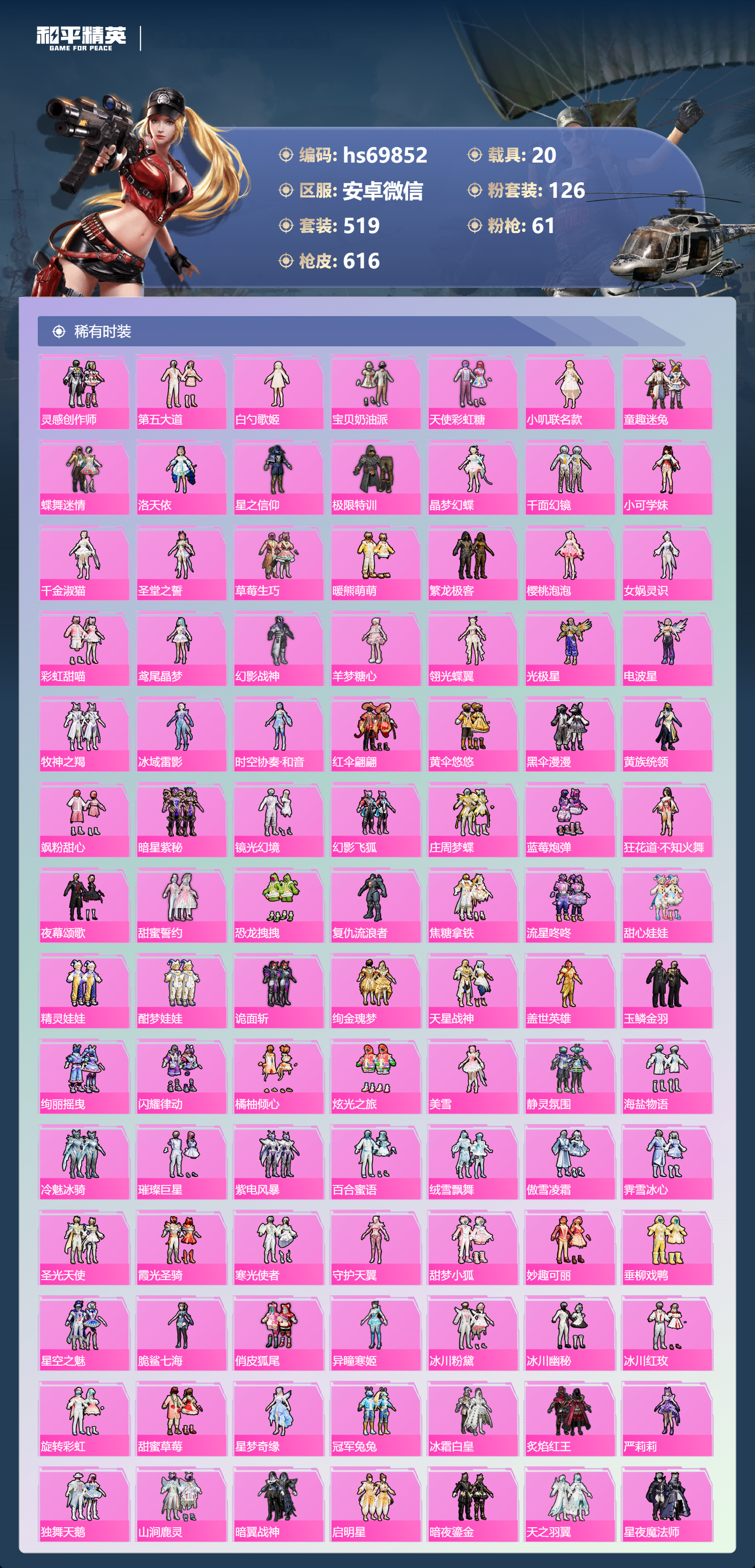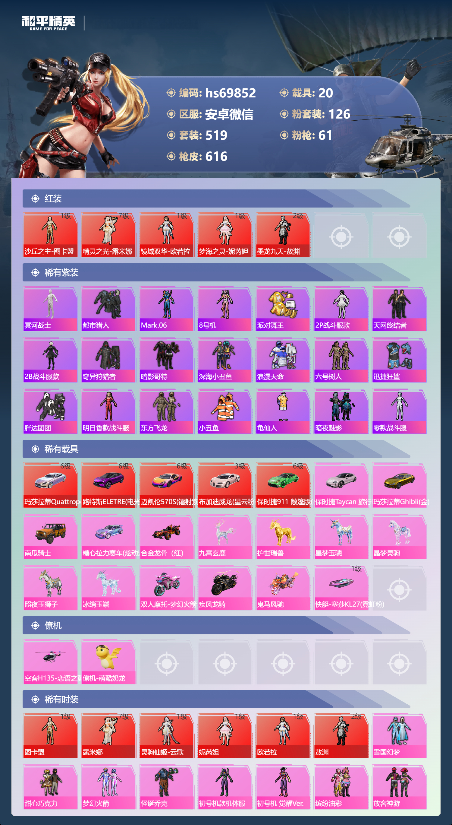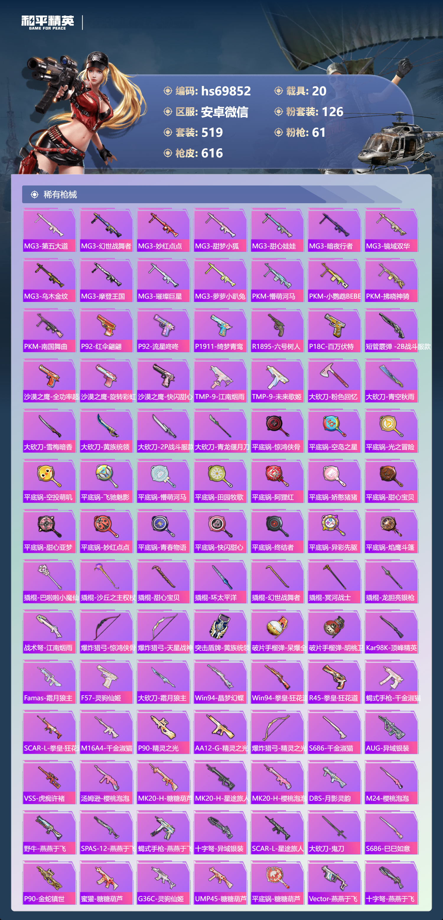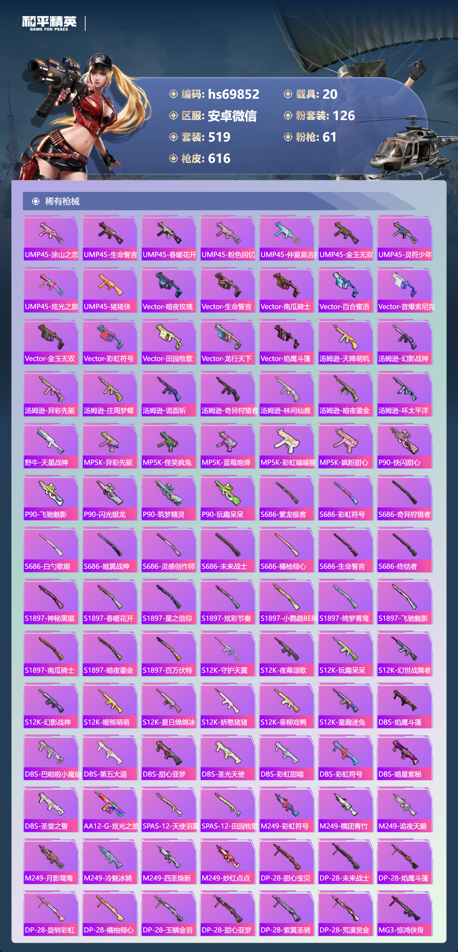 【610稀有枪械】AUG-星梦奇缘/9级,M416-墨龙九天/6级,M416-超新星/9级,SCAR-L-灵驹仙姬/3级,GROZA-精灵之光/6级,P90-魔童闹海,敖丙/7级,P90-沙丘之主/1级,M200-梦海之灵/4级,M24-镜域双华/3级,M416-五爪金龙/1级,M416-风花雪月/1级,AKM-梦之光华/1级,AKM-百合蜜语/5级,SCAR-L-纯梦嫁纱/5级,SCAR-L-童趣迷兔/7级,M16A4-垂柳戏鸭/4级,GROZA-焦糖拿铁/1级,GROZA-旋转彩虹/1级,GROZA-巴啦啦小魔仙/6级,AUG-星之彼岸/1级,AUG-妙趣可丽/1级,M762-甜心娃娃/5级,Kar98K-巳巳如意/5级,Kar98K-未来歌姬/1级,Kar98K-创世·救赎/1级,M24-暗星紫秘/1级,AWM-橘柚倾心/1级,AMR-鸢尾晶梦/5级,AMR-炫光之旅/1级,M200-玉鳞金羽/1级,Mini14-绚金瑰梦/4级,Mk14-福马献瑞/5级,Mk14-樱桃泡泡/1级,Mk14-精灵梦叶罗丽/5级,UMP45-恐龙拽拽/6级,Vector-环太平洋/4级,汤姆逊-怪笑疯兔/4级,野牛-流星咚咚/5级,P90-金丰海韵/1级,P90-能量风暴/1级,M249-彩虹甜喵/5级,M249-蓝莓炮弹/1级,DP-28-千金淑猫/3级,DP-28-豹影疾电/5级,DP-28-圣堂之誓/1级,DP-28-暗夜鎏金/1级,PKM-守护天翼/5级,PKM-天星战神/2级,M417-第五大道/5级,蜜獾-异瞳寒姬/4级,MG-36-沧焰双生/5级,AA12-G-萌骑幻想/2级,AKS-74U-森灵之息/4级,烟雾弹-猫咪绅士/5级,破片手榴弹-秋玉花灯/6级,破片手榴弹-粉粉猫爪/7级,平底锅-林间仙鹿/6级,平底锅-仲夏莫吉托/1级,平底锅-喜羊羊与灰太狼/1级,爆炸猎弓-雪梅暗香/6级,燃点复合弓-时空协奏/3级,MG3-梦海之灵,AC-VAL-梦海之灵,UZI-梦海之灵,M249-萌萌彩虹球,平底锅-萌萌彩虹球,GROZA-奶油梦幻熊,QBZ-纯真浪花,AWM-纯真浪花,汤姆逊-纯真浪花,DBS-乌木金纹,AA12-G-纯真浪花,平底锅-纯真浪花,P1911-创世·救赎,Famas-墨龙九天,AMR-墨龙九天,SLR-墨龙九天,野牛-奶油梦幻熊,蝎式手枪-奶油梦幻熊,Vector-创世·救赎,撬棍-朗基努斯之枪,AC-VAL-兔兔小魔女,M417-鸢尾晶梦,大砍刀-鸢尾晶梦,烟雾弹-鸢尾晶梦,DBS-创世·救赎,QBZ-萌萌彩虹球,汤姆逊-星梦奇缘,蜜獾-精灵梦叶罗丽,S1897-精灵梦叶罗丽,MK20-H-星梦奇缘,R1895-绊爱,SCAR-L-海盐豹豹,SCAR-L-绊爱,DBS-绊爱,平底锅-精灵梦叶罗丽,GROZA-海盐豹豹,TMP-9-霓彩节奏,SLR-金丰海韵,SLR-极冰使者,野牛-雏菊兔兔,蝎式手枪-金丰海韵,Mk14-冰河战士,平底锅-雏菊兔兔,M762-雏菊兔兔,Mini14-雏菊兔兔,Famas-突变脉冲,Vector-突变脉冲,R1895-雏菊兔兔,莫辛纳甘-兔兔小魔女,Mk47-极冰使者,撬棍-突变脉冲,AUG-兔兔小魔女,M416-极冰使者,M249-金丰海韵,UZI-冰河战士,Famas-涂鸦旋风,UMP45-涂鸦旋风,平底锅-涂鸦旋风,M16A4-冰河战士,MK20-H-乌木金纹,DBS-风迹短诗,莫辛纳甘-风迹短诗,Win94-乌木金纹,MK12-风迹短诗,MK12-乌木金纹,烟雾弹-冰澜龙吟,蜜獾-乌木金纹,M762-云朵鹅,SVD-云朵鹅,SPAS-12-狂鲨锋刃,MK20-H-狂鲨锋刃,AUG-冰晶雪宝,铝热弹-炫彩糖果,UZI-炫彩糖果,ARX-像素花束,Mini14-绯穹魔姬,大砍刀-像素花束,Mk47-风迹短诗,JS9-凌霄紫焰,MG-36-凌霄紫焰,ARX-凌霄紫焰,AKS-74U-乌木金纹,AKM-涂鸦街区,电击枪-喜羊羊与灰太狼,蜜獾-风迹短诗,爆炸猎弓-喜羊羊与灰太狼,P92-凌霄紫焰,AMR-喜羊羊与灰太狼,Famas-乌木金纹,Famas-霓彩脉冲,SPAS-12-云朵鹅,破片手榴弹-拽到爆炸,平底锅-凌霄紫焰,Mk14-薄荷星砂,M200-次元竞界,沙漠之鹰-云朵鹅,TMP-9-雪月幻音,烟雾弹-冰氧夏日,大砍刀-云朵鹅,PKM-啾咪啾咪,M24-天降萌叽,S1897-荧海星豚,SVD-霓彩脉冲,SLR-霓彩脉冲,SCAR-L-彩虹符号,M200-翎光蝶翼,AKS-74U-翎光蝶翼,蜜獾-冰澜龙吟,大砍刀-冰澜龙吟,S12K-霓彩脉冲,AKM-霓彩脉冲,撬棍-火尖枪,M416-神秘黑猫,M416-紫翼圣骑,M416-糯团青竹,M416-暗夜行者,M416-月影鸳鸯,M416-黄金狮王,M416-暗星紫秘,M416-诡夜天鹅,M416-南瓜骑士,M416-阿狸红,M416-摩登王国,AKM-筑梦精灵,AKM-环太平洋,AKM-胡桃卫兵,AKM-影袭,AKM-墨染幽兰,AKM-四圣焕新,AKM-星之彼岸,AKM-彩虹符号,AKM-缤纷海域,AKM-春暖花开,AKM-江南烟雨,AKM-龙的传人,AKM-2P战斗服款,AKM-萝萝小趴兔,AKM-恐龙拽拽,AKM-星之信仰,AKM-阿狸红,AKM-霓虹街区,SCAR-L-玉兔迎春,SCAR-L-暗夜玫瑰,SCAR-L-银碳小老虎,SCAR-L-青丘仙客,SCAR-L-夏日绵绵冰,SCAR-L-碧影闪光,SCAR-L-流星咚咚,SCAR-L-粉色回忆,SCAR-L-致命红樱,SCAR-L-炫彩节奏,SCAR-L-幽秘魅影,M16A4-南瓜骑士,M16A4-冥河战士,M16A4-幻世战舞者,M16A4-甜心亚梦,M16A4-天使羽翼,GROZA-守护天翼,GROZA-春暖花开,GROZA-异彩先驱,GROZA-蓝莓炮弹,GROZA-恐龙拽拽,GROZA-影袭,GROZA-田园牧歌,GROZA-懵萌河马,GROZA-南瓜骑士,GROZA-2B战斗服款,AUG-幻影战神,AUG-怪笑疯兔,AUG-诡面斩,AUG-甜蜜菠萝,AUG-圣光天使,AUG-冰川粉黛,AUG-灵符少年,AUG-流星咚咚,AUG-海螺星光,AUG-2P战斗服款,AUG-终结者,AUG-天降萌叽,QBZ-神秘黑猫,QBZ-飞驰魅影,QBZ-暗翼战神,QBZ-妙趣可丽,QBZ-洛神天依,QBZ-银碳小老虎,QBZ-绚金瑰梦,QBZ-未来歌姬,QBZ-璀璨巨星,M762-甜心宝贝,M762-奇异狩猎者,M762-暗夜鎏金,M762-第五大道,M762-暖熊萌萌,M762-橘柚倾心,M762-天星战神,M762-彩虹甜喵,M762-天降萌叽,Mk47-百万伏特,Mk47-乌木金纹,Mk47-炫光之旅,Mk47-粉色回忆,Mk47-天之羽翼,Mk47-妙红点点,Mk47-洛神天依,Mk47-摩登王国,G36C-镜域双华,G36C-绮梦青鸾,G36C-暗夜玫瑰,G36C-青丘仙客,G36C-懵萌河马,G36C-六号树人,AC-VAL-天降萌叽,AC-VAL-快闪甜心,AC-VAL-彩虹甜喵,AC-VAL-甜心亚梦,AC-VAL-灵感创作师,AC-VAL-乌木金纹,蜜獾-天降萌叽,蜜獾-千面幻镜,蜜獾-垂柳戏鸭,蜜獾-娇憨猪猪,Famas-镜域双华,Famas-璀璨流光,Kar98K-梦幻火箭,Kar98K-蓝莓炮弹,Kar98K-六号树人,Kar98K-2B战斗服款,Kar98K-红伞翩翩,Kar98K-幻影战神,Kar98K-飞驰魅影,Kar98K-灵符少年,Kar98K-彩虹符号,Kar9