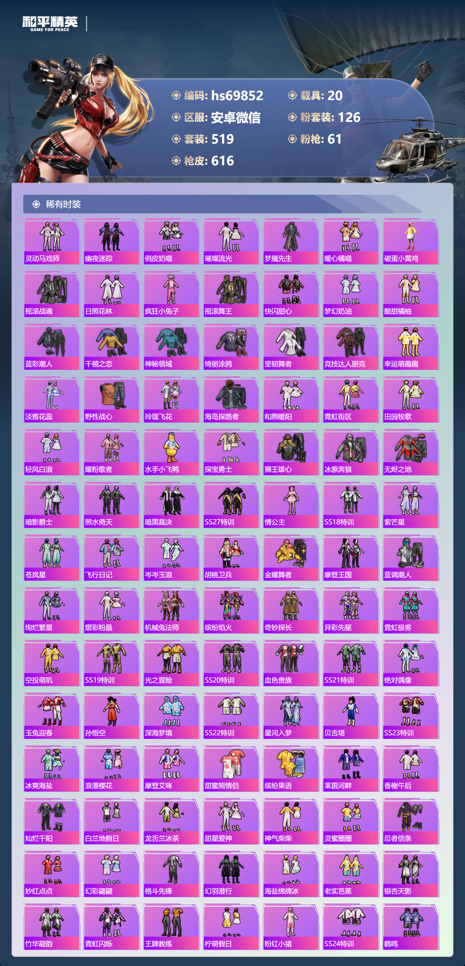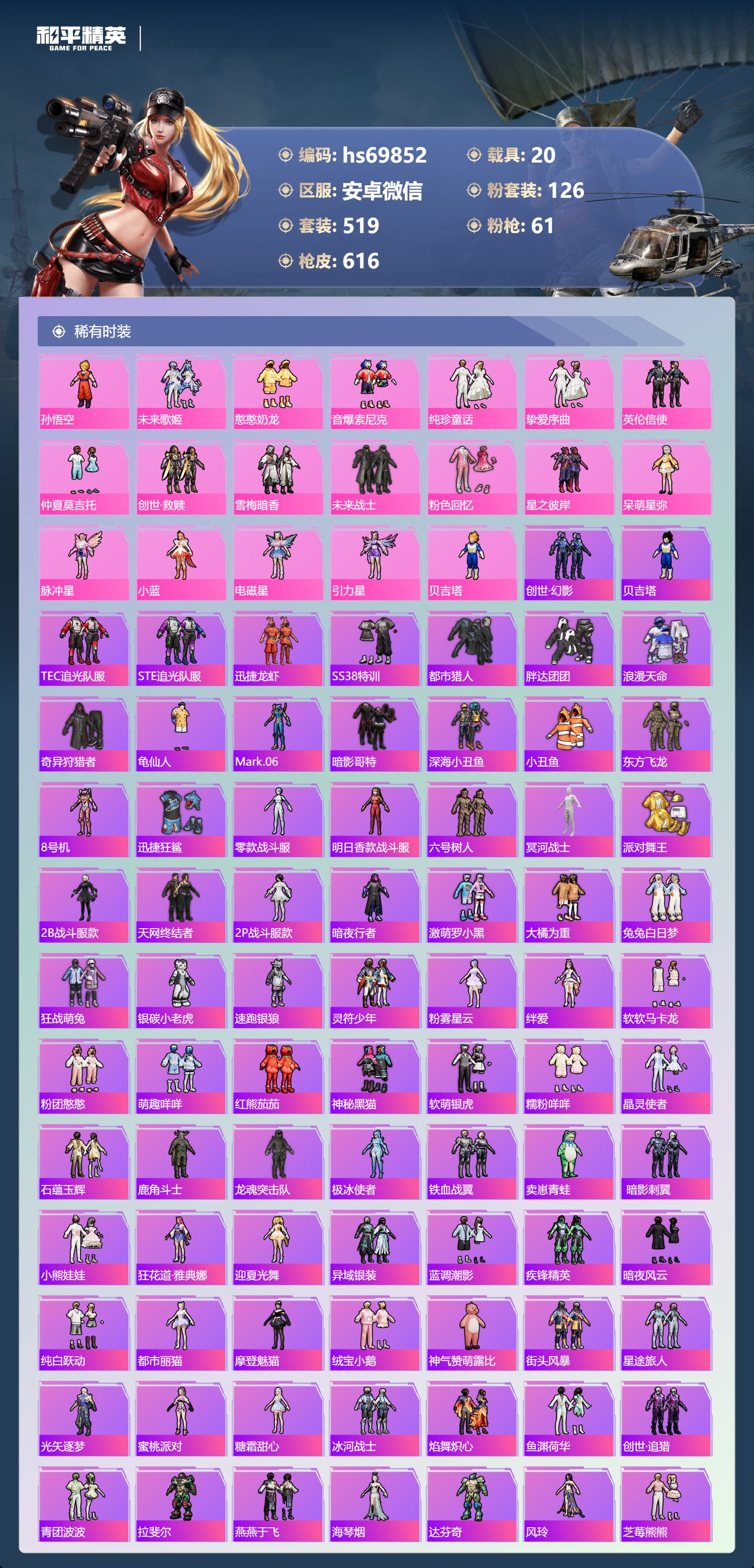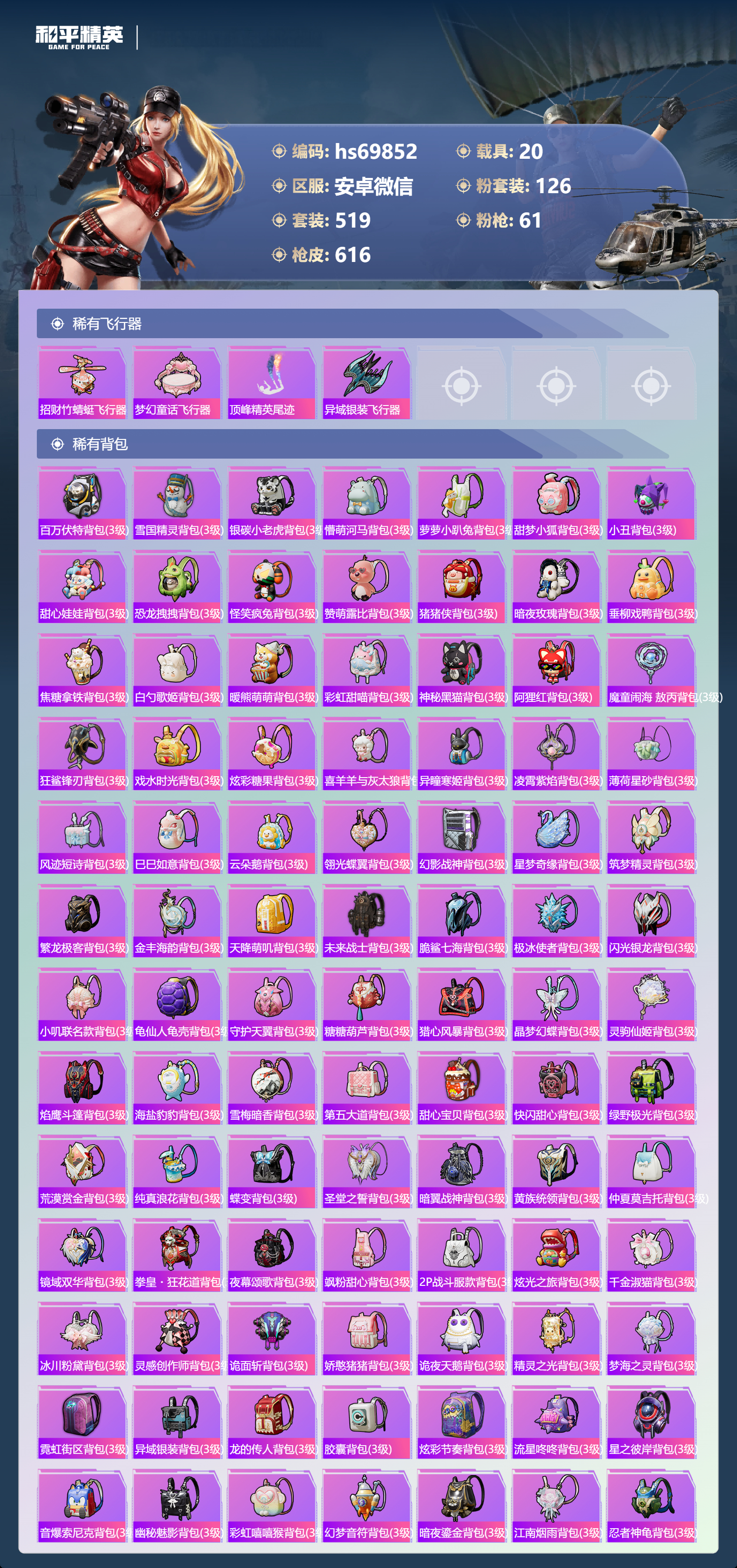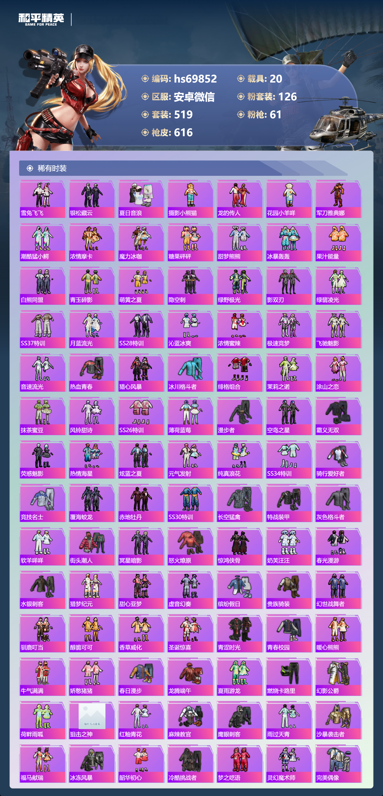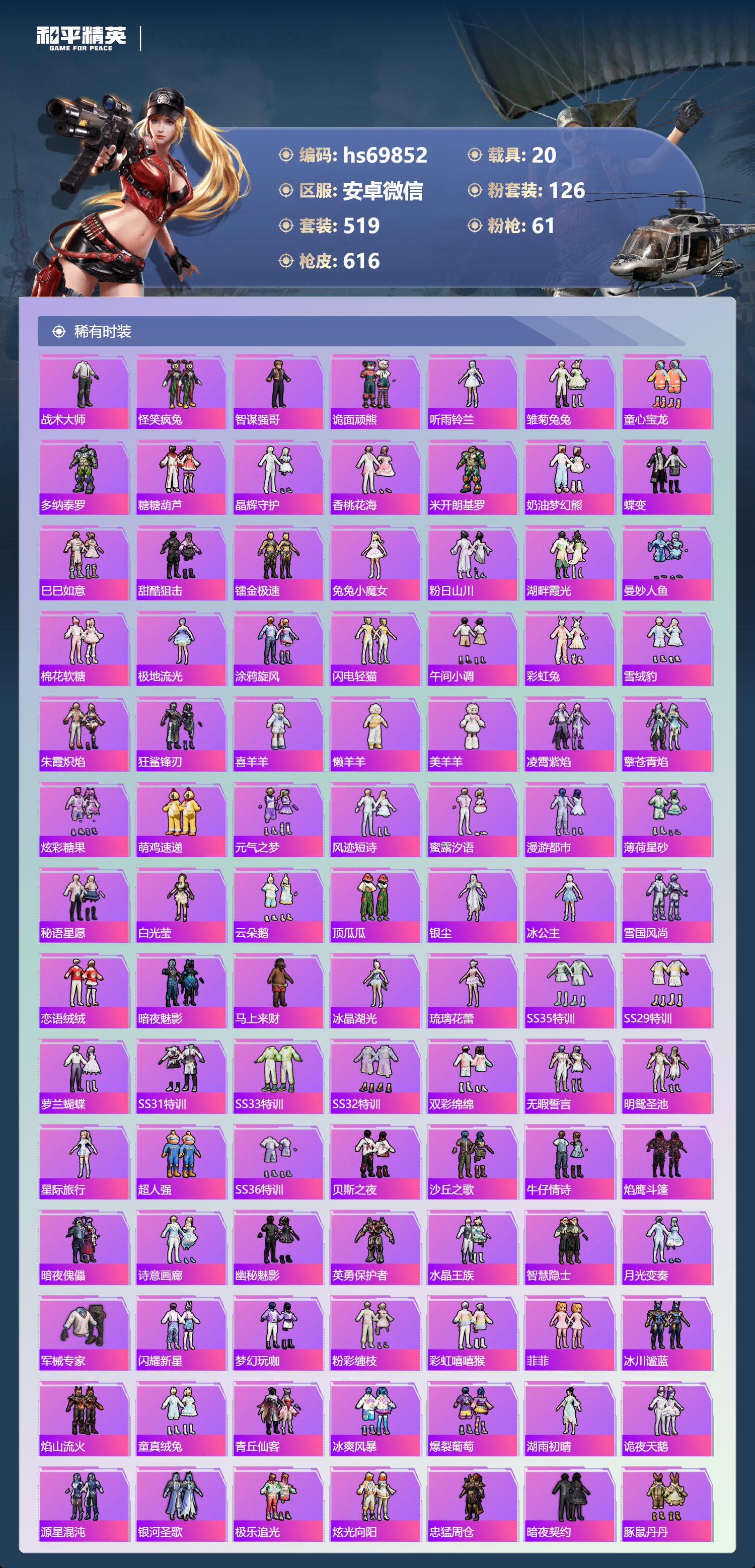 【610稀有枪械】AUG-星梦奇缘/9级,M416-墨龙九天/6级,M416-超新星/9级,SCAR-L-灵驹仙姬/3级,GROZA-精灵之光/6级,P90-魔童闹海,敖丙/7级,P90-沙丘之主/1级,M200-梦海之灵/4级,M24-镜域双华/3级,M416-五爪金龙/1级,M416-风花雪月/1级,AKM-梦之光华/1级,AKM-百合蜜语/5级,SCAR-L-纯梦嫁纱/5级,SCAR-L-童趣迷兔/7级,M16A4-垂柳戏鸭/4级,GROZA-焦糖拿铁/1级,GROZA-旋转彩虹/1级,GROZA-巴啦啦小魔仙/6级,AUG-星之彼岸/1级,AUG-妙趣可丽/1级,M762-甜心娃娃/5级,Kar98K-巳巳如意/5级,Kar98K-未来歌姬/1级,Kar98K-创世·救赎/1级,M24-暗星紫秘/1级,AWM-橘柚倾心/1级,AMR-鸢尾晶梦/5级,AMR-炫光之旅/1级,M200-玉鳞金羽/1级,Mini14-绚金瑰梦/4级,Mk14-福马献瑞/5级,Mk14-樱桃泡泡/1级,Mk14-精灵梦叶罗丽/5级,UMP45-恐龙拽拽/6级,Vector-环太平洋/4级,汤姆逊-怪笑疯兔/4级,野牛-流星咚咚/5级,P90-金丰海韵/1级,P90-能量风暴/1级,M249-彩虹甜喵/5级,M249-蓝莓炮弹/1级,DP-28-千金淑猫/3级,DP-28-豹影疾电/5级,DP-28-圣堂之誓/1级,DP-28-暗夜鎏金/1级,PKM-守护天翼/5级,PKM-天星战神/2级,M417-第五大道/5级,蜜獾-异瞳寒姬/4级,MG-36-沧焰双生/5级,AA12-G-萌骑幻想/2级,AKS-74U-森灵之息/4级,烟雾弹-猫咪绅士/5级,破片手榴弹-秋玉花灯/6级,破片手榴弹-粉粉猫爪/7级,平底锅-林间仙鹿/6级,平底锅-仲夏莫吉托/1级,平底锅-喜羊羊与灰太狼/1级,爆炸猎弓-雪梅暗香/6级,燃点复合弓-时空协奏/3级,MG3-梦海之灵,AC-VAL-梦海之灵,UZI-梦海之灵,M249-萌萌彩虹球,平底锅-萌萌彩虹球,GROZA-奶油梦幻熊,QBZ-纯真浪花,AWM-纯真浪花,汤姆逊-纯真浪花,DBS-乌木金纹,AA12-G-纯真浪花,平底锅-纯真浪花,P1911-创世·救赎,Famas-墨龙九天,AMR-墨龙九天,SLR-墨龙九天,野牛-奶油梦幻熊,蝎式手枪-奶油梦幻熊,Vector-创世·救赎,撬棍-朗基努斯之枪,AC-VAL-兔兔小魔女,M417-鸢尾晶梦,大砍刀-鸢尾晶梦,烟雾弹-鸢尾晶梦,DBS-创世·救赎,QBZ-萌萌彩虹球,汤姆逊-星梦奇缘,蜜獾-精灵梦叶罗丽,S1897-精灵梦叶罗丽,MK20-H-星梦奇缘,R1895-绊爱,SCAR-L-海盐豹豹,SCAR-L-绊爱,DBS-绊爱,平底锅-精灵梦叶罗丽,GROZA-海盐豹豹,TMP-9-霓彩节奏,SLR-金丰海韵,SLR-极冰使者,野牛-雏菊兔兔,蝎式手枪-金丰海韵,Mk14-冰河战士,平底锅-雏菊兔兔,M762-雏菊兔兔,Mini14-雏菊兔兔,Famas-突变脉冲,Vector-突变脉冲,R1895-雏菊兔兔,莫辛纳甘-兔兔小魔女,Mk47-极冰使者,撬棍-突变脉冲,AUG-兔兔小魔女,M416-极冰使者,M249-金丰海韵,UZI-冰河战士,Famas-涂鸦旋风,UMP45-涂鸦旋风,平底锅-涂鸦旋风,M16A4-冰河战士,MK20-H-乌木金纹,DBS-风迹短诗,莫辛纳甘-风迹短诗,Win94-乌木金纹,MK12-风迹短诗,MK12-乌木金纹,烟雾弹-冰澜龙吟,蜜獾-乌木金纹,M762-云朵鹅,SVD-云朵鹅,SPAS-12-狂鲨锋刃,MK20-H-狂鲨锋刃,AUG-冰晶雪宝,铝热弹-炫彩糖果,UZI-炫彩糖果,ARX-像素花束,Mini14-绯穹魔姬,大砍刀-像素花束,Mk47-风迹短诗,JS9-凌霄紫焰,MG-36-凌霄紫焰,ARX-凌霄紫焰,AKS-74U-乌木金纹,AKM-涂鸦街区,电击枪-喜羊羊与灰太狼,蜜獾-风迹短诗,爆炸猎弓-喜羊羊与灰太狼,P92-凌霄紫焰,AMR-喜羊羊与灰太狼,Famas-乌木金纹,Famas-霓彩脉冲,SPAS-12-云朵鹅,破片手榴弹-拽到爆炸,平底锅-凌霄紫焰,Mk14-薄荷星砂,M200-次元竞界,沙漠之鹰-云朵鹅,TMP-9-雪月幻音,烟雾弹-冰氧夏日,大砍刀-云朵鹅,PKM-啾咪啾咪,M24-天降萌叽,S1897-荧海星豚,SVD-霓彩脉冲,SLR-霓彩脉冲,SCAR-L-彩虹符号,M200-翎光蝶翼,AKS-74U-翎光蝶翼,蜜獾-冰澜龙吟,大砍刀-冰澜龙吟,S12K-霓彩脉冲,AKM-霓彩脉冲,撬棍-火尖枪,M416-神秘黑猫,M416-紫翼圣骑,M416-糯团青竹,M416-暗夜行者,M416-月影鸳鸯,M416-黄金狮王,M416-暗星紫秘,M416-诡夜天鹅,M416-南瓜骑士,M416-阿狸红,M416-摩登王国,AKM-筑梦精灵,AKM-环太平洋,AKM-胡桃卫兵,AKM-影袭,AKM-墨染幽兰,AKM-四圣焕新,AKM-星之彼岸,AKM-彩虹符号,AKM-缤纷海域,AKM-春暖花开,AKM-江南烟雨,AKM-龙的传人,AKM-2P战斗服款,AKM-萝萝小趴兔,AKM-恐龙拽拽,AKM-星之信仰,AKM-阿狸红,AKM-霓虹街区,SCAR-L-玉兔迎春,SCAR-L-暗夜玫瑰,SCAR-L-银碳小老虎,SCAR-L-青丘仙客,SCAR-L-夏日绵绵冰,SCAR-L-碧影闪光,SCAR-L-流星咚咚,SCAR-L-粉色回忆,SCAR-L-致命红樱,SCAR-L-炫彩节奏,SCAR-L-幽秘魅影,M16A4-南瓜骑士,M16A4-冥河战士,M16A4-幻世战舞者,M16A4-甜心亚梦,M16A4-天使羽翼,GROZA-守护天翼,GROZA-春暖花开,GROZA-异彩先驱,GROZA-蓝莓炮弹,GROZA-恐龙拽拽,GROZA-影袭,GROZA-田园牧歌,GROZA-懵萌河马,GROZA-南瓜骑士,GROZA-2B战斗服款,AUG-幻影战神,AUG-怪笑疯兔,AUG-诡面斩,AUG-甜蜜菠萝,AUG-圣光天使,AUG-冰川粉黛,AUG-灵符少年,AUG-流星咚咚,AUG-海螺星光,AUG-2P战斗服款,AUG-终结者,AUG-天降萌叽,QBZ-神秘黑猫,QBZ-飞驰魅影,QBZ-暗翼战神,QBZ-妙趣可丽,QBZ-洛神天依,QBZ-银碳小老虎,QBZ-绚金瑰梦,QBZ-未来歌姬,QBZ-璀璨巨星,M762-甜心宝贝,M762-奇异狩猎者,M762-暗夜鎏金,M762-第五大道,M762-暖熊萌萌,M762-橘柚倾心,M762-天星战神,M762-彩虹甜喵,M762-天降萌叽,Mk47-百万伏特,Mk47-乌木金纹,Mk47-炫光之旅,Mk47-粉色回忆,Mk47-天之羽翼,Mk47-妙红点点,Mk47-洛神天依,Mk47-摩登王国,G36C-镜域双华,G36C-绮梦青鸾,G36C-暗夜玫瑰,G36C-青丘仙客,G36C-懵萌河马,G36C-六号树人,AC-VAL-天降萌叽,AC-VAL-快闪甜心,AC-VAL-彩虹甜喵,AC-VAL-甜心亚梦,AC-VAL-灵感创作师,AC-VAL-乌木金纹,蜜獾-天降萌叽,蜜獾-千面幻镜,蜜獾-垂柳戏鸭,蜜獾-娇憨猪猪,Famas-镜域双华,Famas-璀璨流光,Kar98K-梦幻火箭,Kar98K-蓝莓炮弹,Kar98K-六号树人,Kar98K-2B战斗服款,Kar98K-红伞翩翩,Kar98K-幻影战神,Kar98K-飞驰魅影,Kar98K-灵符少年,Kar98K-彩虹符号,Kar9
