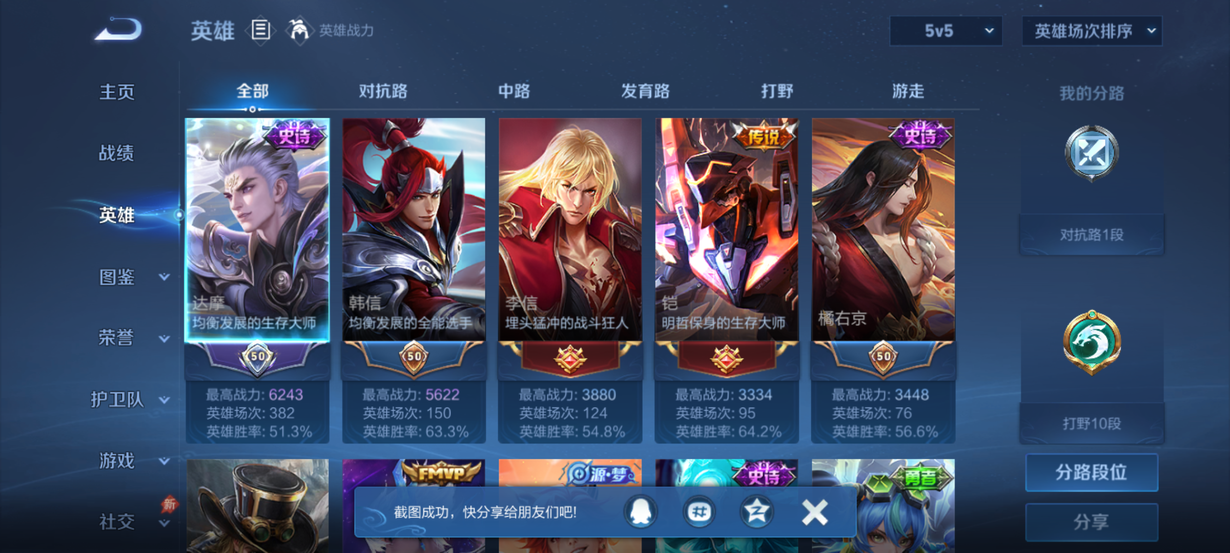 W10022【安卓区V8】可二次实名,英雄104,皮肤161,典藏:李白鸣剑.曳