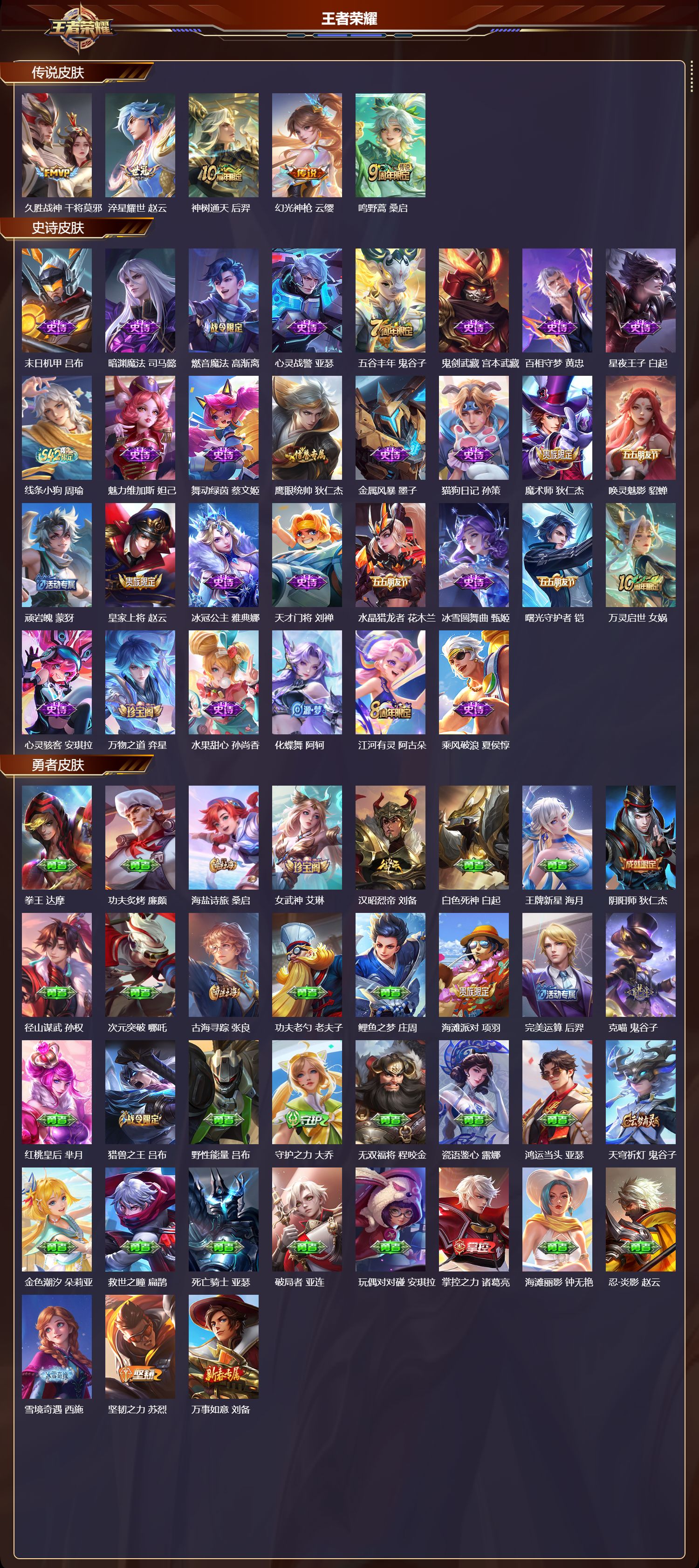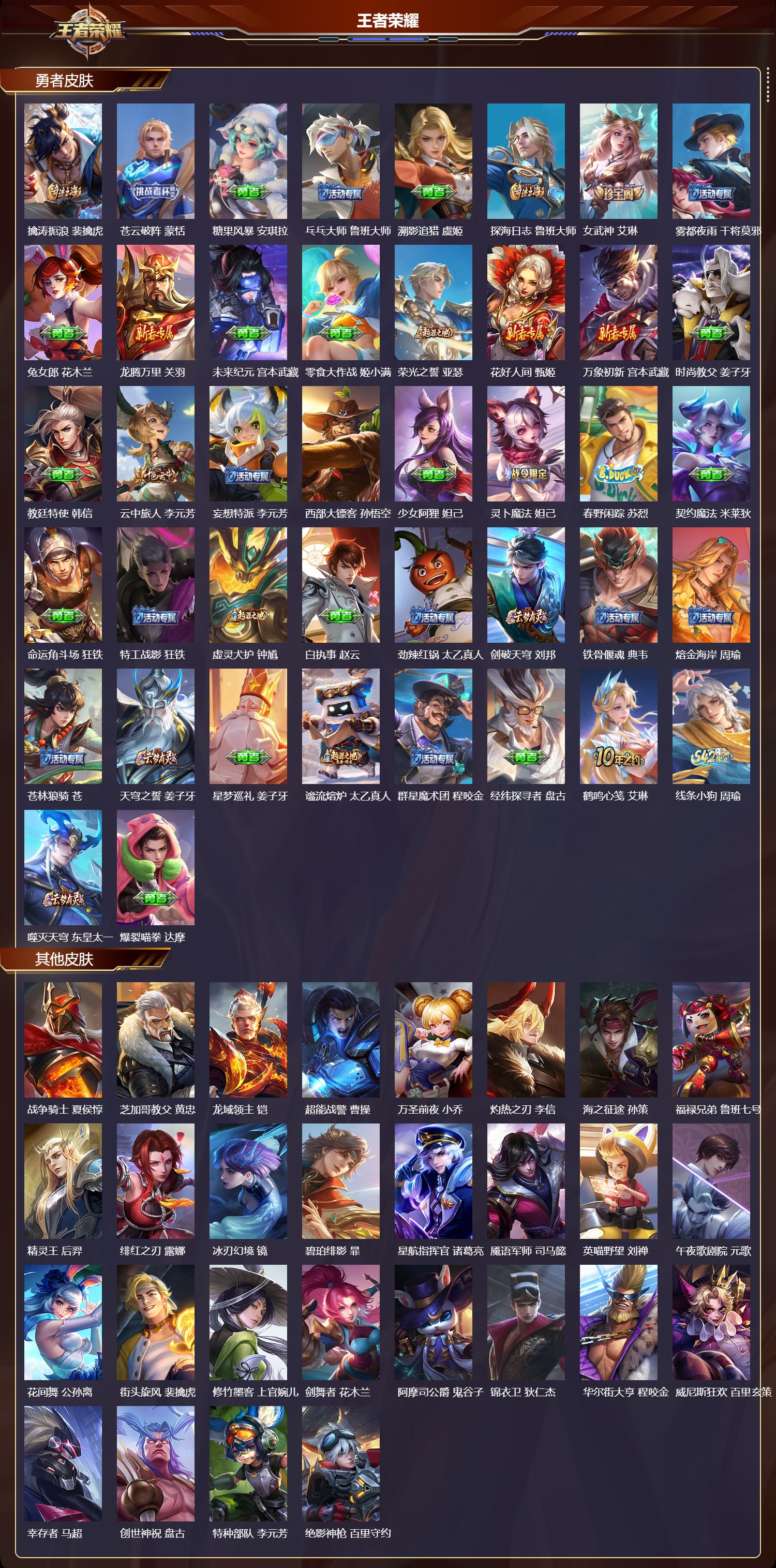【76,勇者皮肤】,拳王,达摩,功夫炙烤,廉颇,海盐诗旅,桑启,汉昭烈帝,刘备,白色死神,白起,王牌新星,海月,阴阳师,狄仁杰,径山谋武,孙权,次元突破,哪吒,古海寻踪,张良,功夫老勺,老夫子,鲤鱼之梦,庄周,海滩派对,项羽,完美运算,后羿,克喵,鬼谷子,红桃皇后,芈月,猎兽之王,吕布,野性能量,吕布,守护之力,大乔,无双福将,程咬金,瓷语鉴心,露娜,鸿运当头,亚瑟,天穹祈灯,鬼谷子,金色潮汐,朵莉亚,救世之瞳,扁鹊,死亡骑士,亚瑟,破局者,亚连,玩偶对对碰,安琪拉,掌控之力,诸葛亮,海滩丽影,钟无艳,忍·炎影,赵云,雪境奇遇,西施,坚韧之力,苏烈,万事如意,刘备,擒涛扼浪,裴擒虎,苍云破阵,蒙恬,糖果风暴,安琪拉,乓乓大师,鲁班大师,溯影追猎,虞姬,探海日志,鲁班大师,女武神,艾琳,雾都夜雨,干将莫邪,兔女郎,花木兰,龙腾万里,关羽,未来纪元,宫本武藏,零食大作战,姬小满,荣光之誓,亚瑟,花好人间,甄姬,万象初新,宫本武藏,时尚教父,姜子牙,教廷特使,韩信,云中旅人,李元芳,妄想特派,李元芳,西部大镖客,孙悟空,少女阿狸,妲己,灵卜魔法,妲己,春野闲踪,苏烈,契约魔法,米莱狄,命运角斗场,狂铁,特工战影,狂铁,虚灵犬护,钟馗,白执事,赵云,劲辣红锅,太乙真人,剑破天穹,刘邦,铁骨偃魂,典韦,熔金海岸,周瑜,苍林狼骑,苍,天穹之誓,姜子牙,星梦巡礼,姜子牙,谧流熔炉,太乙真人,群星魔术团,程咬金,经纬探寻者,盘古,鹤鸣心笺,艾琳,线条小狗,周瑜,噬灭天穹,东皇太一,爆裂喵拳,达摩,