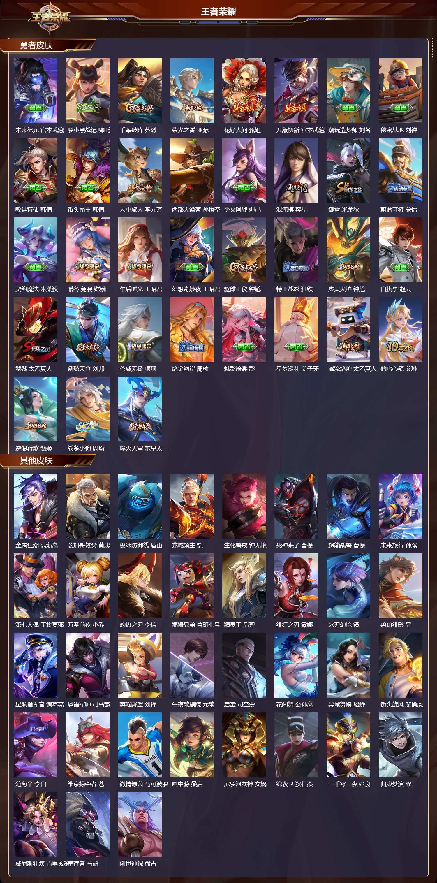 【99,勇者皮肤】,时空谍影,海诺,圆桌骑士,盾山,太极少年,赵怀真,沙漠行僧,达摩,大漠名商,沈梦溪,纽约教父,刘备,拳王,达摩,乐园追猎者,白起,丁香结,小乔,功夫炙烤,廉颇,沉稳之力,孙尚香,幻夜卜梦,芈月,海盐诗旅,桑启,幻泉雾影,海月,朔风刀,夏侯惇,醍醐杖,老夫子,白色死神,白起,黄金武士,典韦,落雪兰心,甄姬,御旌,牛魔,阴阳师,狄仁杰,径山谋武,孙权,次元突破,哪吒,古海寻踪,张良,功夫老勺,老夫子,西部大镖客,牛魔,鲨炮海盗猫,沈梦溪,海滩派对,项羽,克喵,鬼谷子,踏浪烽翎,莱西奥,奇妙博物学,庄周,野性能量,吕布,哥特玫瑰,露娜,守护之力,大乔,无双福将,程咬金,潮玩探月行,猪八戒,天穹祈灯,鬼谷子,疑决卦,明世隐,如懿,安琪拉,化身博士,扁鹊,阿尔法小队,后羿,五福同心,张飞,夜都怪侠,白起,幻乐之宴,鬼谷子,霸王丸,宫本武藏,虹云星官,明世隐,死亡骑士,亚瑟,敏锐之力,李白,危途狂花,戈娅,幽兰居士,张良,玩偶对对碰,安琪拉,海滩丽影,钟无艳,忍·炎影,赵云,狰,白起,炽热元素使,姜子牙,万事如意,刘备,擒涛扼浪,裴擒虎,乓乓大师,鲁班大师,溯影追猎,虞姬,极光幻客,蚩奼,探海日志,鲁班大师,兔女郎,花木兰,龙腾万里,关羽,金庭之子,兰陵王,未来纪元,宫本武藏,罗小黑战记,哪吒,千军破阵,苏烈,荣光之誓,亚瑟,花好人间,甄姬,万象初新,宫本武藏,潮玩造梦师,刘备,秘密基地,刘禅,教廷特使,韩信,街头霸王,韩信,云中旅人,李元芳,西部大镖客,孙悟空,少女阿狸,妲己,混沌棋,弈星,御霄,米莱狄,蔚蓝守将,蒙恬,契约魔法,米莱狄,暖冬·兔眠,嫦娥,午后时光,王昭君,幻想奇妙夜,王昭君,驱傩正仪,钟馗,特工战影,狂铁,虚灵犬护,钟馗,白执事,赵云,饕餮,太乙真人,剑破天穹,刘邦,苍威无极,项羽,熔金海岸,周瑜,魅影绮裳,影,星梦巡礼,姜子牙,谧流熔炉,太乙真人,鹤鸣心笺,艾琳,逆浪荇歌,甄姬,线条小狗,周瑜,噬灭天穹,东皇太一,