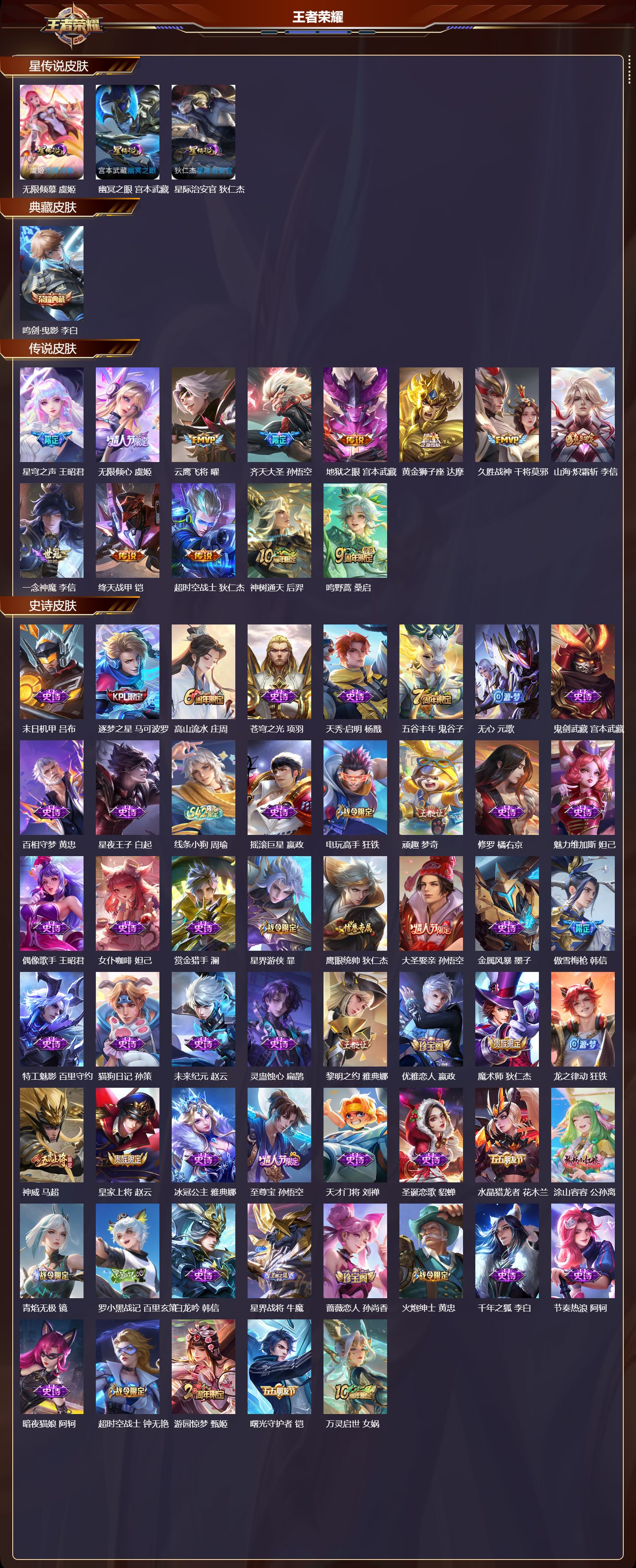 【13,传说皮肤】,星穹之声,王昭君,无限倾心,虞姬,云鹰飞将,曜,齐天大圣,孙悟空,地狱之眼,宫本武藏,黄金狮子座,达摩,久胜战神,干将莫邪,山海·炽霜斩,李信,一念神魔,李信,绛天战甲,铠,超时空战士,狄仁杰,神树通天,后羿,鸣野蒿,桑启,