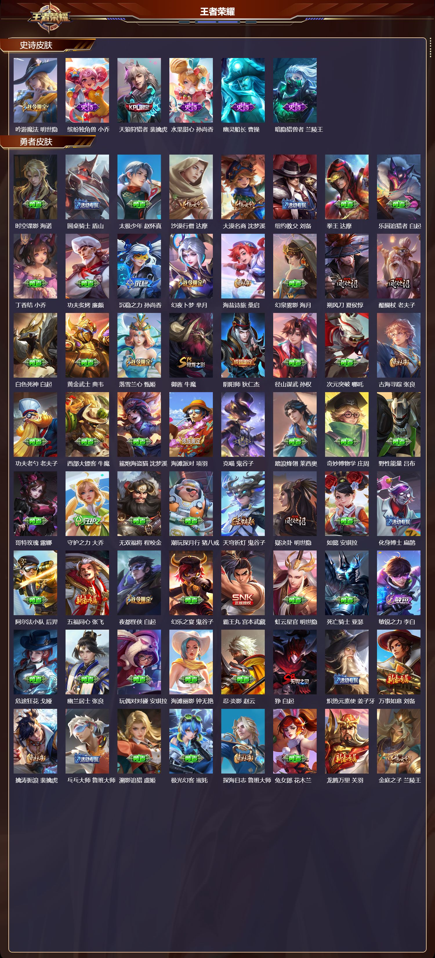 【59,史诗皮肤】,末日机甲,吕布,逐梦之星,马可波罗,高山流水,庄周,苍穹之光,项羽,天秀·启明,杨戬,五谷丰年,鬼谷子,无心,元歌,鬼剑武藏,宫本武藏,百相守梦,黄忠,星夜王子,白起,线条小狗,周瑜,摇滚巨星,嬴政,电玩高手,狂铁,顽趣,梦奇,修罗,橘右京,魅力维加斯,妲己,偶像歌手,王昭君,女仆咖啡,妲己,赏金猎手,澜,星界游侠,暃,鹰眼统帅,狄仁杰,大圣娶亲,孙悟空,金属风暴,墨子,傲雪梅枪,韩信,特工魅影,百里守约,猫狗日记,孙策,未来纪元,赵云,灵蛊蚀心,扁鹊,黎明之约,雅典娜,优雅恋人,嬴政,魔术师,狄仁杰,龙之律动,狂铁,神威,马超,皇家上将,赵云,冰冠公主,雅典娜,至尊宝,孙悟空,天才门将,刘禅,圣诞恋歌,貂蝉,水晶猎龙者,花木兰,涂山容容,公孙离,青焰无极,镜,罗小黑战记,百里玄策,白龙吟,韩信,星界战将,牛魔,蔷薇恋人,孙尚香,火炮绅士,黄忠,千年之狐,李白,节奏热浪,阿轲,暗夜猫娘,阿轲,超时空战士,钟无艳,游园惊梦,甄姬,曙光守护者,铠,万灵启世,女娲,吟游魔法,明世隐,缤纷独角兽,小乔,天狼狩猎者,裴擒虎,水果甜心,孙尚香,幽灵船长,曹操,暗隐猎兽者,兰陵王,