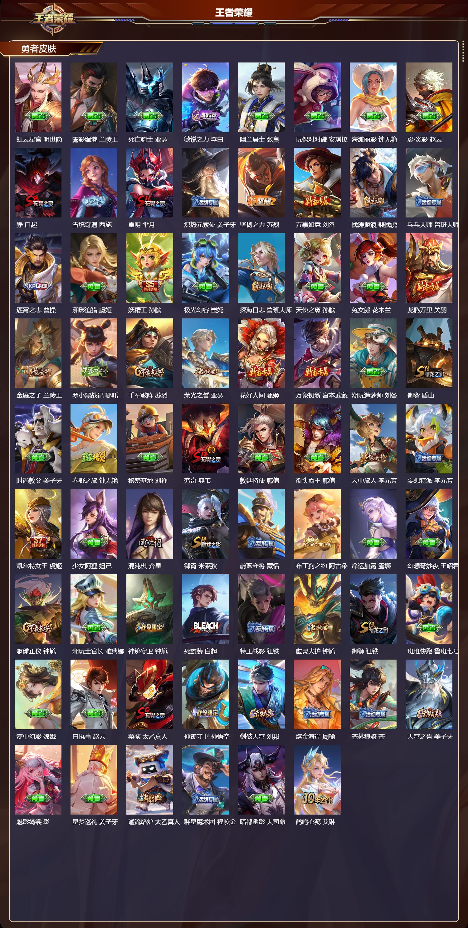 【134,勇者皮肤】,圆桌骑士,盾山,烛龙,曹操,爱心护理,阿轲,沙漠行僧,达摩,大漠名商,沈梦溪,暖冬絮语,程咬金,缤纷绘卷,张良,纽约教父,刘备,拳王,达摩,大发明家,达摩,龙舞盛年,沈梦溪,丁香结,小乔,功夫炙烤,廉颇,沉稳之力,孙尚香,爱与正义,程咬金,海盐诗旅,桑启,朔风刀,夏侯惇,醍醐杖,老夫子,朔望之晖,女娲,汉昭烈帝,刘备,热血海滩,哪吒,白色死神,白起,黄金武士,典韦,御旌,牛魔,阴阳师,狄仁杰,炼金王,扁鹊,径山谋武,孙权,次元突破,哪吒,古海寻踪,张良,戏梦巡演,空空儿,功夫老勺,老夫子,西部大镖客,牛魔,鲨炮海盗猫,沈梦溪,海滩派对,项羽,完美运算,后羿,万华元夜,狄仁杰,踏浪烽翎,莱西奥,演武夺筹,程咬金,红桃皇后,芈月,奇妙博物学,庄周,西部游侠,莱西奥,美猴王,孙悟空,猎兽之王,吕布,野性能量,吕布,哥特玫瑰,露娜,守护之力,大乔,无双福将,程咬金,原初探秘者,鬼谷子,潮玩探月行,猪八戒,天穹祈灯,鬼谷子,疑决卦,明世隐,如懿,安琪拉,化身博士,扁鹊,五福同心,张飞,幻乐之宴,鬼谷子,东方不败,武则天,霸王丸,宫本武藏,虹云星官,明世隐,雾影缉谜,兰陵王,死亡骑士,亚瑟,敏锐之力,李白,幽兰居士,张良,玩偶对对碰,安琪拉,海滩丽影,钟无艳,忍·炎影,赵云,狰,白起,雪境奇遇,西施,重明,芈月,炽热元素使,姜子牙,坚韧之力,苏烈,万事如意,刘备,擒涛扼浪,裴擒虎,乓乓大师,鲁班大师,逐霄之志,曹操,溯影追猎,虞姬,妖精王,孙膑,极光幻客,蚩奼,探海日志,鲁班大师,天使之翼,孙膑,兔女郎,花木兰,龙腾万里,关羽,金庭之子,兰陵王,罗小黑战记,哪吒,千军破阵,苏烈,荣光之誓,亚瑟,花好人间,甄姬,万象初新,宫本武藏,潮玩造梦师,刘备,御銮,盾山,时尚教父,姜子牙,春野之旅,钟无艳,秘密基地,刘禅,穷奇,典韦,教廷特使,韩信,街头霸王,韩信,云中旅人,李元芳,妄想特派,李元芳,凯尔特女王,虞姬,少女阿狸,妲己,混沌棋,弈星,御霄,米莱狄,蔚蓝守将,蒙恬,布丁狗之约,阿古朵,命运加冕,露娜,幻想奇妙夜,王昭君,驱傩正仪,钟馗,潮玩士官长,雅典娜,神迹守卫,钟馗,死霸装,白起,特工战影,狂铁,虚灵犬护,钟馗,御狮,狂铁,班班快跑,鲁班七号,漠中幻影,嫦娥,白执事,赵云,饕餮,太乙真人,神迹守卫,孙悟空,剑破天穹,刘邦,熔金海岸,周瑜,苍林狼骑,苍,天穹之誓,姜子牙,魅影绮裳,影,星梦巡礼,姜子牙,谧流熔炉,太乙真人,群星魔术团,程咬金,暗都幽影,大司命,鹤鸣心笺,艾琳,线条小狗,妲己,锦麟游梦,庄周,逆浪荇歌,甄姬,百相守梦,孙策,线条小狗,周瑜,噬灭天穹,东皇太一,景韶洛都,明世隐,