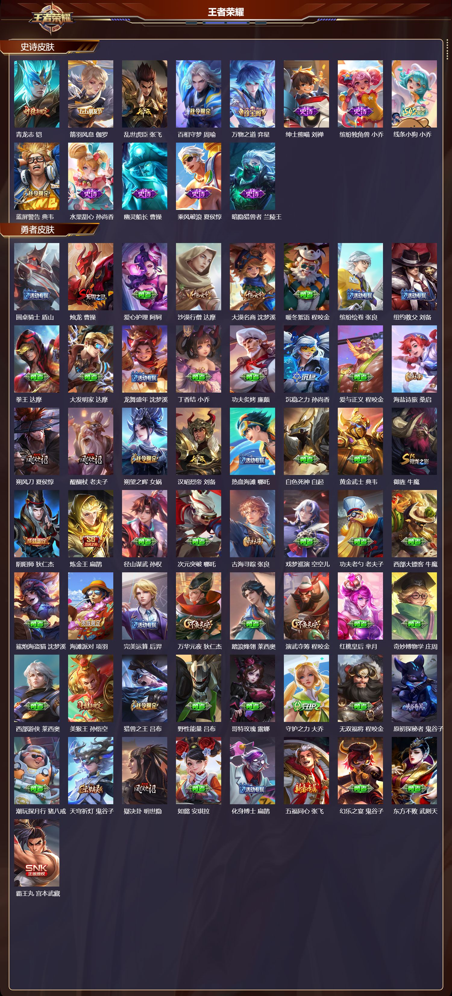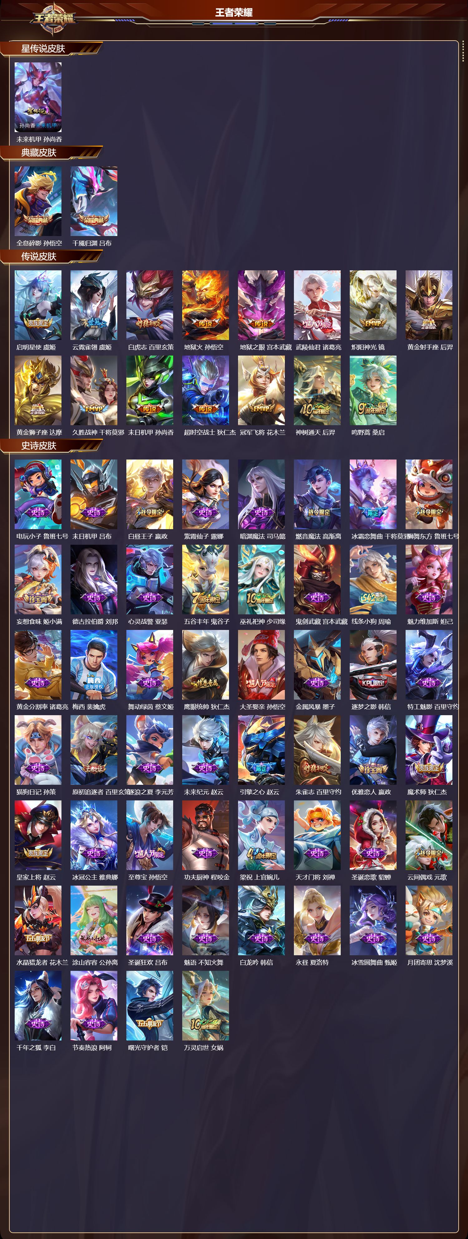 【65,史诗皮肤】,电玩小子,鲁班七号,末日机甲,吕布,白昼王子,嬴政,紫霞仙子,露娜,暗渊魔法,司马懿,燃音魔法,高渐离,冰霜恋舞曲,干将莫邪,狮舞东方,鲁班七号,妄想食味,姬小满,德古拉伯爵,刘邦,心灵战警,亚瑟,五谷丰年,鬼谷子,巫礼祀神,少司缘,鬼剑武藏,宫本武藏,线条小狗,周瑜,魅力维加斯,妲己,黄金分割率,诸葛亮,梅西,裴擒虎,舞动绿茵,蔡文姬,鹰眼统帅,狄仁杰,大圣娶亲,孙悟空,金属风暴,墨子,逐梦之影,韩信,特工魅影,百里守约,猫狗日记,孙策,原初追逐者,百里玄策,逐浪之夏,李元芳,未来纪元,赵云,引擎之心,赵云,朱雀志,百里守约,优雅恋人,嬴政,魔术师,狄仁杰,皇家上将,赵云,冰冠公主,雅典娜,至尊宝,孙悟空,功夫厨神,程咬金,梁祝,上官婉儿,天才门将,刘禅,圣诞恋歌,貂蝉,云间偶戏,元歌,水晶猎龙者,花木兰,涂山容容,公孙离,圣诞狂欢,吕布,魅语,不知火舞,白龙吟,韩信,永昼,夏洛特,冰雪圆舞曲,甄姬,月团寄思,沈梦溪,千年之狐,李白,节奏热浪,阿轲,曙光守护者,铠,万灵启世,女娲,青龙志,铠,箭羽风息,伽罗,乱世虎臣,张飞,百相守梦,周瑜,万物之道,弈星,绅士熊喵,刘禅,缤纷独角兽,小乔,线条小狗,小乔,蓝屏警告,典韦,水果甜心,孙尚香,幽灵船长,曹操,乘风破浪,夏侯惇,暗隐猎兽者,兰陵王,