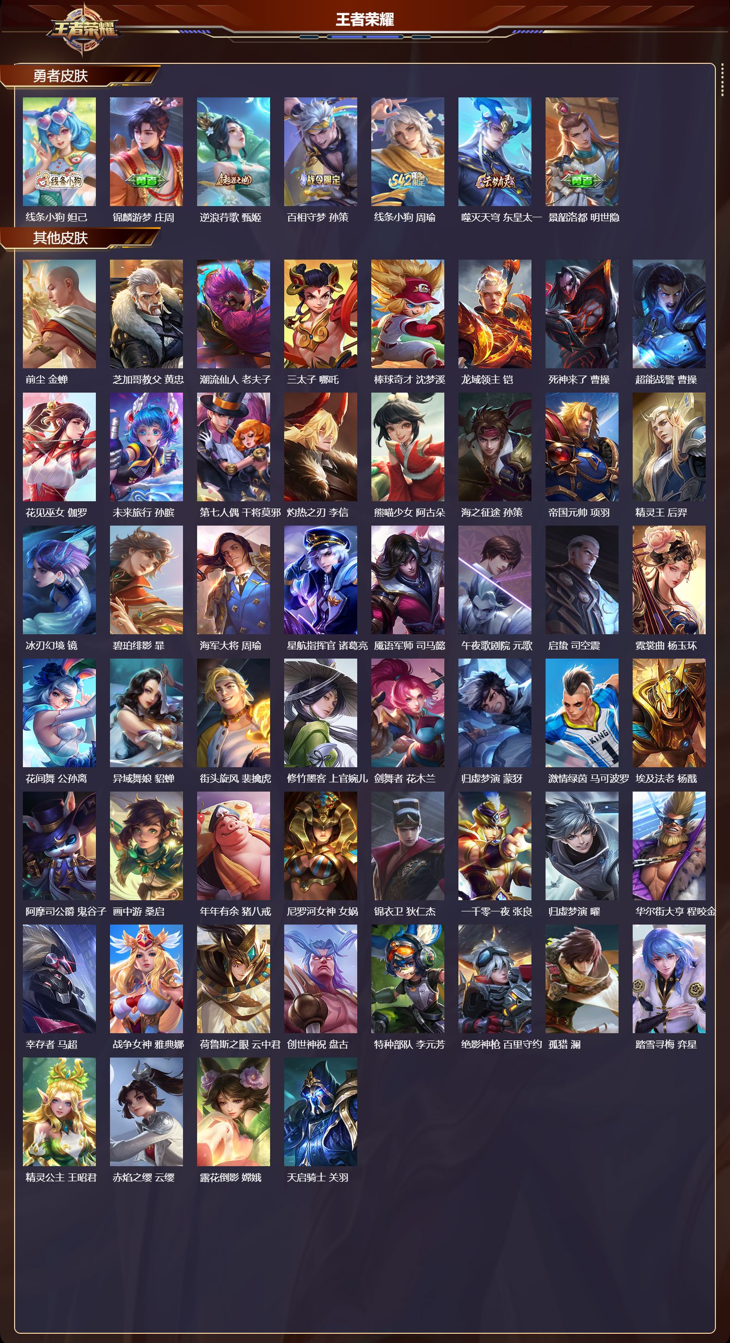 【52,其他皮肤】,前尘,金蝉,芝加哥教父,黄忠,潮流仙人,老夫子,三太子,哪吒,棒球奇才,沈梦溪,龙域领主,铠,死神来了,曹操,超能战警,曹操,花见巫女,伽罗,未来旅行,孙膑,第七人偶,干将莫邪,灼热之刃,李信,熊喵少女,阿古朵,海之征途,孙策,帝国元帅,项羽,精灵王,后羿,冰刃幻境,镜,碧珀绯影,暃,海军大将,周瑜,星航指挥官,诸葛亮,魇语军师,司马懿,午夜歌剧院,元歌,启蛰,司空震,霓裳曲,杨玉环,花间舞,公孙离,异域舞娘,貂蝉,街头旋风,裴擒虎,修竹墨客,上官婉儿,剑舞者,花木兰,归虚梦演,蒙犽,激情绿茵,马可波罗,埃及法老,杨戬,阿摩司公爵,鬼谷子,画中游,桑启,年年有余,猪八戒,尼罗河女神,女娲,锦衣卫,狄仁杰,一千零一夜,张良,归虚梦演,曜,华尔街大亨,程咬金,幸存者,马超,战争女神,雅典娜,荷鲁斯之眼,云中君,创世神祝,盘古,特种部队,李元芳,绝影神枪,百里守约,孤猎,澜,踏雪寻梅,弈星,精灵公主,王昭君,赤焰之缨,云缨,露花倒影,嫦娥,天启骑士,关羽,