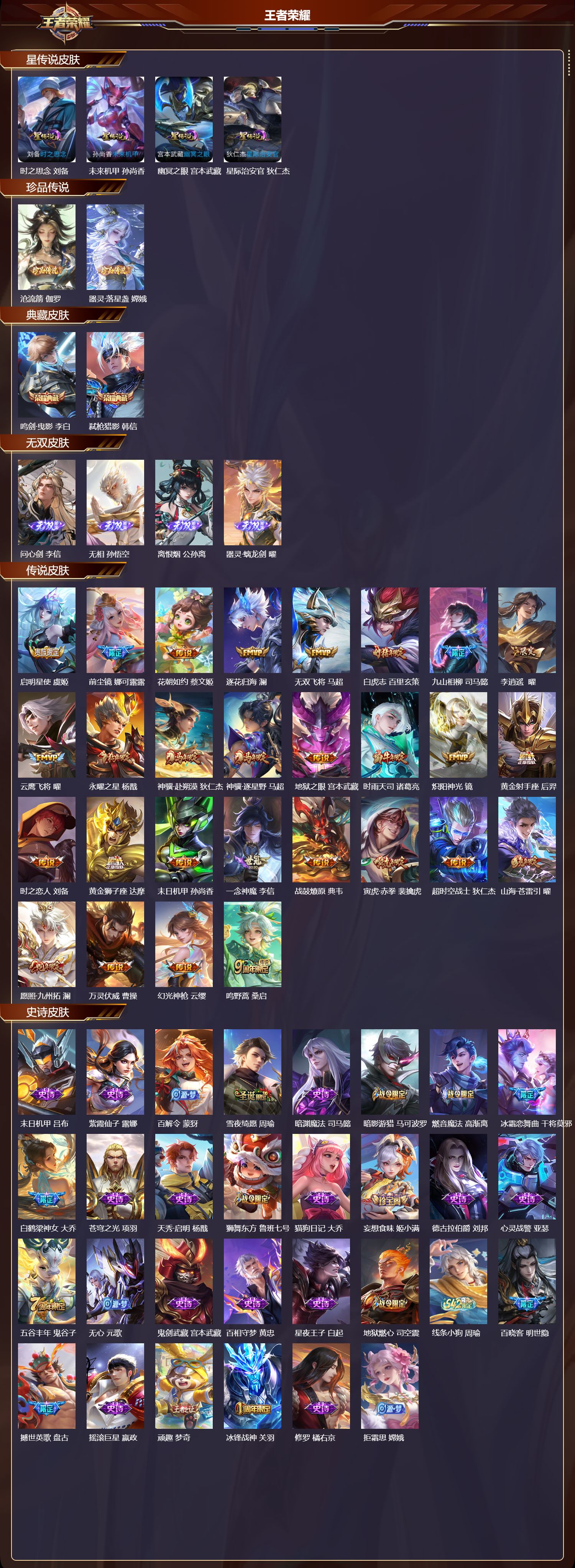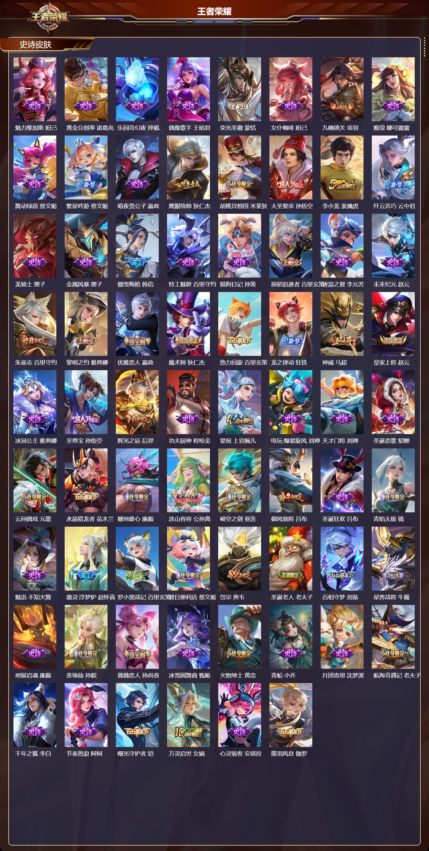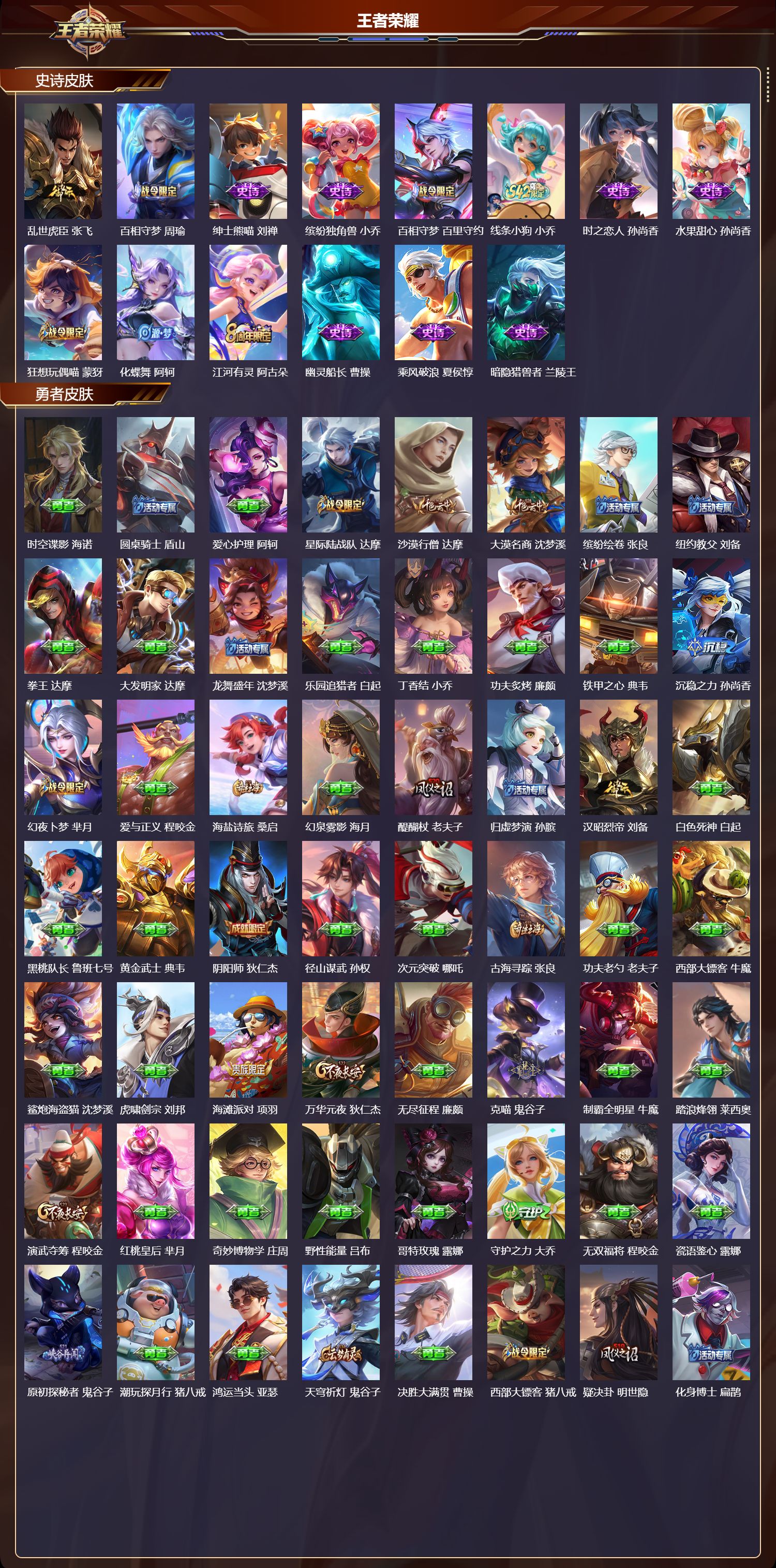 【114,史诗皮肤】,末日机甲,吕布,紫霞仙子,露娜,百解令,蒙犽,雪夜绮愿,周瑜,暗渊魔法,司马懿,暗影游猎,马可波罗,燃音魔法,高渐离,冰霜恋舞曲,干将莫邪,白鹤梁神女,大乔,苍穹之光,项羽,天秀·启明,杨戬,狮舞东方,鲁班七号,猫狗日记,大乔,妄想食味,姬小满,德古拉伯爵,刘邦,心灵战警,亚瑟,五谷丰年,鬼谷子,无心,元歌,鬼剑武藏,宫本武藏,百相守梦,黄忠,星夜王子,白起,地狱燃心,司空震,线条小狗,周瑜,百晓客,明世隐,撼世英歌,盘古,摇滚巨星,嬴政,顽趣,梦奇,冰锋战神,关羽,修罗,橘右京,拒霜思,嫦娥,魅力维加斯,妲己,黄金分割率,诸葛亮,乐园奇幻夜,钟馗,偶像歌手,王昭君,荣光圣徽,蒙恬,女仆咖啡,妲己,九幽镇关,项羽,晚萤,娜可露露,舞动绿茵,蔡文姬,繁星吟游,蔡文姬,暗夜贵公子,嬴政,鹰眼统帅,狄仁杰,胡桃异想国,米莱狄,大圣娶亲,孙悟空,李小龙,裴擒虎,纤云弄巧,云中君,龙骑士,墨子,金属风暴,墨子,傲雪梅枪,韩信,特工魅影,百里守约,猫狗日记,孙策,原初追逐者,百里玄策,逐浪之夏,李元芳,未来纪元,赵云,朱雀志,百里守约,黎明之约,雅典娜,优雅恋人,嬴政,魔术师,狄仁杰,热力回旋,百里玄策,龙之律动,狂铁,神威,马超,皇家上将,赵云,冰冠公主,雅典娜,至尊宝,孙悟空,辉光之辰,后羿,功夫厨神,程咬金,梁祝,上官婉儿,电玩·爆裂旋风,刘禅,天才门将,刘禅,圣诞恋歌,貂蝉,云间偶戏,元歌,水晶猎龙者,花木兰,撼地雄心,廉颇,涂山容容,公孙离,破空之剑,亚连,御风骁将,吕布,圣诞狂欢,吕布,青焰无极,镜,魅语,不知火舞,器灵·浮梦炉,赵怀真,罗小黑战记,百里玄策,夏日便利店,蔡文姬,岱宗,典韦,圣诞老人,老夫子,百相守梦,刘备,星界战将,牛魔,地狱岩魂,廉颇,茶境仙,孙膑,蔷薇恋人,孙尚香,冰雪圆舞曲,甄姬,火炮绅士,黄忠,青蛇,小乔,月团寄思,沈梦溪,航海奇遇记,老夫子,千年之狐,李白,节奏热浪,阿轲,曙光守护者,铠,万灵启世,女娲,心灵骇客,安琪拉,箭羽风息,伽罗,乱世虎臣,张飞,百相守梦,周瑜,绅士熊喵,刘禅,缤纷独角兽,小乔,百相守梦,百里守约,线条小狗,小乔,时之恋人,孙尚香,水果甜心,孙尚香,狂想玩偶喵,蒙犽,化蝶舞,阿轲,江河有灵,阿古朵,幽灵船长,曹操,乘风破浪,夏侯惇,暗隐猎兽者,兰陵王,