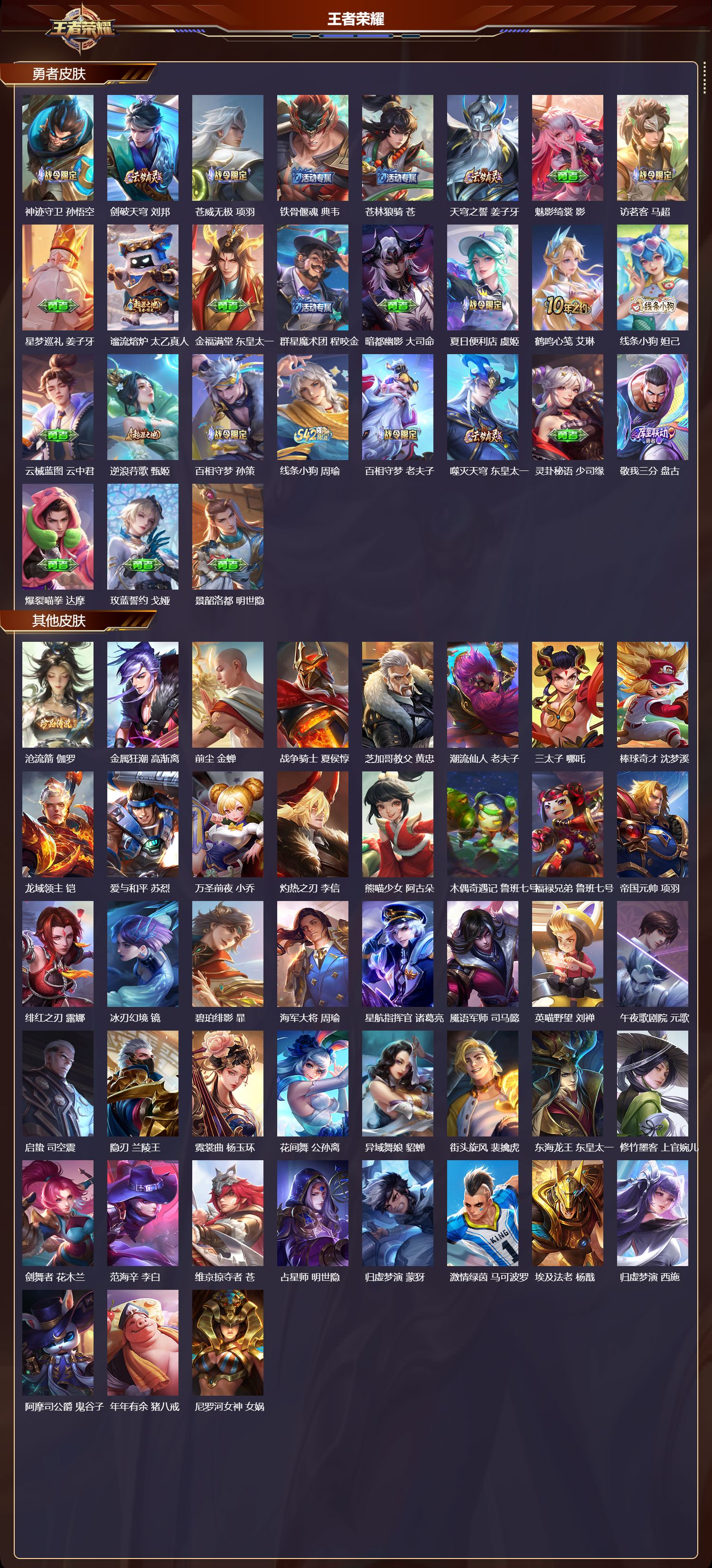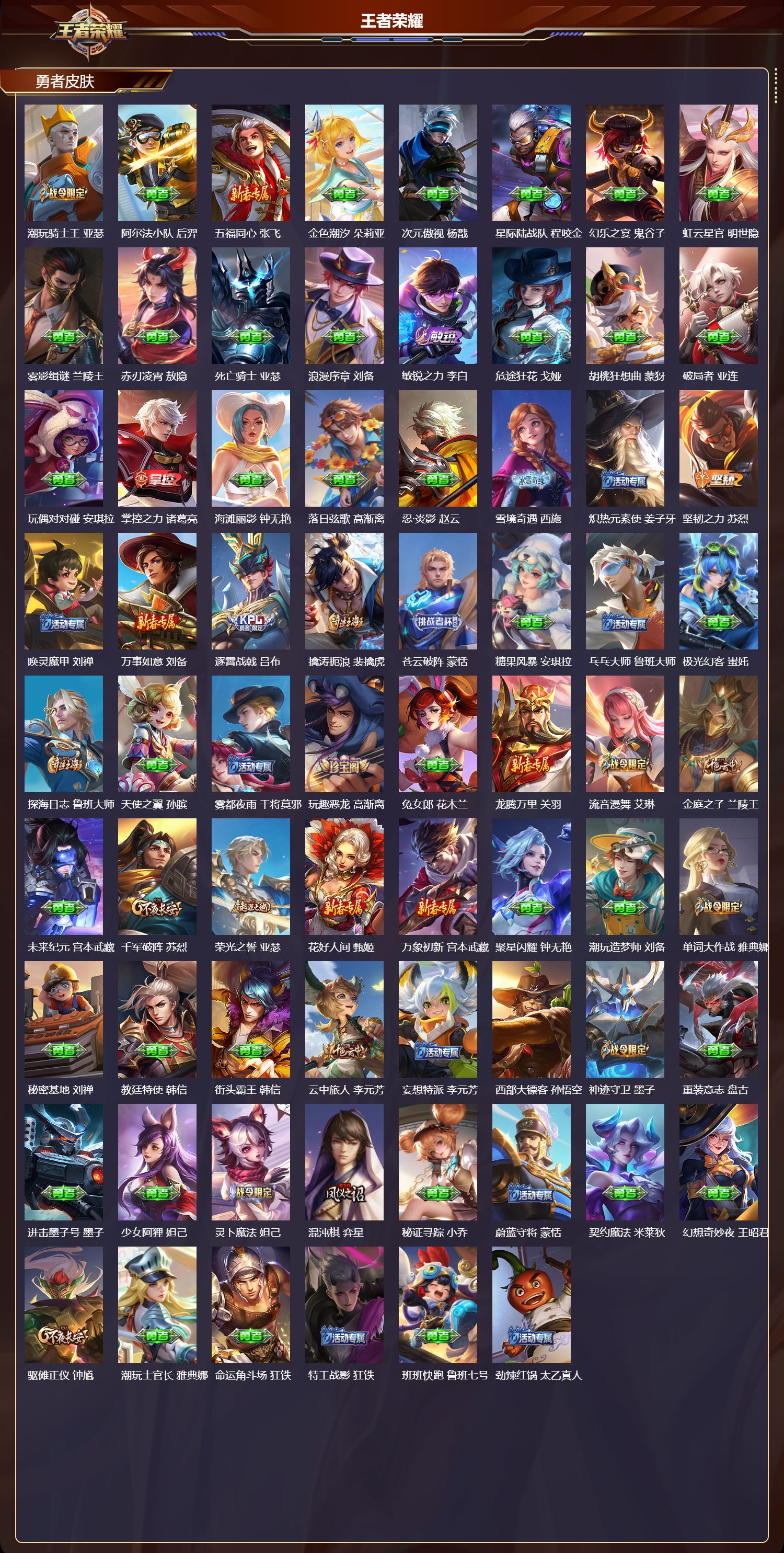 【153,勇者皮肤】,时空谍影,海诺,圆桌骑士,盾山,爱心护理,阿轲,星际陆战队,达摩,沙漠行僧,达摩,大漠名商,沈梦溪,缤纷绘卷,张良,纽约教父,刘备,拳王,达摩,大发明家,达摩,龙舞盛年,沈梦溪,乐园追猎者,白起,丁香结,小乔,功夫炙烤,廉颇,铁甲之心,典韦,沉稳之力,孙尚香,幻夜卜梦,芈月,爱与正义,程咬金,海盐诗旅,桑启,幻泉雾影,海月,醍醐杖,老夫子,归虚梦演,孙膑,汉昭烈帝,刘备,白色死神,白起,黑桃队长,鲁班七号,黄金武士,典韦,阴阳师,狄仁杰,径山谋武,孙权,次元突破,哪吒,古海寻踪,张良,功夫老勺,老夫子,西部大镖客,牛魔,鲨炮海盗猫,沈梦溪,虎啸剑宗,刘邦,海滩派对,项羽,万华元夜,狄仁杰,无尽征程,廉颇,克喵,鬼谷子,制霸全明星,牛魔,踏浪烽翎,莱西奥,演武夺筹,程咬金,红桃皇后,芈月,奇妙博物学,庄周,野性能量,吕布,哥特玫瑰,露娜,守护之力,大乔,无双福将,程咬金,瓷语鉴心,露娜,原初探秘者,鬼谷子,潮玩探月行,猪八戒,鸿运当头,亚瑟,天穹祈灯,鬼谷子,决胜大满贯,曹操,西部大镖客,猪八戒,疑决卦,明世隐,化身博士,扁鹊,潮玩骑士王,亚瑟,阿尔法小队,后羿,五福同心,张飞,金色潮汐,朵莉亚,次元傲视,杨戬,星际陆战队,程咬金,幻乐之宴,鬼谷子,虹云星官,明世隐,雾影缉谜,兰陵王,赤刃凌霄,敖隐,死亡骑士,亚瑟,浪漫序章,刘备,敏锐之力,李白,危途狂花,戈娅,胡桃狂想曲,蒙犽,破局者,亚连,玩偶对对碰,安琪拉,掌控之力,诸葛亮,海滩丽影,钟无艳,落日弦歌,高渐离,忍·炎影,赵云,雪境奇遇,西施,炽热元素使,姜子牙,坚韧之力,苏烈,唤灵魔甲,刘禅,万事如意,刘备,逐霄战戟,吕布,擒涛扼浪,裴擒虎,苍云破阵,蒙恬,糖果风暴,安琪拉,乓乓大师,鲁班大师,极光幻客,蚩奼,探海日志,鲁班大师,天使之翼,孙膑,雾都夜雨,干将莫邪,玩趣恶龙,高渐离,兔女郎,花木兰,龙腾万里,关羽,流音漫舞,艾琳,金庭之子,兰陵王,未来纪元,宫本武藏,千军破阵,苏烈,荣光之誓,亚瑟,花好人间,甄姬,万象初新,宫本武藏,聚星闪耀,钟无艳,潮玩造梦师,刘备,单词大作战,雅典娜,秘密基地,刘禅,教廷特使,韩信,街头霸王,韩信,云中旅人,李元芳,妄想特派,李元芳,西部大镖客,孙悟空,神迹守卫,墨子,重装意志,盘古,进击墨子号,墨子,少女阿狸,妲己,灵卜魔法,妲己,混沌棋,弈星,秘证寻踪,小乔,蔚蓝守将,蒙恬,契约魔法,米莱狄,幻想奇妙夜,王昭君,驱傩正仪,钟馗,潮玩士官长,雅典娜,命运角斗场,狂铁,特工战影,狂铁,班班快跑,鲁班七号,劲辣红锅,太乙真人,神迹守卫,孙悟空,剑破天穹,刘邦,苍威无极,项羽,铁骨偃魂,典韦,苍林狼骑,苍,天穹之誓,姜子牙,魅影绮裳,影,访茗客,马超,星梦巡礼,姜子牙,谧流熔炉,太乙真人,金福满堂,东皇太一,群星魔术团,程咬金,暗都幽影,大司命,夏日便利店,虞姬,鹤鸣心笺,艾琳,线条小狗,妲己,云械蓝图,云中君,逆浪荇歌,甄姬,百相守梦,孙策,线条小狗,周瑜,百相守梦,老夫子,噬灭天穹,东皇太一,灵卦秘语,少司缘,敬我三分,盘古,爆裂喵拳,达摩,玫蓝誓约,戈娅,景韶洛都,明世隐,