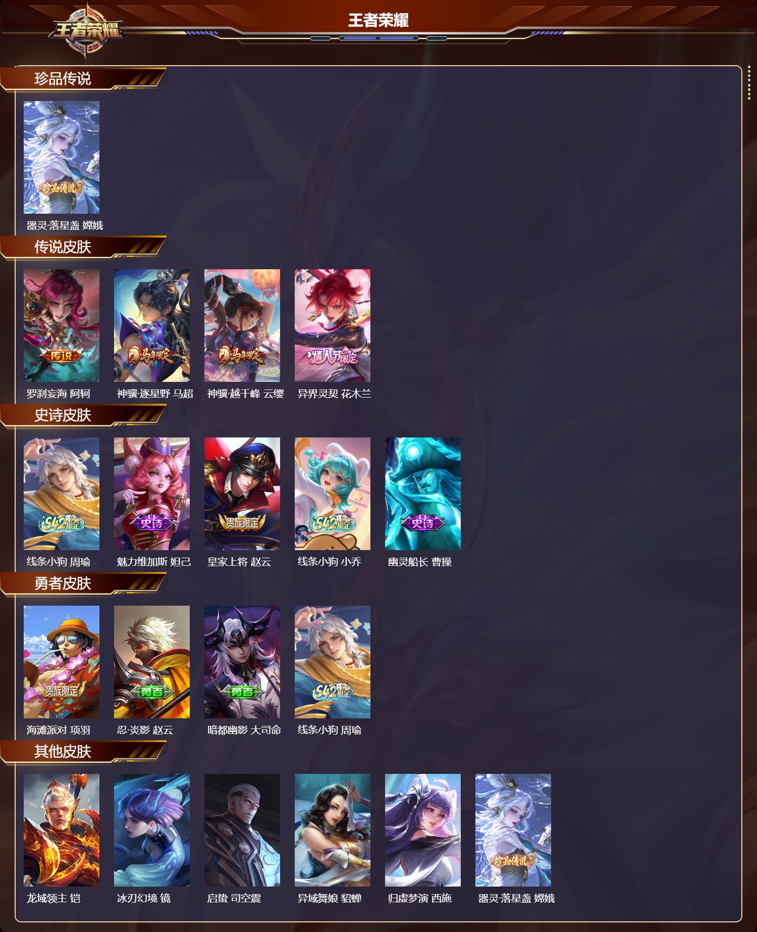 【5,史诗皮肤】,线条小狗,周瑜,魅力维加斯,妲己,皇家上将,赵云,线条小狗,小乔,幽灵船长,曹操,