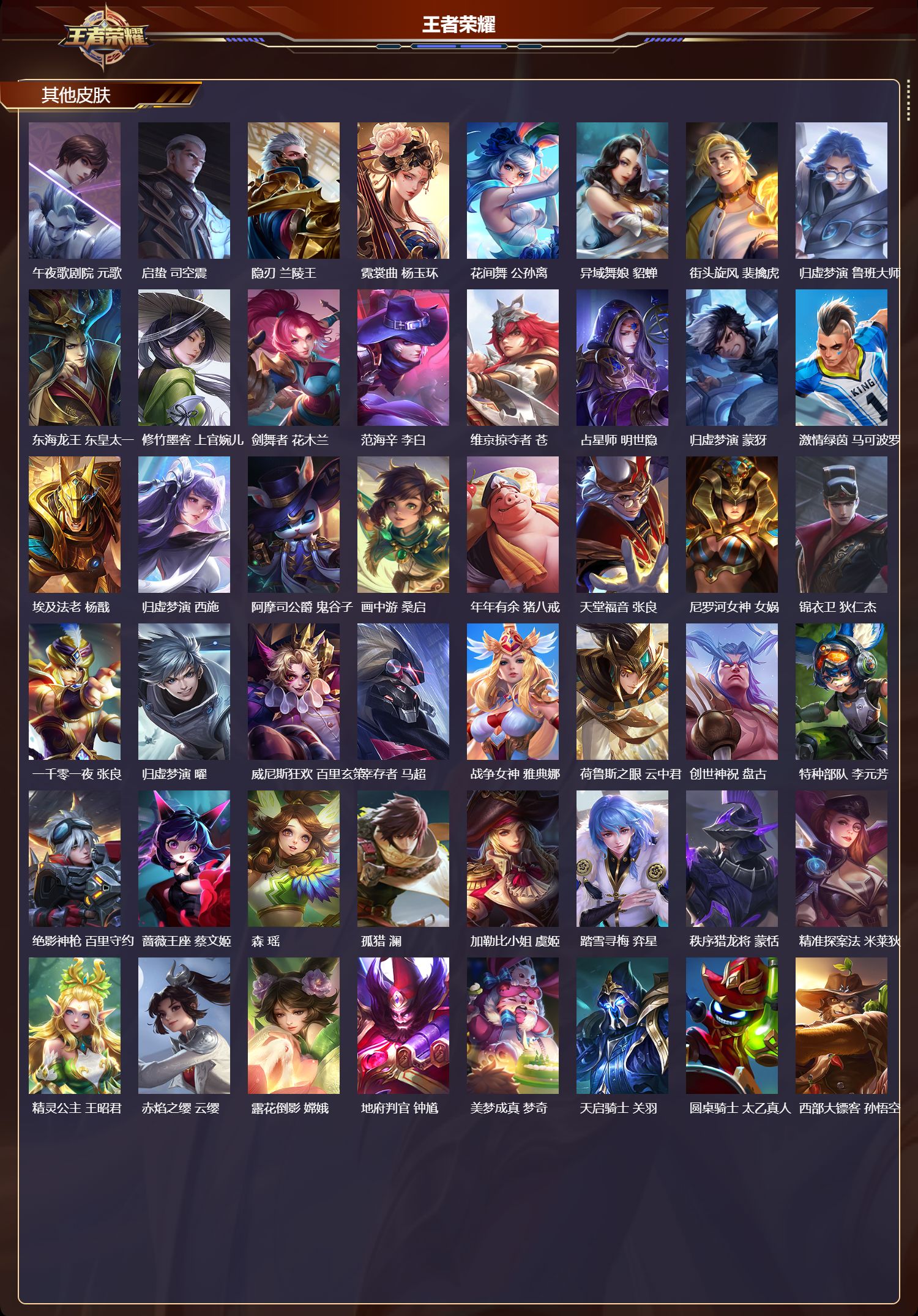 【80,其他皮肤】,伊势巫女,大乔,金属狂潮,高渐离,前尘,金蝉,战争骑士,夏侯惇,圣殿之光,刘邦,芝加哥教父,黄忠,潮流仙人,老夫子,三太子,哪吒,棒球奇才,沈梦溪,极冰防御线,盾山,龙域领主,铠,生化警戒,钟无艳,超能战警,曹操,花见巫女,伽罗,爱与和平,苏烈,未来旅行,孙膑,第七人偶,干将莫邪,万圣前夜,小乔,灼热之刃,李信,熊喵少女,阿古朵,海之征途,孙策,木偶奇遇记,鲁班七号,福禄兄弟,鲁班七号,帝国元帅,项羽,精灵王,后羿,绯红之刃,露娜,冰刃幻境,镜,碧珀绯影,暃,海军大将,周瑜,星航指挥官,诸葛亮,魇语军师,司马懿,英喵野望,刘禅,午夜歌剧院,元歌,启蛰,司空震,隐刃,兰陵王,霓裳曲,杨玉环,花间舞,公孙离,异域舞娘,貂蝉,街头旋风,裴擒虎,归虚梦演,鲁班大师,东海龙王,东皇太一,修竹墨客,上官婉儿,剑舞者,花木兰,范海辛,李白,维京掠夺者,苍,占星师,明世隐,归虚梦演,蒙犽,激情绿茵,马可波罗,埃及法老,杨戬,归虚梦演,西施,阿摩司公爵,鬼谷子,画中游,桑启,年年有余,猪八戒,天堂福音,张良,尼罗河女神,女娲,锦衣卫,狄仁杰,一千零一夜,张良,归虚梦演,曜,威尼斯狂欢,百里玄策,幸存者,马超,战争女神,雅典娜,荷鲁斯之眼,云中君,创世神祝,盘古,特种部队,李元芳,绝影神枪,百里守约,蔷薇王座,蔡文姬,森,瑶,孤猎,澜,加勒比小姐,虞姬,踏雪寻梅,弈星,秩序猎龙将,蒙恬,精准探案法,米莱狄,精灵公主,王昭君,赤焰之缨,云缨,露花倒影,嫦娥,地府判官,钟馗,美梦成真,梦奇,天启骑士,关羽,圆桌骑士,太乙真人,西部大镖客,孙悟空,