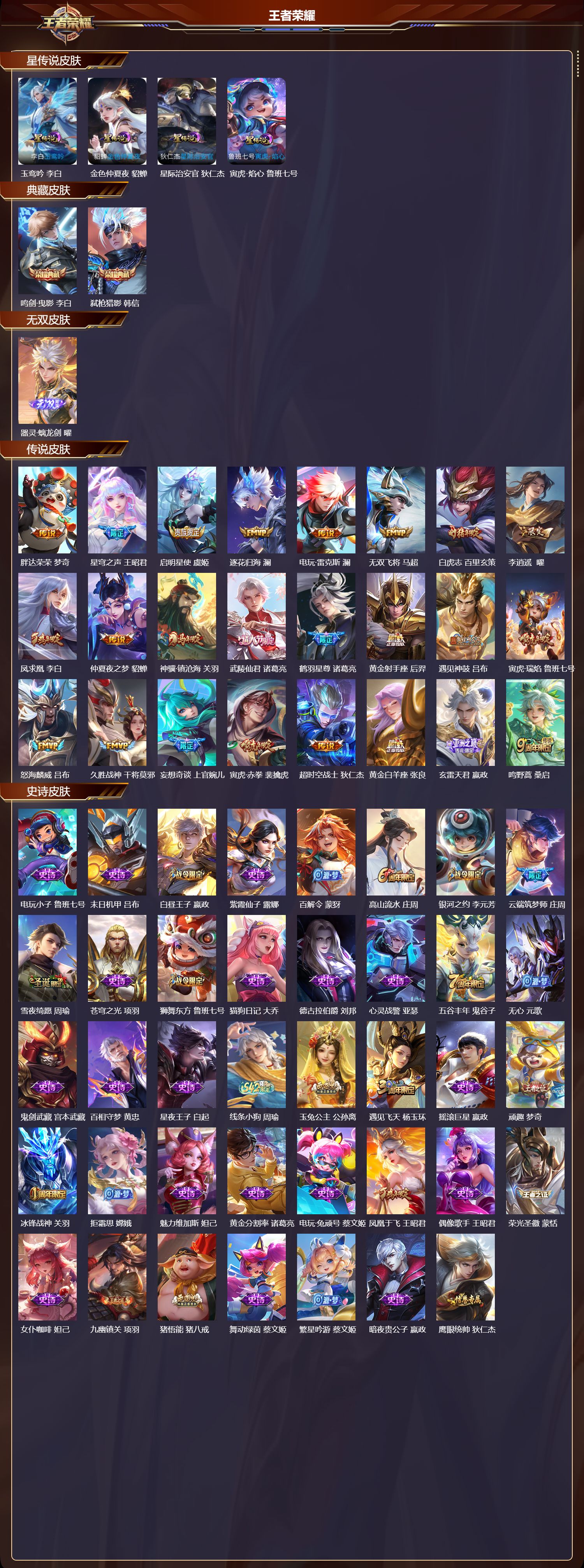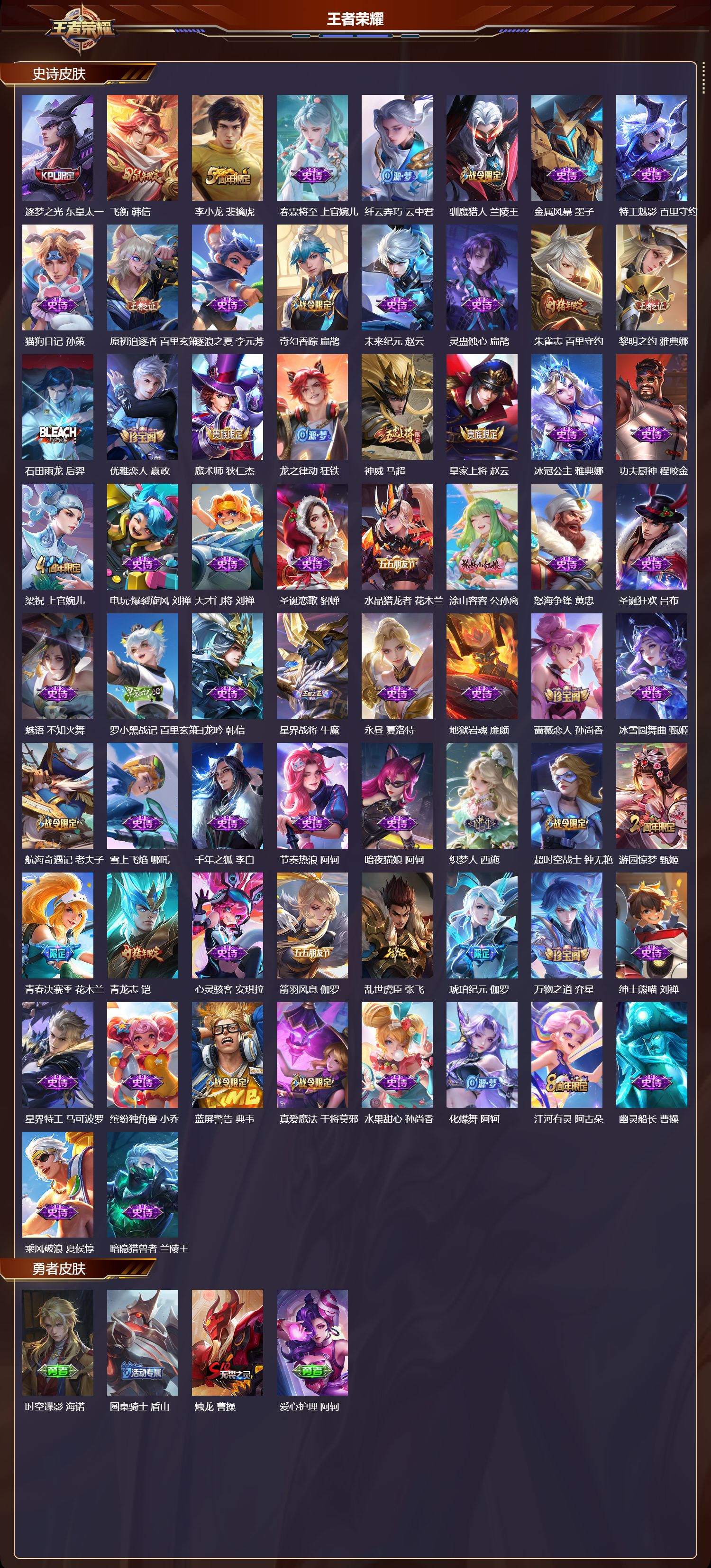【105,史诗皮肤】,电玩小子,鲁班七号,末日机甲,吕布,白昼王子,嬴政,紫霞仙子,露娜,百解令,蒙犽,高山流水,庄周,银河之约,李元芳,云端筑梦师,庄周,雪夜绮愿,周瑜,苍穹之光,项羽,狮舞东方,鲁班七号,猫狗日记,大乔,德古拉伯爵,刘邦,心灵战警,亚瑟,五谷丰年,鬼谷子,无心,元歌,鬼剑武藏,宫本武藏,百相守梦,黄忠,星夜王子,白起,线条小狗,周瑜,玉兔公主,公孙离,遇见飞天,杨玉环,摇滚巨星,嬴政,顽趣,梦奇,冰锋战神,关羽,拒霜思,嫦娥,魅力维加斯,妲己,黄金分割率,诸葛亮,电玩·兔顽号,蔡文姬,凤凰于飞,王昭君,偶像歌手,王昭君,荣光圣徽,蒙恬,女仆咖啡,妲己,九幽镇关,项羽,猪悟能,猪八戒,舞动绿茵,蔡文姬,繁星吟游,蔡文姬,暗夜贵公子,嬴政,鹰眼统帅,狄仁杰,逐梦之光,东皇太一,飞衡,韩信,李小龙,裴擒虎,春霖将至,上官婉儿,纤云弄巧,云中君,驯魔猎人,兰陵王,金属风暴,墨子,特工魅影,百里守约,猫狗日记,孙策,原初追逐者,百里玄策,逐浪之夏,李元芳,奇幻香踪,扁鹊,未来纪元,赵云,灵蛊蚀心,扁鹊,朱雀志,百里守约,黎明之约,雅典娜,石田雨龙,后羿,优雅恋人,嬴政,魔术师,狄仁杰,龙之律动,狂铁,神威,马超,皇家上将,赵云,冰冠公主,雅典娜,功夫厨神,程咬金,梁祝,上官婉儿,电玩·爆裂旋风,刘禅,天才门将,刘禅,圣诞恋歌,貂蝉,水晶猎龙者,花木兰,涂山容容,公孙离,怒海争锋,黄忠,圣诞狂欢,吕布,魅语,不知火舞,罗小黑战记,百里玄策,白龙吟,韩信,星界战将,牛魔,永昼,夏洛特,地狱岩魂,廉颇,蔷薇恋人,孙尚香,冰雪圆舞曲,甄姬,航海奇遇记,老夫子,雪上飞焰,哪吒,千年之狐,李白,节奏热浪,阿轲,暗夜猫娘,阿轲,织梦人,西施,超时空战士,钟无艳,游园惊梦,甄姬,青春决赛季,花木兰,青龙志,铠,心灵骇客,安琪拉,箭羽风息,伽罗,乱世虎臣,张飞,琥珀纪元,伽罗,万物之道,弈星,绅士熊喵,刘禅,星界特工,马可波罗,缤纷独角兽,小乔,蓝屏警告,典韦,真爱魔法,干将莫邪,水果甜心,孙尚香,化蝶舞,阿轲,江河有灵,阿古朵,幽灵船长,曹操,乘风破浪,夏侯惇,暗隐猎兽者,兰陵王,