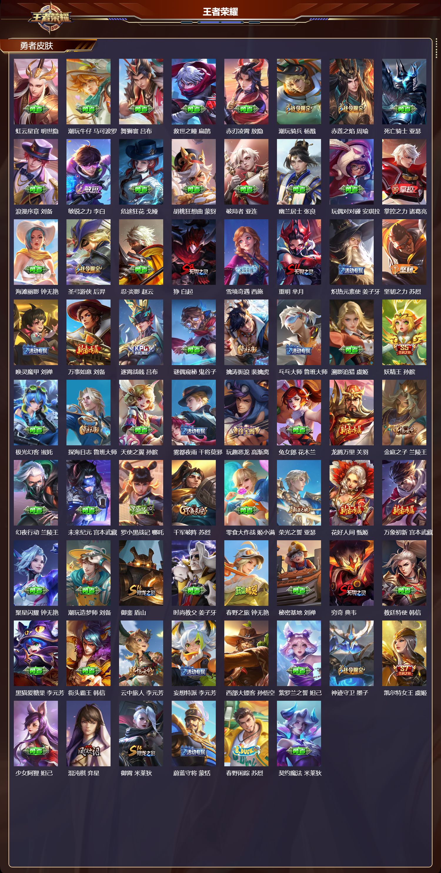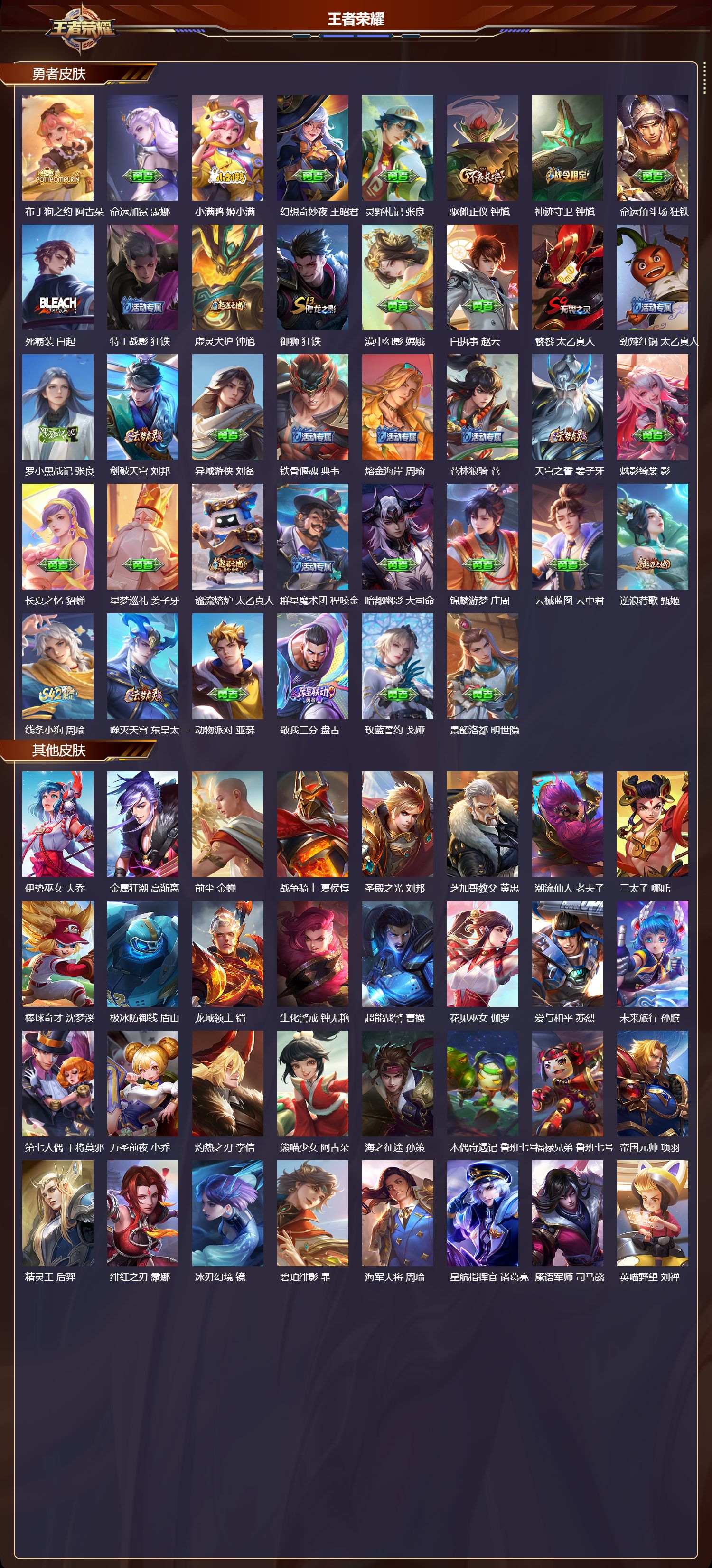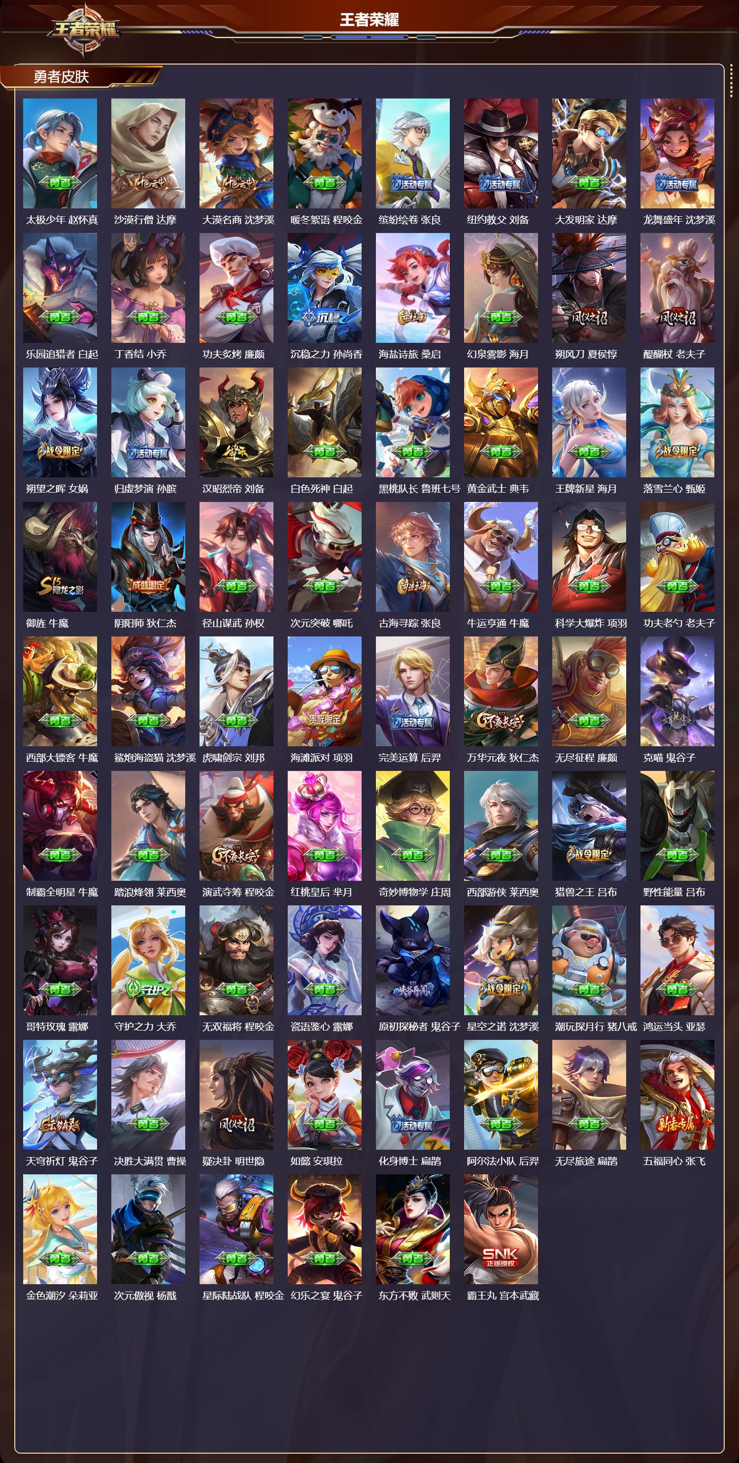 【182,勇者皮肤】,时空谍影,海诺,圆桌骑士,盾山,烛龙,曹操,爱心护理,阿轲,太极少年,赵怀真,沙漠行僧,达摩,大漠名商,沈梦溪,暖冬絮语,程咬金,缤纷绘卷,张良,纽约教父,刘备,大发明家,达摩,龙舞盛年,沈梦溪,乐园追猎者,白起,丁香结,小乔,功夫炙烤,廉颇,沉稳之力,孙尚香,海盐诗旅,桑启,幻泉雾影,海月,朔风刀,夏侯惇,醍醐杖,老夫子,朔望之晖,女娲,归虚梦演,孙膑,汉昭烈帝,刘备,白色死神,白起,黑桃队长,鲁班七号,黄金武士,典韦,王牌新星,海月,落雪兰心,甄姬,御旌,牛魔,阴阳师,狄仁杰,径山谋武,孙权,次元突破,哪吒,古海寻踪,张良,牛运亨通,牛魔,科学大爆炸,项羽,功夫老勺,老夫子,西部大镖客,牛魔,鲨炮海盗猫,沈梦溪,虎啸剑宗,刘邦,海滩派对,项羽,完美运算,后羿,万华元夜,狄仁杰,无尽征程,廉颇,克喵,鬼谷子,制霸全明星,牛魔,踏浪烽翎,莱西奥,演武夺筹,程咬金,红桃皇后,芈月,奇妙博物学,庄周,西部游侠,莱西奥,猎兽之王,吕布,野性能量,吕布,哥特玫瑰,露娜,守护之力,大乔,无双福将,程咬金,瓷语鉴心,露娜,原初探秘者,鬼谷子,星空之诺,沈梦溪,潮玩探月行,猪八戒,鸿运当头,亚瑟,天穹祈灯,鬼谷子,决胜大满贯,曹操,疑决卦,明世隐,如懿,安琪拉,化身博士,扁鹊,阿尔法小队,后羿,无尽旅途,扁鹊,五福同心,张飞,金色潮汐,朵莉亚,次元傲视,杨戬,星际陆战队,程咬金,幻乐之宴,鬼谷子,东方不败,武则天,霸王丸,宫本武藏,虹云星官,明世隐,潮玩牛仔,马可波罗,舞狮寰,吕布,救世之瞳,扁鹊,赤刃凌霄,敖隐,潮玩骑兵,杨戬,赤莲之焰,周瑜,死亡骑士,亚瑟,浪漫序章,刘备,敏锐之力,李白,危途狂花,戈娅,胡桃狂想曲,蒙犽,破局者,亚连,幽兰居士,张良,玩偶对对碰,安琪拉,掌控之力,诸葛亮,海滩丽影,钟无艳,圣弓游侠,后羿,忍·炎影,赵云,狰,白起,雪境奇遇,西施,重明,芈月,炽热元素使,姜子牙,坚韧之力,苏烈,唤灵魔甲,刘禅,万事如意,刘备,逐霄战戟,吕布,谜偶窥秘,鬼谷子,擒涛扼浪,裴擒虎,乓乓大师,鲁班大师,溯影追猎,虞姬,妖精王,孙膑,极光幻客,蚩奼,探海日志,鲁班大师,天使之翼,孙膑,雾都夜雨,干将莫邪,玩趣恶龙,高渐离,兔女郎,花木兰,龙腾万里,关羽,金庭之子,兰陵王,幻夜行动,兰陵王,未来纪元,宫本武藏,罗小黑战记,哪吒,千军破阵,苏烈,零食大作战,姬小满,荣光之誓,亚瑟,花好人间,甄姬,万象初新,宫本武藏,聚星闪耀,钟无艳,潮玩造梦师,刘备,御銮,盾山,时尚教父,姜子牙,春野之旅,钟无艳,秘密基地,刘禅,穷奇,典韦,教廷特使,韩信,黑猫爱糖果,李元芳,街头霸王,韩信,云中旅人,李元芳,妄想特派,李元芳,西部大镖客,孙悟空,紫罗兰之誓,妲己,神迹守卫,墨子,凯尔特女王,虞姬,少女阿狸,妲己,混沌棋,弈星,御霄,米莱狄,蔚蓝守将,蒙恬,春野闲踪,苏烈,契约魔法,米莱狄,布丁狗之约,阿古朵,命运加冕,露娜,小满鸭,姬小满,幻想奇妙夜,王昭君,灵野札记,张良,驱傩正仪,钟馗,神迹守卫,钟馗,命运角斗场,狂铁,死霸装,白起,特工战影,狂铁,虚灵犬护,钟馗,御狮,狂铁,漠中幻影,嫦娥,白执事,赵云,饕餮,太乙真人,劲辣红锅,太乙真人,罗小黑战记,张良,剑破天穹,刘邦,异域游侠,刘备,铁骨偃魂,典韦,熔金海岸,周瑜,苍林狼骑,苍,天穹之誓,姜子牙,魅影绮裳,影,长夏之忆,貂蝉,星梦巡礼,姜子牙,谧流熔炉,太乙真人,群星魔术团,程咬金,暗都幽影,大司命,锦麟游梦,庄周,云械蓝图,云中君,逆浪荇歌,甄姬,线条小狗,周瑜,噬灭天穹,东皇太一,动物派对,亚瑟,敬我三分,盘古,玫蓝誓约,戈娅,景韶洛都,明世隐,