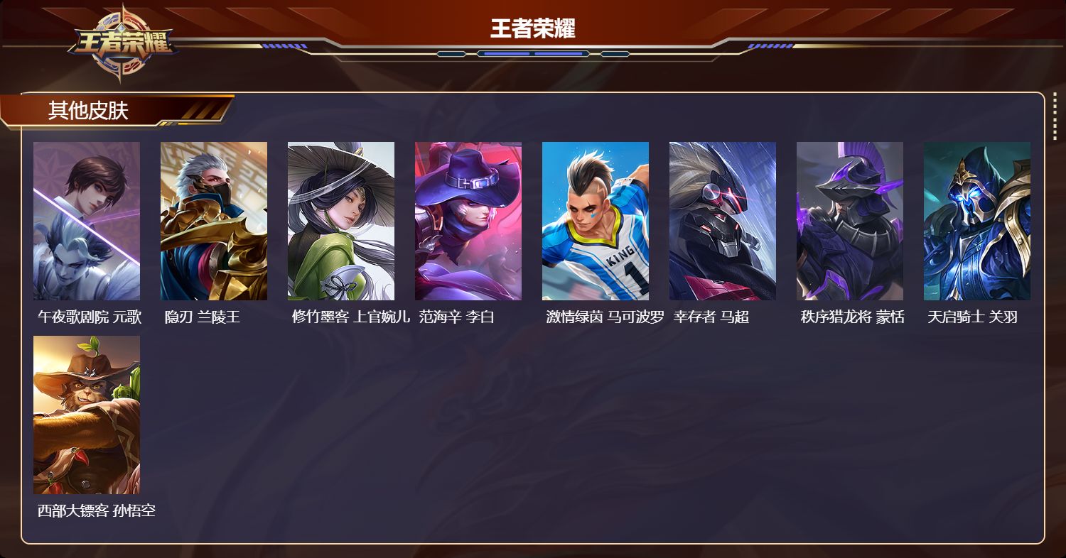 【15,其他皮肤】,芝加哥教父,黄忠,龙域领主,铠,灼热之刃,李信,福禄兄弟,鲁班七号,精灵王,后羿,魇语军师,司马懿,午夜歌剧院,元歌,隐刃,兰陵王,修竹墨客,上官婉儿,范海辛,李白,激情绿茵,马可波罗,幸存者,马超,秩序猎龙将,蒙恬,天启骑士,关羽,西部大镖客,孙悟空,