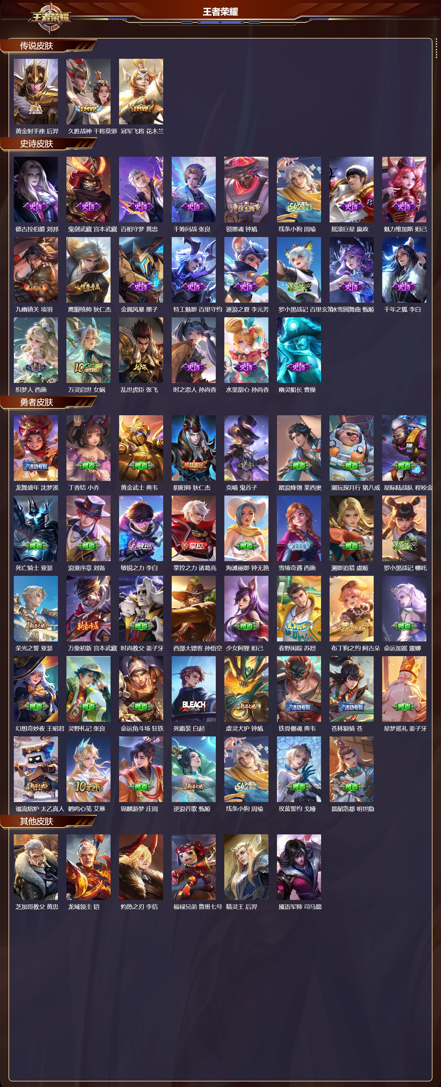 【39,勇者皮肤】,龙舞盛年,沈梦溪,丁香结,小乔,黄金武士,典韦,阴阳师,狄仁杰,克喵,鬼谷子,踏浪烽翎,莱西奥,潮玩探月行,猪八戒,星际陆战队,程咬金,死亡骑士,亚瑟,浪漫序章,刘备,敏锐之力,李白,掌控之力,诸葛亮,海滩丽影,钟无艳,雪境奇遇,西施,溯影追猎,虞姬,罗小黑战记,哪吒,荣光之誓,亚瑟,万象初新,宫本武藏,时尚教父,姜子牙,西部大镖客,孙悟空,少女阿狸,妲己,春野闲踪,苏烈,布丁狗之约,阿古朵,命运加冕,露娜,幻想奇妙夜,王昭君,灵野札记,张良,命运角斗场,狂铁,死霸装,白起,虚灵犬护,钟馗,铁骨偃魂,典韦,苍林狼骑,苍,星梦巡礼,姜子牙,谧流熔炉,太乙真人,鹤鸣心笺,艾琳,锦麟游梦,庄周,逆浪荇歌,甄姬,线条小狗,周瑜,玫蓝誓约,戈娅,景韶洛都,明世隐,