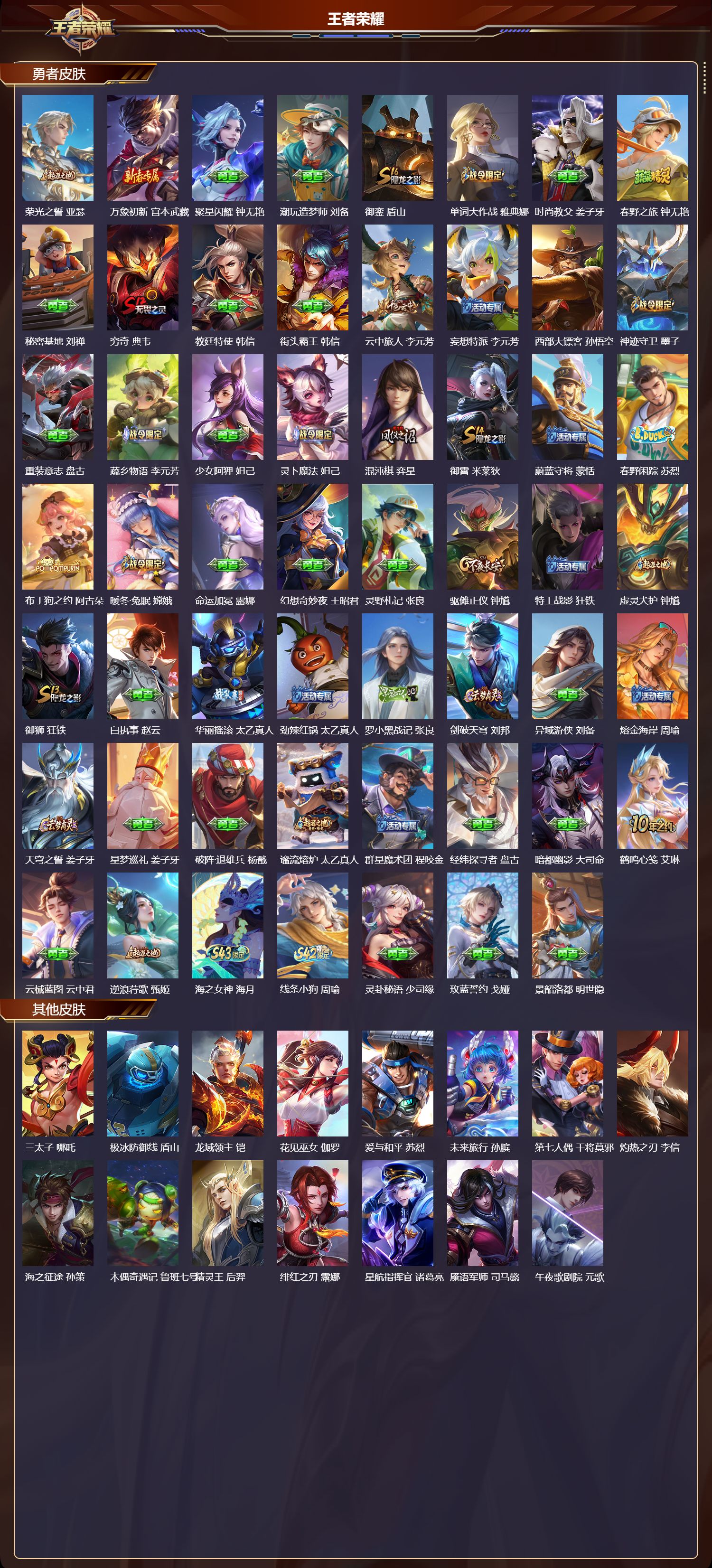 【42,其他皮肤】,三太子,哪吒,极冰防御线,盾山,龙域领主,铠,花见巫女,伽罗,爱与和平,苏烈,未来旅行,孙膑,第七人偶,干将莫邪,灼热之刃,李信,海之征途,孙策,木偶奇遇记,鲁班七号,精灵王,后羿,绯红之刃,露娜,星航指挥官,诸葛亮,魇语军师,司马懿,午夜歌剧院,元歌,启蛰,司空震,隐刃,兰陵王,花间舞,公孙离,街头旋风,裴擒虎,东海龙王,东皇太一,修竹墨客,上官婉儿,范海辛,李白,维京掠夺者,苍,激情绿茵,马可波罗,埃及法老,杨戬,年年有余,猪八戒,归虚梦演,曜,幸存者,马超,荷鲁斯之眼,云中君,创世神祝,盘古,绝影神枪,百里守约,森,瑶,孤猎,澜,加勒比小姐,虞姬,踏雪寻梅,弈星,秩序猎龙将,蒙恬,精灵公主,王昭君,赤焰之缨,云缨,露花倒影,嫦娥,地府判官,钟馗,美梦成真,梦奇,西部大镖客,孙悟空,