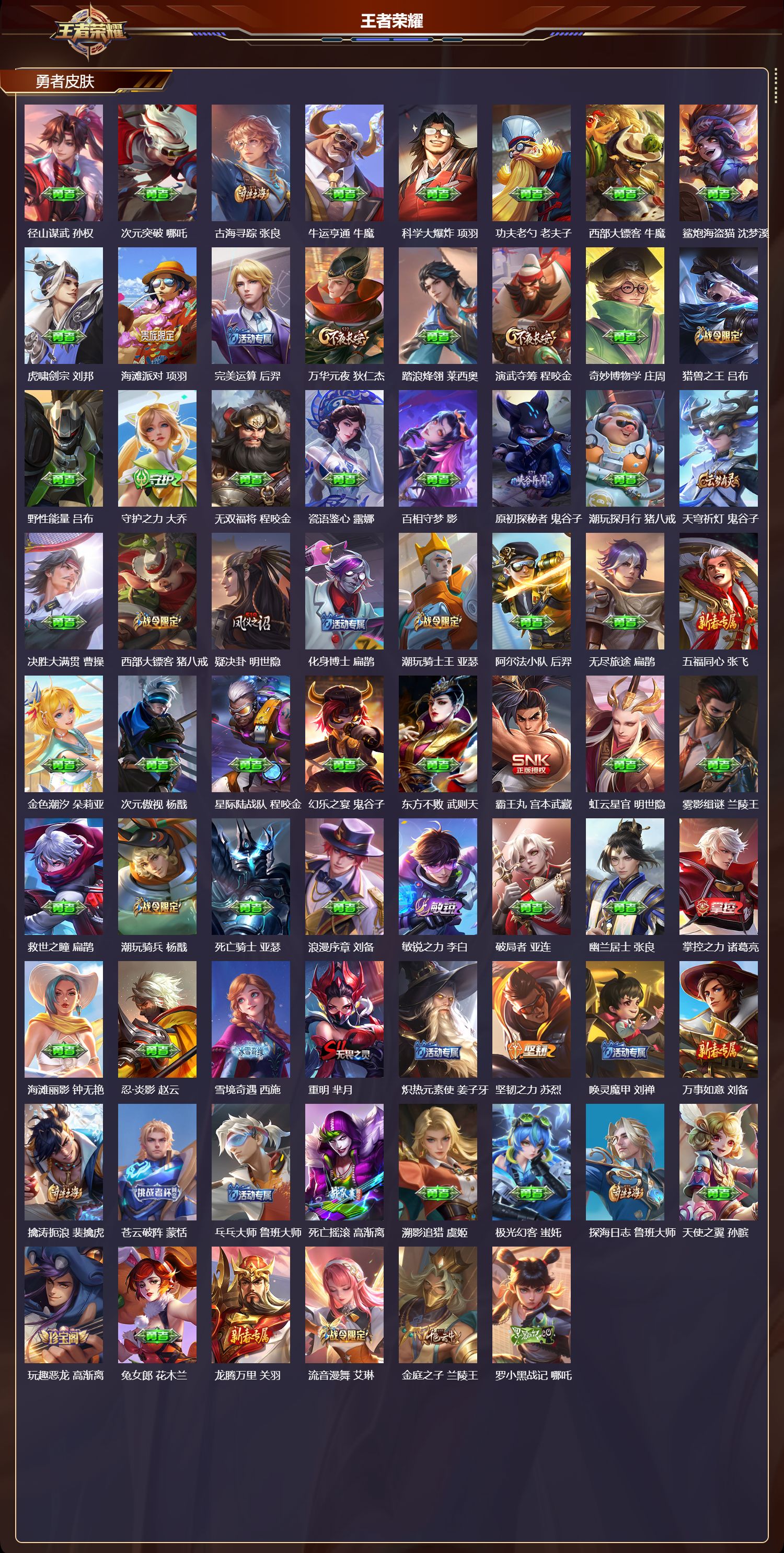 【155,勇者皮肤】,时空谍影,海诺,玲珑珍味,西施,圆桌骑士,盾山,烛龙,曹操,爱心护理,阿轲,太极少年,赵怀真,星际陆战队,达摩,沙漠行僧,达摩,暖冬絮语,程咬金,缤纷绘卷,张良,纽约教父,刘备,拳王,达摩,大发明家,达摩,龙舞盛年,沈梦溪,乐园追猎者,白起,功夫炙烤,廉颇,沉稳之力,孙尚香,幻夜卜梦,芈月,海盐诗旅,桑启,幻泉雾影,海月,朔风刀,夏侯惇,醍醐杖,老夫子,朔望之晖,女娲,归虚梦演,孙膑,汉昭烈帝,刘备,白色死神,白起,黑桃队长,鲁班七号,黄金武士,典韦,御旌,牛魔,阴阳师,狄仁杰,径山谋武,孙权,次元突破,哪吒,古海寻踪,张良,牛运亨通,牛魔,科学大爆炸,项羽,功夫老勺,老夫子,西部大镖客,牛魔,鲨炮海盗猫,沈梦溪,虎啸剑宗,刘邦,海滩派对,项羽,完美运算,后羿,万华元夜,狄仁杰,踏浪烽翎,莱西奥,演武夺筹,程咬金,奇妙博物学,庄周,猎兽之王,吕布,野性能量,吕布,守护之力,大乔,无双福将,程咬金,瓷语鉴心,露娜,百相守梦,影,原初探秘者,鬼谷子,潮玩探月行,猪八戒,天穹祈灯,鬼谷子,决胜大满贯,曹操,西部大镖客,猪八戒,疑决卦,明世隐,化身博士,扁鹊,潮玩骑士王,亚瑟,阿尔法小队,后羿,无尽旅途,扁鹊,五福同心,张飞,金色潮汐,朵莉亚,次元傲视,杨戬,星际陆战队,程咬金,幻乐之宴,鬼谷子,东方不败,武则天,霸王丸,宫本武藏,虹云星官,明世隐,雾影缉谜,兰陵王,救世之瞳,扁鹊,潮玩骑兵,杨戬,死亡骑士,亚瑟,浪漫序章,刘备,敏锐之力,李白,破局者,亚连,幽兰居士,张良,掌控之力,诸葛亮,海滩丽影,钟无艳,忍·炎影,赵云,雪境奇遇,西施,重明,芈月,炽热元素使,姜子牙,坚韧之力,苏烈,唤灵魔甲,刘禅,万事如意,刘备,擒涛扼浪,裴擒虎,苍云破阵,蒙恬,乓乓大师,鲁班大师,死亡摇滚,高渐离,溯影追猎,虞姬,极光幻客,蚩奼,探海日志,鲁班大师,天使之翼,孙膑,玩趣恶龙,高渐离,兔女郎,花木兰,龙腾万里,关羽,流音漫舞,艾琳,金庭之子,兰陵王,罗小黑战记,哪吒,荣光之誓,亚瑟,万象初新,宫本武藏,聚星闪耀,钟无艳,潮玩造梦师,刘备,御銮,盾山,单词大作战,雅典娜,时尚教父,姜子牙,春野之旅,钟无艳,秘密基地,刘禅,穷奇,典韦,教廷特使,韩信,街头霸王,韩信,云中旅人,李元芳,妄想特派,李元芳,西部大镖客,孙悟空,神迹守卫,墨子,重装意志,盘古,蔬乡物语,李元芳,少女阿狸,妲己,灵卜魔法,妲己,混沌棋,弈星,御霄,米莱狄,蔚蓝守将,蒙恬,春野闲踪,苏烈,布丁狗之约,阿古朵,暖冬·兔眠,嫦娥,命运加冕,露娜,幻想奇妙夜,王昭君,灵野札记,张良,驱傩正仪,钟馗,特工战影,狂铁,虚灵犬护,钟馗,御狮,狂铁,白执事,赵云,华丽摇滚,太乙真人,劲辣红锅,太乙真人,罗小黑战记,张良,剑破天穹,刘邦,异域游侠,刘备,熔金海岸,周瑜,天穹之誓,姜子牙,星梦巡礼,姜子牙,破阵·退雄兵,杨戬,谧流熔炉,太乙真人,群星魔术团,程咬金,经纬探寻者,盘古,暗都幽影,大司命,鹤鸣心笺,艾琳,云械蓝图,云中君,逆浪荇歌,甄姬,海之女神,海月,线条小狗,周瑜,灵卦秘语,少司缘,玫蓝誓约,戈娅,景韶洛都,明世隐,