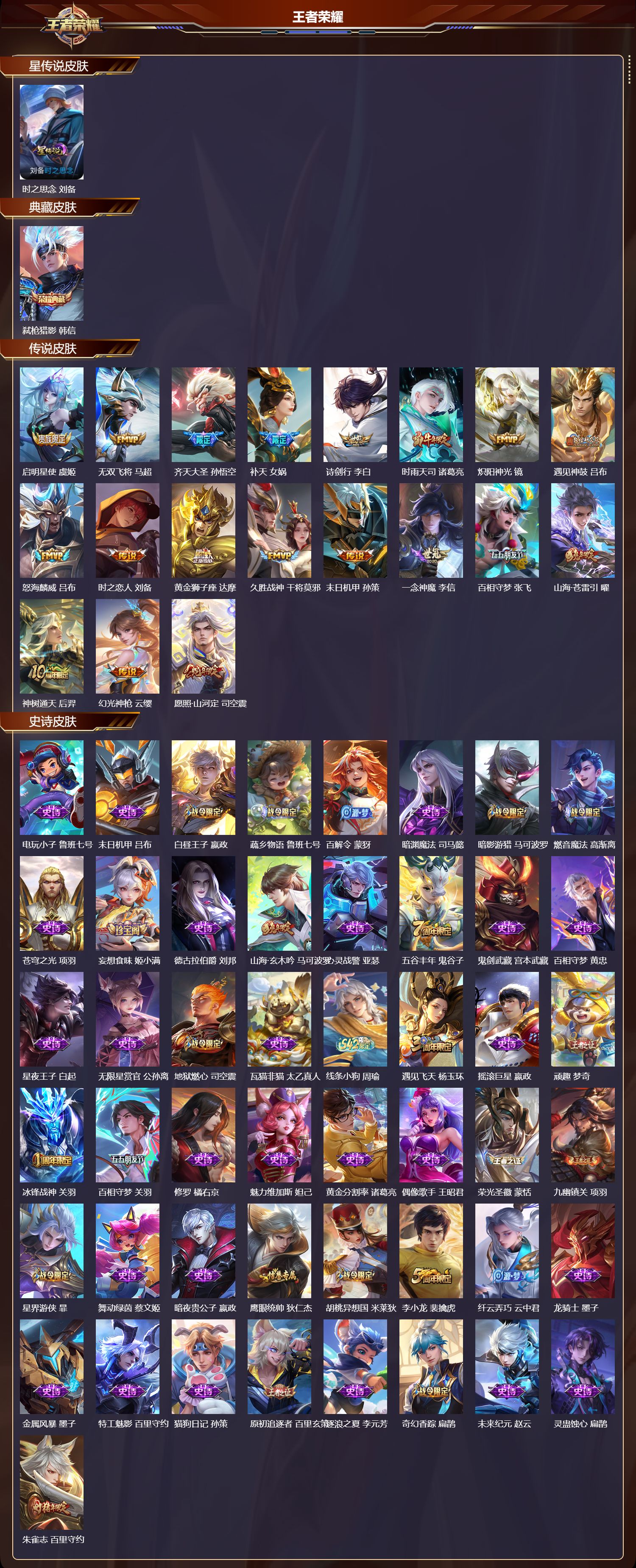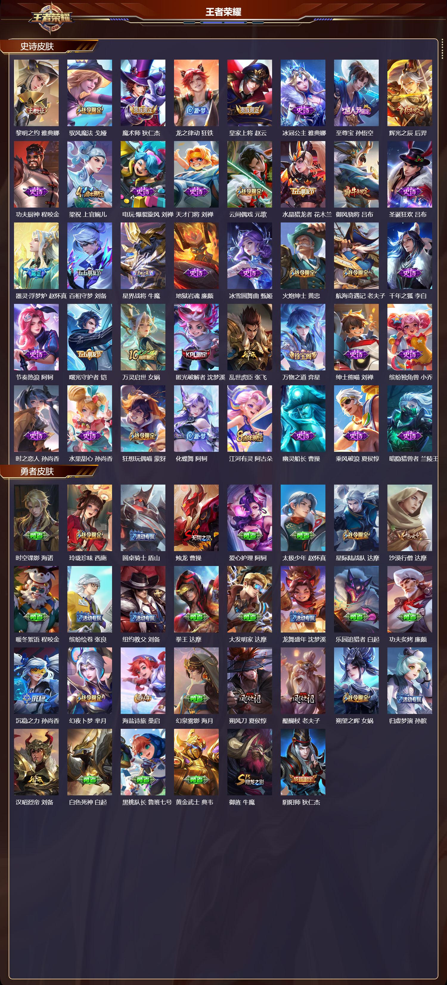 【89,史诗皮肤】,电玩小子,鲁班七号,末日机甲,吕布,白昼王子,嬴政,蔬乡物语,鲁班七号,百解令,蒙犽,暗渊魔法,司马懿,暗影游猎,马可波罗,燃音魔法,高渐离,苍穹之光,项羽,妄想食味,姬小满,德古拉伯爵,刘邦,山海·玄木吟,马可波罗,心灵战警,亚瑟,五谷丰年,鬼谷子,鬼剑武藏,宫本武藏,百相守梦,黄忠,星夜王子,白起,无限星赏官,公孙离,地狱燃心,司空震,瓦猫非猫,太乙真人,线条小狗,周瑜,遇见飞天,杨玉环,摇滚巨星,嬴政,顽趣,梦奇,冰锋战神,关羽,百相守梦,关羽,修罗,橘右京,魅力维加斯,妲己,黄金分割率,诸葛亮,偶像歌手,王昭君,荣光圣徽,蒙恬,九幽镇关,项羽,星界游侠,暃,舞动绿茵,蔡文姬,暗夜贵公子,嬴政,鹰眼统帅,狄仁杰,胡桃异想国,米莱狄,李小龙,裴擒虎,纤云弄巧,云中君,龙骑士,墨子,金属风暴,墨子,特工魅影,百里守约,猫狗日记,孙策,原初追逐者,百里玄策,逐浪之夏,李元芳,奇幻香踪,扁鹊,未来纪元,赵云,灵蛊蚀心,扁鹊,朱雀志,百里守约,黎明之约,雅典娜,驭风魔法,戈娅,魔术师,狄仁杰,龙之律动,狂铁,皇家上将,赵云,冰冠公主,雅典娜,至尊宝,孙悟空,辉光之辰,后羿,功夫厨神,程咬金,梁祝,上官婉儿,电玩·爆裂旋风,刘禅,天才门将,刘禅,云间偶戏,元歌,水晶猎龙者,花木兰,御风骁将,吕布,圣诞狂欢,吕布,器灵·浮梦炉,赵怀真,百相守梦,刘备,星界战将,牛魔,地狱岩魂,廉颇,冰雪圆舞曲,甄姬,火炮绅士,黄忠,航海奇遇记,老夫子,千年之狐,李白,节奏热浪,阿轲,曙光守护者,铠,万灵启世,女娲,匿光破解者,沈梦溪,乱世虎臣,张飞,万物之道,弈星,绅士熊喵,刘禅,缤纷独角兽,小乔,时之恋人,孙尚香,水果甜心,孙尚香,狂想玩偶喵,蒙犽,化蝶舞,阿轲,江河有灵,阿古朵,幽灵船长,曹操,乘风破浪,夏侯惇,暗隐猎兽者,兰陵王,