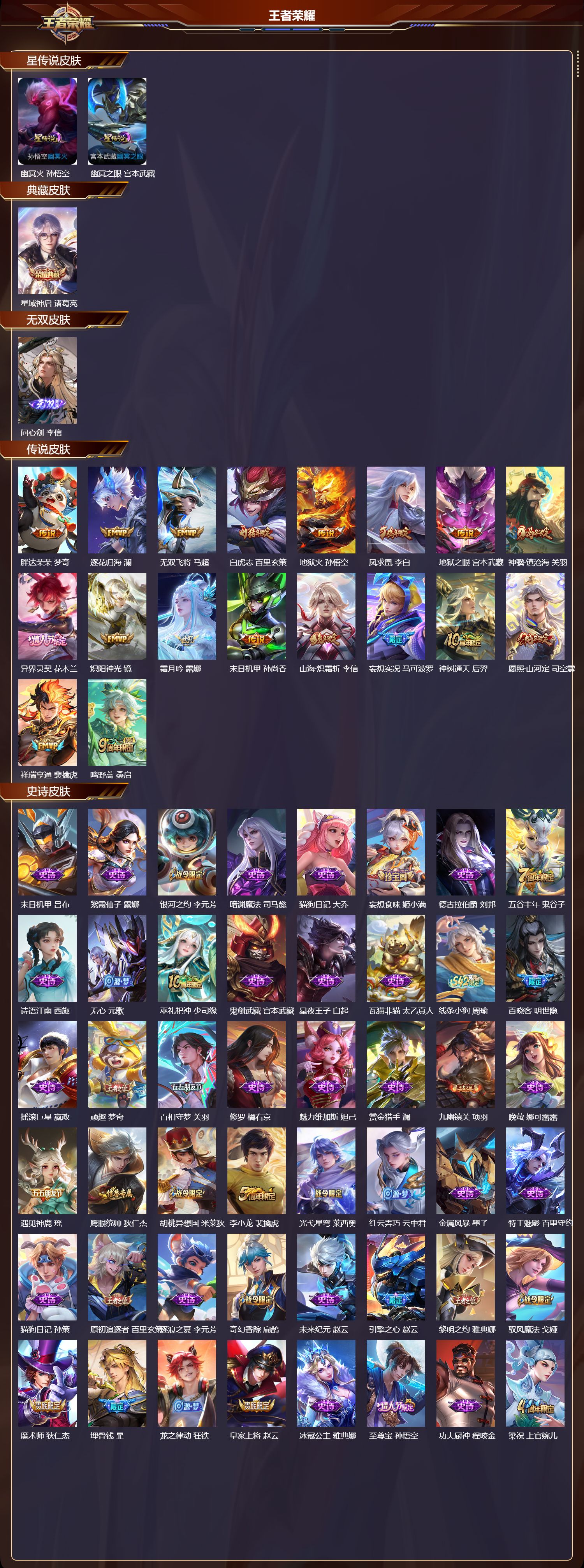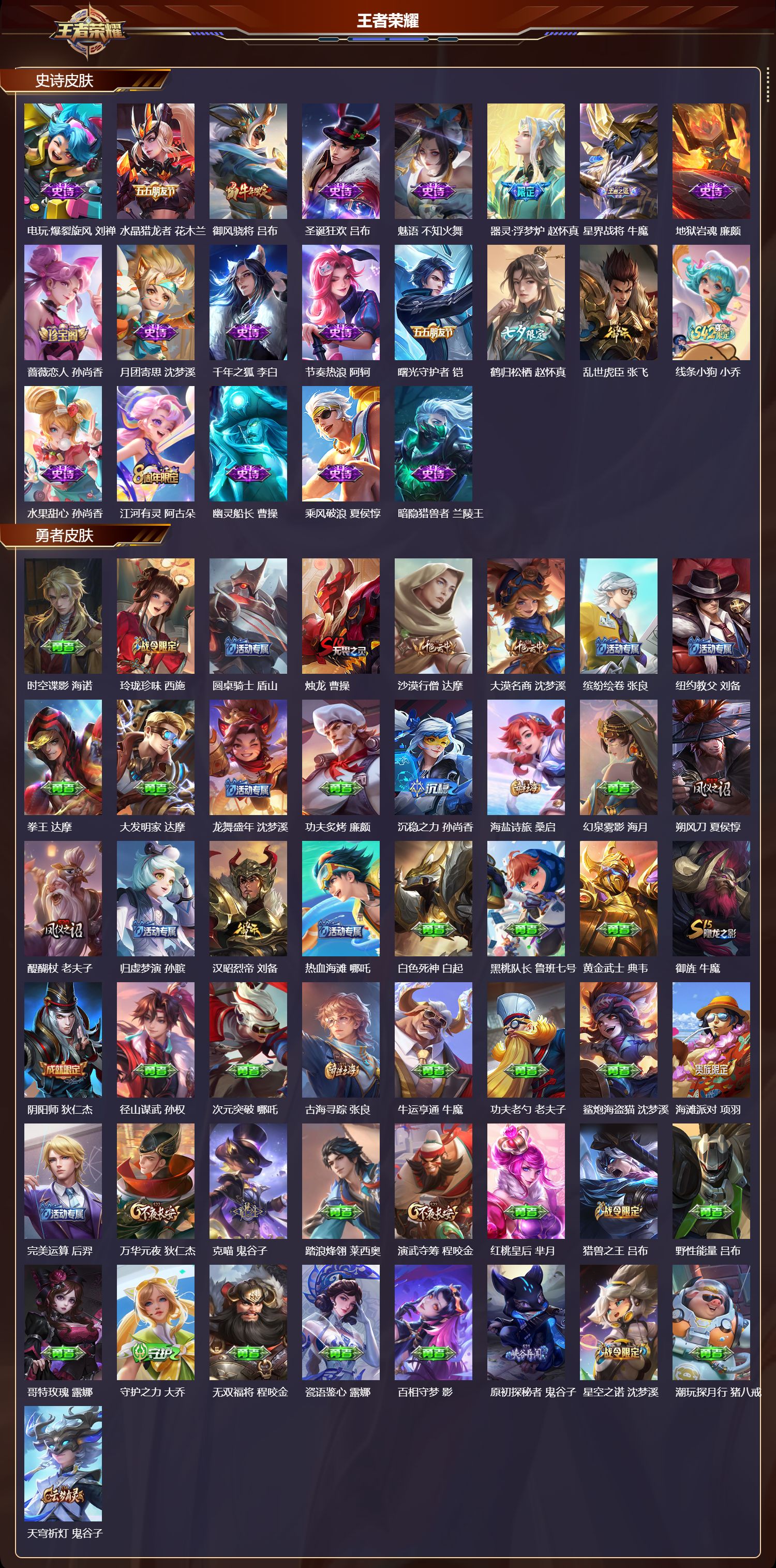 【69,史诗皮肤】,末日机甲,吕布,紫霞仙子,露娜,银河之约,李元芳,暗渊魔法,司马懿,猫狗日记,大乔,妄想食味,姬小满,德古拉伯爵,刘邦,五谷丰年,鬼谷子,诗语江南,西施,无心,元歌,巫礼祀神,少司缘,鬼剑武藏,宫本武藏,星夜王子,白起,瓦猫非猫,太乙真人,线条小狗,周瑜,百晓客,明世隐,摇滚巨星,嬴政,顽趣,梦奇,百相守梦,关羽,修罗,橘右京,魅力维加斯,妲己,赏金猎手,澜,九幽镇关,项羽,晚萤,娜可露露,遇见神鹿,瑶,鹰眼统帅,狄仁杰,胡桃异想国,米莱狄,李小龙,裴擒虎,光弋星穹,莱西奥,纤云弄巧,云中君,金属风暴,墨子,特工魅影,百里守约,猫狗日记,孙策,原初追逐者,百里玄策,逐浪之夏,李元芳,奇幻香踪,扁鹊,未来纪元,赵云,引擎之心,赵云,黎明之约,雅典娜,驭风魔法,戈娅,魔术师,狄仁杰,埋骨钱,暃,龙之律动,狂铁,皇家上将,赵云,冰冠公主,雅典娜,至尊宝,孙悟空,功夫厨神,程咬金,梁祝,上官婉儿,电玩·爆裂旋风,刘禅,水晶猎龙者,花木兰,御风骁将,吕布,圣诞狂欢,吕布,魅语,不知火舞,器灵·浮梦炉,赵怀真,星界战将,牛魔,地狱岩魂,廉颇,蔷薇恋人,孙尚香,月团寄思,沈梦溪,千年之狐,李白,节奏热浪,阿轲,曙光守护者,铠,鹤归松栖,赵怀真,乱世虎臣,张飞,线条小狗,小乔,水果甜心,孙尚香,江河有灵,阿古朵,幽灵船长,曹操,乘风破浪,夏侯惇,暗隐猎兽者,兰陵王,
