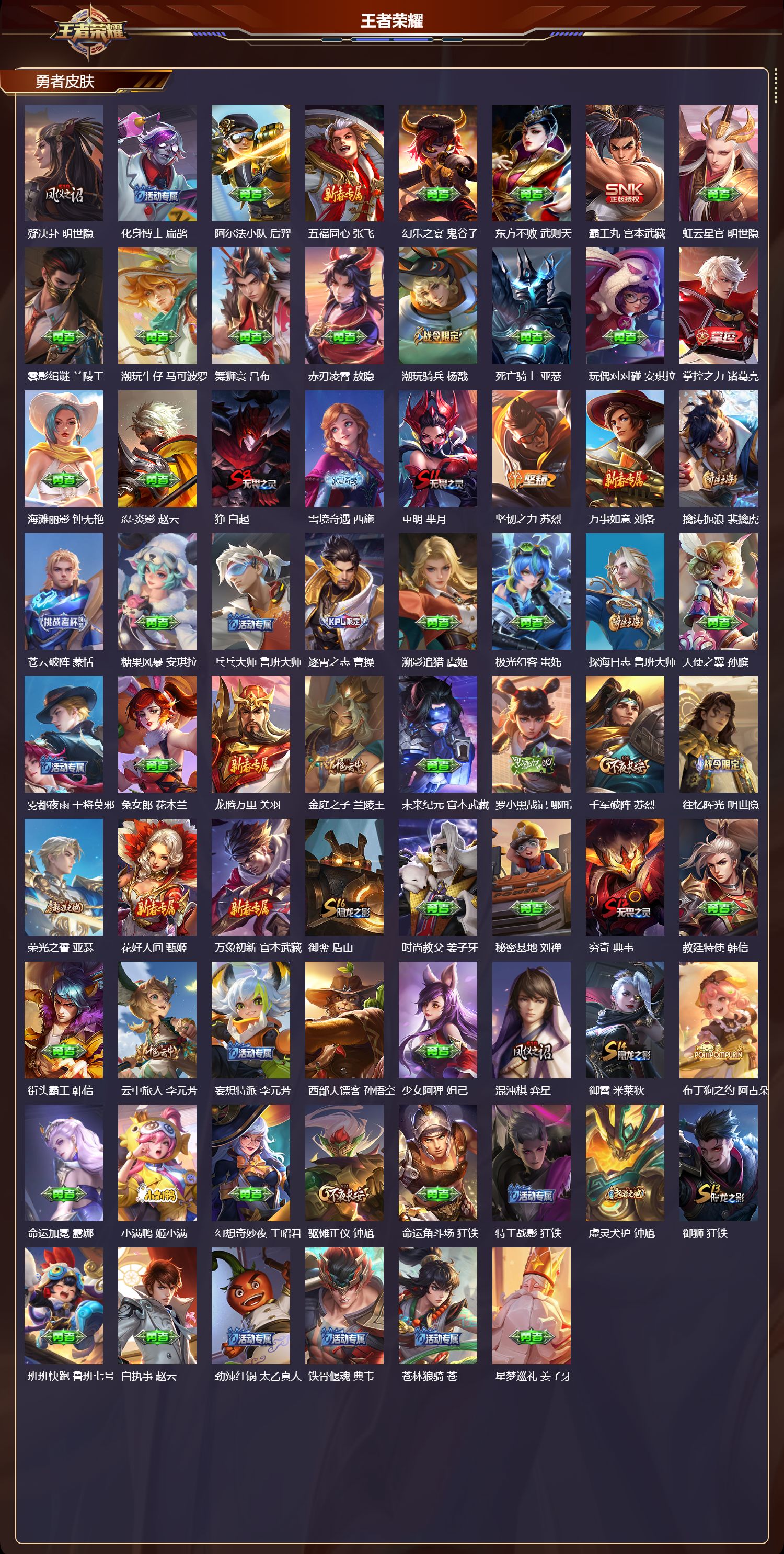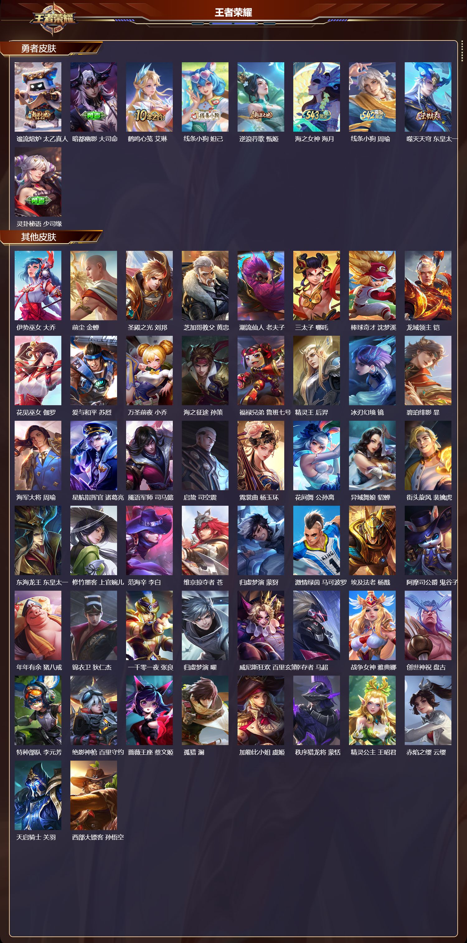 【128,勇者皮肤】,时空谍影,海诺,玲珑珍味,西施,圆桌骑士,盾山,烛龙,曹操,沙漠行僧,达摩,大漠名商,沈梦溪,缤纷绘卷,张良,纽约教父,刘备,拳王,达摩,大发明家,达摩,龙舞盛年,沈梦溪,功夫炙烤,廉颇,沉稳之力,孙尚香,海盐诗旅,桑启,幻泉雾影,海月,朔风刀,夏侯惇,醍醐杖,老夫子,归虚梦演,孙膑,汉昭烈帝,刘备,热血海滩,哪吒,白色死神,白起,黑桃队长,鲁班七号,黄金武士,典韦,御旌,牛魔,阴阳师,狄仁杰,径山谋武,孙权,次元突破,哪吒,古海寻踪,张良,牛运亨通,牛魔,功夫老勺,老夫子,鲨炮海盗猫,沈梦溪,海滩派对,项羽,完美运算,后羿,万华元夜,狄仁杰,克喵,鬼谷子,踏浪烽翎,莱西奥,演武夺筹,程咬金,红桃皇后,芈月,猎兽之王,吕布,野性能量,吕布,哥特玫瑰,露娜,守护之力,大乔,无双福将,程咬金,瓷语鉴心,露娜,百相守梦,影,原初探秘者,鬼谷子,星空之诺,沈梦溪,潮玩探月行,猪八戒,天穹祈灯,鬼谷子,疑决卦,明世隐,化身博士,扁鹊,阿尔法小队,后羿,五福同心,张飞,幻乐之宴,鬼谷子,东方不败,武则天,霸王丸,宫本武藏,虹云星官,明世隐,雾影缉谜,兰陵王,潮玩牛仔,马可波罗,舞狮寰,吕布,赤刃凌霄,敖隐,潮玩骑兵,杨戬,死亡骑士,亚瑟,玩偶对对碰,安琪拉,掌控之力,诸葛亮,海滩丽影,钟无艳,忍·炎影,赵云,狰,白起,雪境奇遇,西施,重明,芈月,坚韧之力,苏烈,万事如意,刘备,擒涛扼浪,裴擒虎,苍云破阵,蒙恬,糖果风暴,安琪拉,乓乓大师,鲁班大师,逐霄之志,曹操,溯影追猎,虞姬,极光幻客,蚩奼,探海日志,鲁班大师,天使之翼,孙膑,雾都夜雨,干将莫邪,兔女郎,花木兰,龙腾万里,关羽,金庭之子,兰陵王,未来纪元,宫本武藏,罗小黑战记,哪吒,千军破阵,苏烈,往忆晖光,明世隐,荣光之誓,亚瑟,花好人间,甄姬,万象初新,宫本武藏,御銮,盾山,时尚教父,姜子牙,秘密基地,刘禅,穷奇,典韦,教廷特使,韩信,街头霸王,韩信,云中旅人,李元芳,妄想特派,李元芳,西部大镖客,孙悟空,少女阿狸,妲己,混沌棋,弈星,御霄,米莱狄,布丁狗之约,阿古朵,命运加冕,露娜,小满鸭,姬小满,幻想奇妙夜,王昭君,驱傩正仪,钟馗,命运角斗场,狂铁,特工战影,狂铁,虚灵犬护,钟馗,御狮,狂铁,班班快跑,鲁班七号,白执事,赵云,劲辣红锅,太乙真人,铁骨偃魂,典韦,苍林狼骑,苍,星梦巡礼,姜子牙,谧流熔炉,太乙真人,暗都幽影,大司命,鹤鸣心笺,艾琳,线条小狗,妲己,逆浪荇歌,甄姬,海之女神,海月,线条小狗,周瑜,噬灭天穹,东皇太一,灵卦秘语,少司缘,