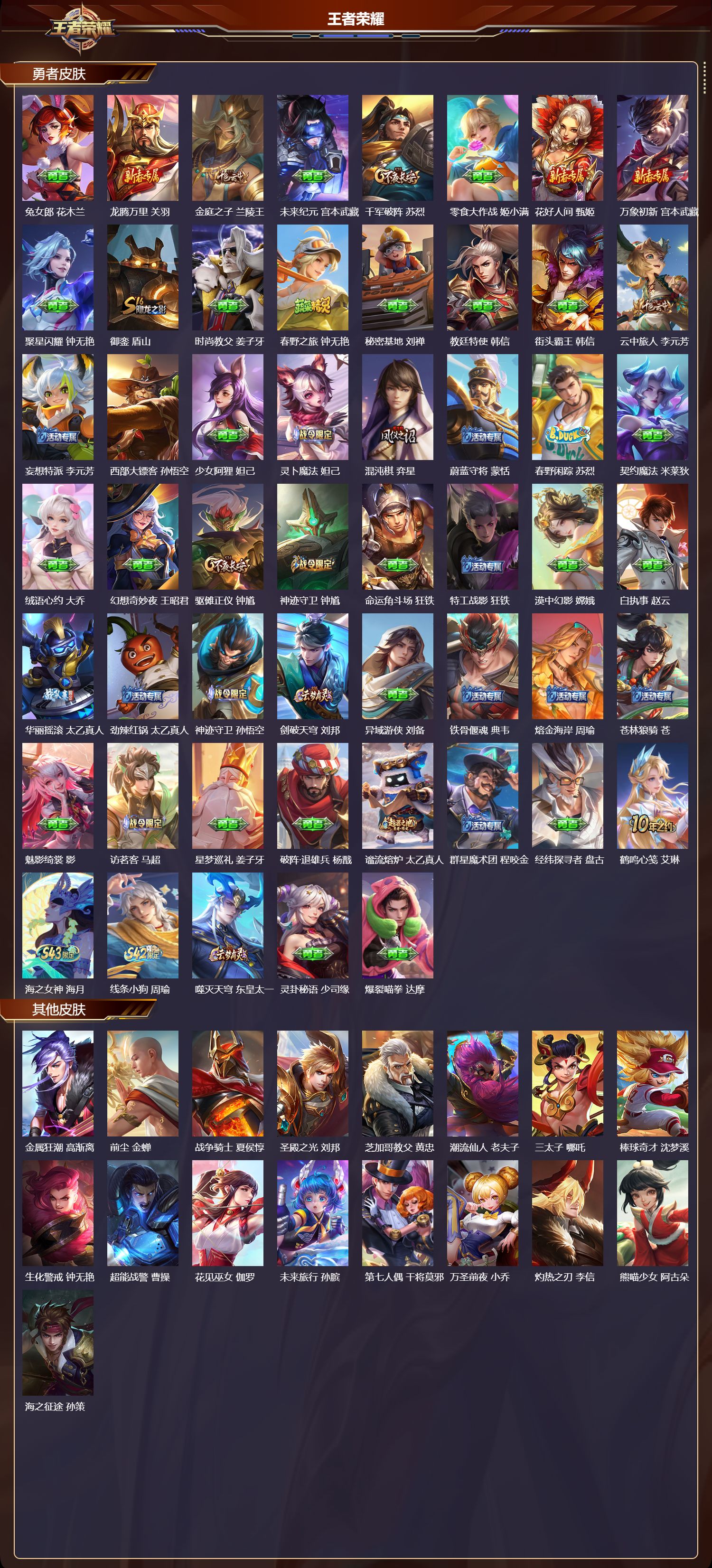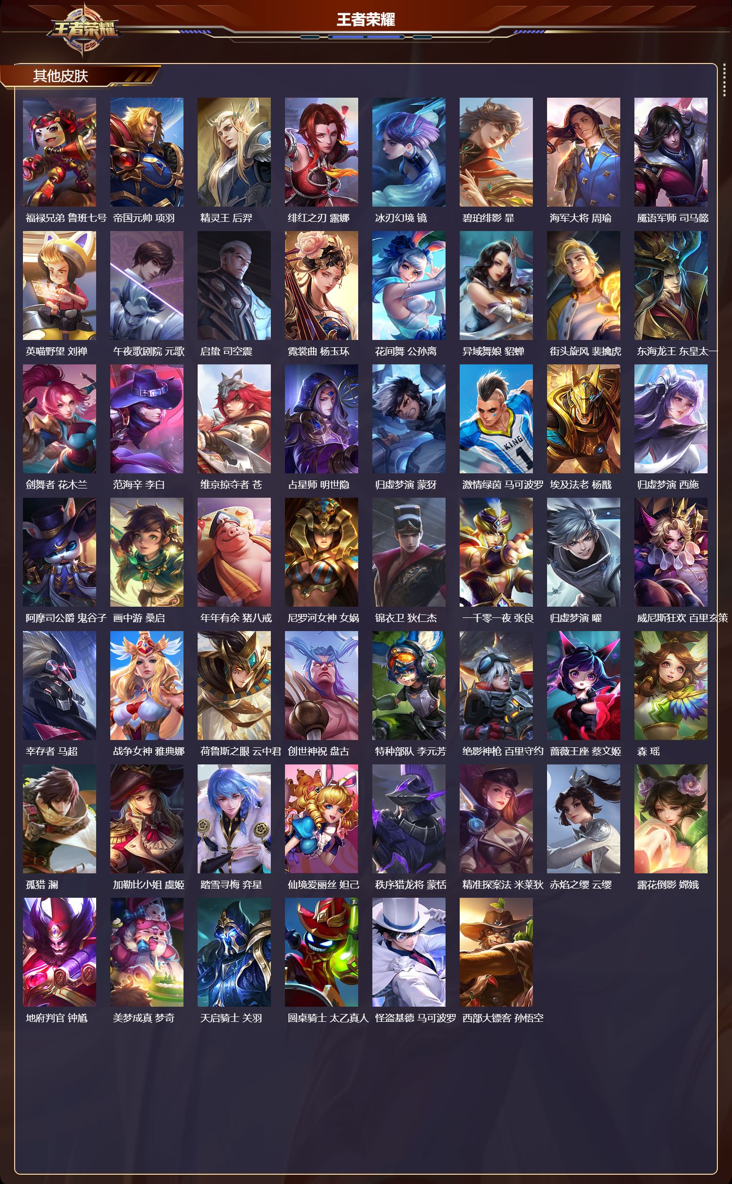 【71,其他皮肤】,金属狂潮,高渐离,前尘,金蝉,战争骑士,夏侯惇,圣殿之光,刘邦,芝加哥教父,黄忠,潮流仙人,老夫子,三太子,哪吒,棒球奇才,沈梦溪,生化警戒,钟无艳,超能战警,曹操,花见巫女,伽罗,未来旅行,孙膑,第七人偶,干将莫邪,万圣前夜,小乔,灼热之刃,李信,熊喵少女,阿古朵,海之征途,孙策,福禄兄弟,鲁班七号,帝国元帅,项羽,精灵王,后羿,绯红之刃,露娜,冰刃幻境,镜,碧珀绯影,暃,海军大将,周瑜,魇语军师,司马懿,英喵野望,刘禅,午夜歌剧院,元歌,启蛰,司空震,霓裳曲,杨玉环,花间舞,公孙离,异域舞娘,貂蝉,街头旋风,裴擒虎,东海龙王,东皇太一,剑舞者,花木兰,范海辛,李白,维京掠夺者,苍,占星师,明世隐,归虚梦演,蒙犽,激情绿茵,马可波罗,埃及法老,杨戬,归虚梦演,西施,阿摩司公爵,鬼谷子,画中游,桑启,年年有余,猪八戒,尼罗河女神,女娲,锦衣卫,狄仁杰,一千零一夜,张良,归虚梦演,曜,威尼斯狂欢,百里玄策,幸存者,马超,战争女神,雅典娜,荷鲁斯之眼,云中君,创世神祝,盘古,特种部队,李元芳,绝影神枪,百里守约,蔷薇王座,蔡文姬,森,瑶,孤猎,澜,加勒比小姐,虞姬,踏雪寻梅,弈星,仙境爱丽丝,妲己,秩序猎龙将,蒙恬,精准探案法,米莱狄,赤焰之缨,云缨,露花倒影,嫦娥,地府判官,钟馗,美梦成真,梦奇,天启骑士,关羽,圆桌骑士,太乙真人,怪盗基德,马可波罗,西部大镖客,孙悟空,