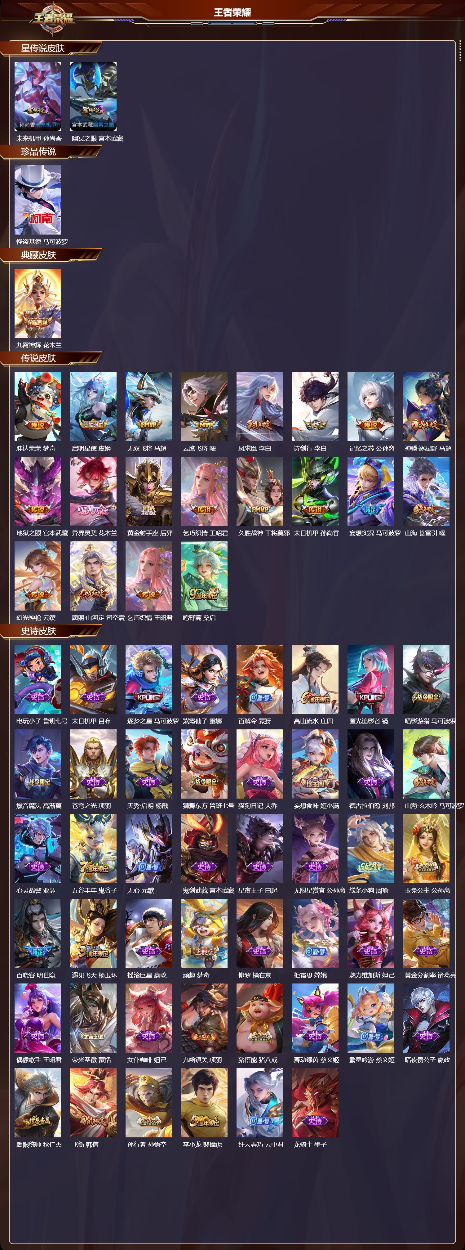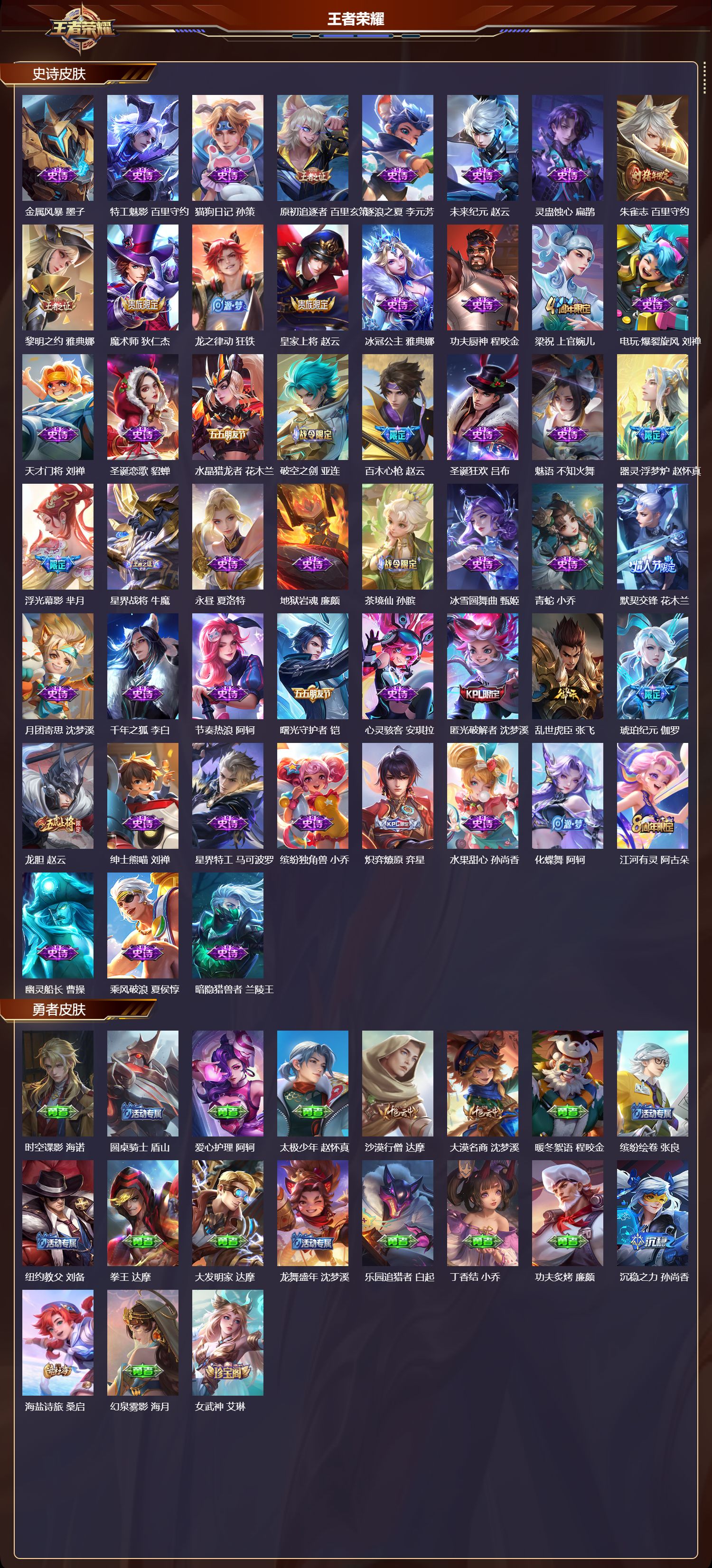 【97,史诗皮肤】,电玩小子,鲁班七号,末日机甲,吕布,逐梦之星,马可波罗,紫霞仙子,露娜,百解令,蒙犽,高山流水,庄周,匿光追影者,镜,暗影游猎,马可波罗,燃音魔法,高渐离,苍穹之光,项羽,天秀·启明,杨戬,狮舞东方,鲁班七号,猫狗日记,大乔,妄想食味,姬小满,德古拉伯爵,刘邦,山海·玄木吟,马可波罗,心灵战警,亚瑟,五谷丰年,鬼谷子,无心,元歌,鬼剑武藏,宫本武藏,星夜王子,白起,无限星赏官,公孙离,线条小狗,周瑜,玉兔公主,公孙离,百晓客,明世隐,遇见飞天,杨玉环,摇滚巨星,嬴政,顽趣,梦奇,修罗,橘右京,拒霜思,嫦娥,魅力维加斯,妲己,黄金分割率,诸葛亮,偶像歌手,王昭君,荣光圣徽,蒙恬,女仆咖啡,妲己,九幽镇关,项羽,猪悟能,猪八戒,舞动绿茵,蔡文姬,繁星吟游,蔡文姬,暗夜贵公子,嬴政,鹰眼统帅,狄仁杰,飞衡,韩信,孙行者,孙悟空,李小龙,裴擒虎,纤云弄巧,云中君,龙骑士,墨子,金属风暴,墨子,特工魅影,百里守约,猫狗日记,孙策,原初追逐者,百里玄策,逐浪之夏,李元芳,未来纪元,赵云,灵蛊蚀心,扁鹊,朱雀志,百里守约,黎明之约,雅典娜,魔术师,狄仁杰,龙之律动,狂铁,皇家上将,赵云,冰冠公主,雅典娜,功夫厨神,程咬金,梁祝,上官婉儿,电玩·爆裂旋风,刘禅,天才门将,刘禅,圣诞恋歌,貂蝉,水晶猎龙者,花木兰,破空之剑,亚连,百木心枪,赵云,圣诞狂欢,吕布,魅语,不知火舞,器灵·浮梦炉,赵怀真,浮光幕影,芈月,星界战将,牛魔,永昼,夏洛特,地狱岩魂,廉颇,茶境仙,孙膑,冰雪圆舞曲,甄姬,青蛇,小乔,默契交锋,花木兰,月团寄思,沈梦溪,千年之狐,李白,节奏热浪,阿轲,曙光守护者,铠,心灵骇客,安琪拉,匿光破解者,沈梦溪,乱世虎臣,张飞,琥珀纪元,伽罗,龙胆,赵云,绅士熊喵,刘禅,星界特工,马可波罗,缤纷独角兽,小乔,炽弈燎原,弈星,水果甜心,孙尚香,化蝶舞,阿轲,江河有灵,阿古朵,幽灵船长,曹操,乘风破浪,夏侯惇,暗隐猎兽者,兰陵王,