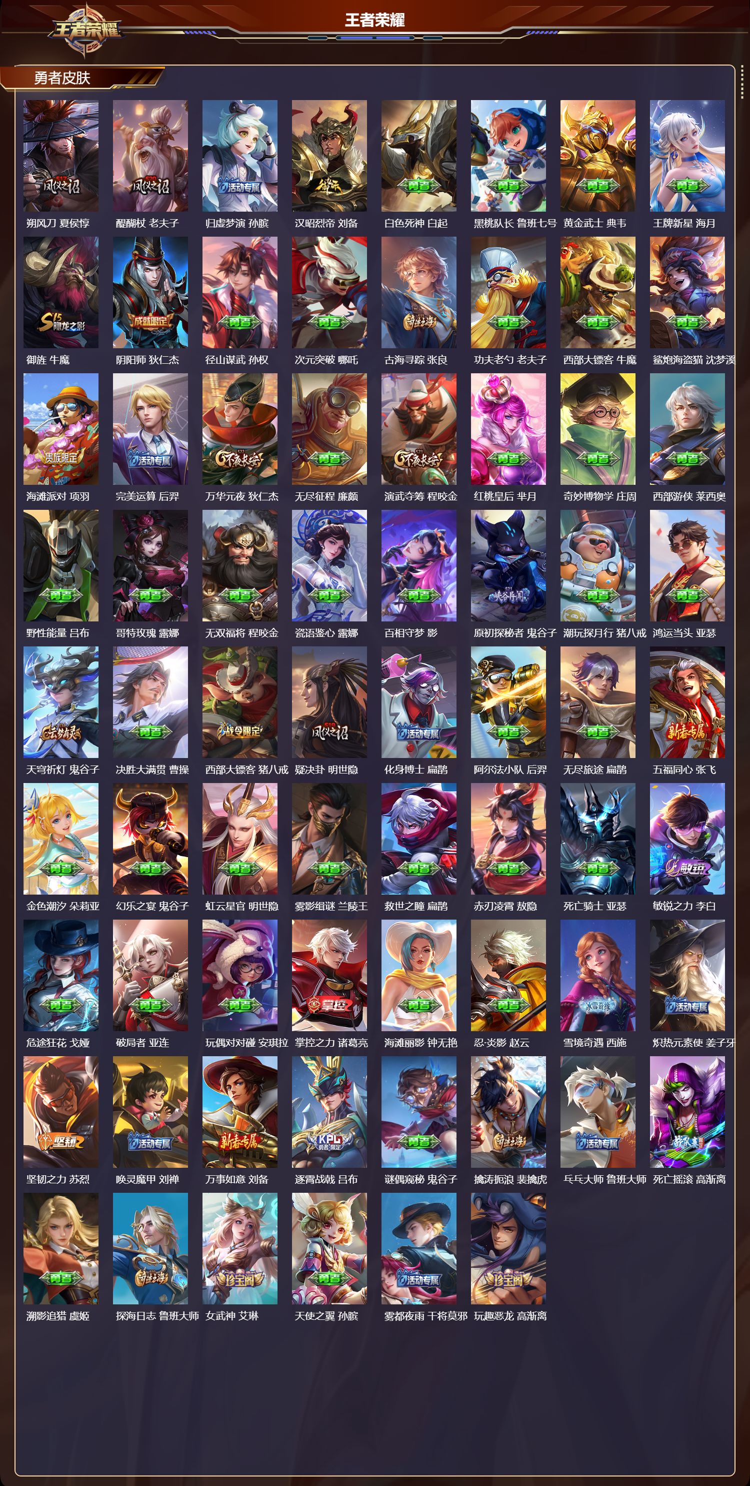 【141,勇者皮肤】,时空谍影,海诺,圆桌骑士,盾山,爱心护理,阿轲,太极少年,赵怀真,沙漠行僧,达摩,大漠名商,沈梦溪,暖冬絮语,程咬金,缤纷绘卷,张良,纽约教父,刘备,拳王,达摩,大发明家,达摩,龙舞盛年,沈梦溪,乐园追猎者,白起,丁香结,小乔,功夫炙烤,廉颇,沉稳之力,孙尚香,海盐诗旅,桑启,幻泉雾影,海月,朔风刀,夏侯惇,醍醐杖,老夫子,归虚梦演,孙膑,汉昭烈帝,刘备,白色死神,白起,黑桃队长,鲁班七号,黄金武士,典韦,王牌新星,海月,御旌,牛魔,阴阳师,狄仁杰,径山谋武,孙权,次元突破,哪吒,古海寻踪,张良,功夫老勺,老夫子,西部大镖客,牛魔,鲨炮海盗猫,沈梦溪,海滩派对,项羽,完美运算,后羿,万华元夜,狄仁杰,无尽征程,廉颇,演武夺筹,程咬金,红桃皇后,芈月,奇妙博物学,庄周,西部游侠,莱西奥,野性能量,吕布,哥特玫瑰,露娜,无双福将,程咬金,瓷语鉴心,露娜,百相守梦,影,原初探秘者,鬼谷子,潮玩探月行,猪八戒,鸿运当头,亚瑟,天穹祈灯,鬼谷子,决胜大满贯,曹操,西部大镖客,猪八戒,疑决卦,明世隐,化身博士,扁鹊,阿尔法小队,后羿,无尽旅途,扁鹊,五福同心,张飞,金色潮汐,朵莉亚,幻乐之宴,鬼谷子,虹云星官,明世隐,雾影缉谜,兰陵王,救世之瞳,扁鹊,赤刃凌霄,敖隐,死亡骑士,亚瑟,敏锐之力,李白,危途狂花,戈娅,破局者,亚连,玩偶对对碰,安琪拉,掌控之力,诸葛亮,海滩丽影,钟无艳,忍·炎影,赵云,雪境奇遇,西施,炽热元素使,姜子牙,坚韧之力,苏烈,唤灵魔甲,刘禅,万事如意,刘备,逐霄战戟,吕布,谜偶窥秘,鬼谷子,擒涛扼浪,裴擒虎,乓乓大师,鲁班大师,死亡摇滚,高渐离,溯影追猎,虞姬,探海日志,鲁班大师,女武神,艾琳,天使之翼,孙膑,雾都夜雨,干将莫邪,玩趣恶龙,高渐离,兔女郎,花木兰,龙腾万里,关羽,金庭之子,兰陵王,未来纪元,宫本武藏,千军破阵,苏烈,零食大作战,姬小满,花好人间,甄姬,万象初新,宫本武藏,聚星闪耀,钟无艳,御銮,盾山,时尚教父,姜子牙,春野之旅,钟无艳,秘密基地,刘禅,教廷特使,韩信,街头霸王,韩信,云中旅人,李元芳,妄想特派,李元芳,西部大镖客,孙悟空,少女阿狸,妲己,灵卜魔法,妲己,混沌棋,弈星,蔚蓝守将,蒙恬,春野闲踪,苏烈,契约魔法,米莱狄,绒语心约,大乔,幻想奇妙夜,王昭君,驱傩正仪,钟馗,神迹守卫,钟馗,命运角斗场,狂铁,特工战影,狂铁,漠中幻影,嫦娥,白执事,赵云,华丽摇滚,太乙真人,劲辣红锅,太乙真人,神迹守卫,孙悟空,剑破天穹,刘邦,异域游侠,刘备,铁骨偃魂,典韦,熔金海岸,周瑜,苍林狼骑,苍,魅影绮裳,影,访茗客,马超,星梦巡礼,姜子牙,破阵·退雄兵,杨戬,谧流熔炉,太乙真人,群星魔术团,程咬金,经纬探寻者,盘古,鹤鸣心笺,艾琳,海之女神,海月,线条小狗,周瑜,噬灭天穹,东皇太一,灵卦秘语,少司缘,爆裂喵拳,达摩,