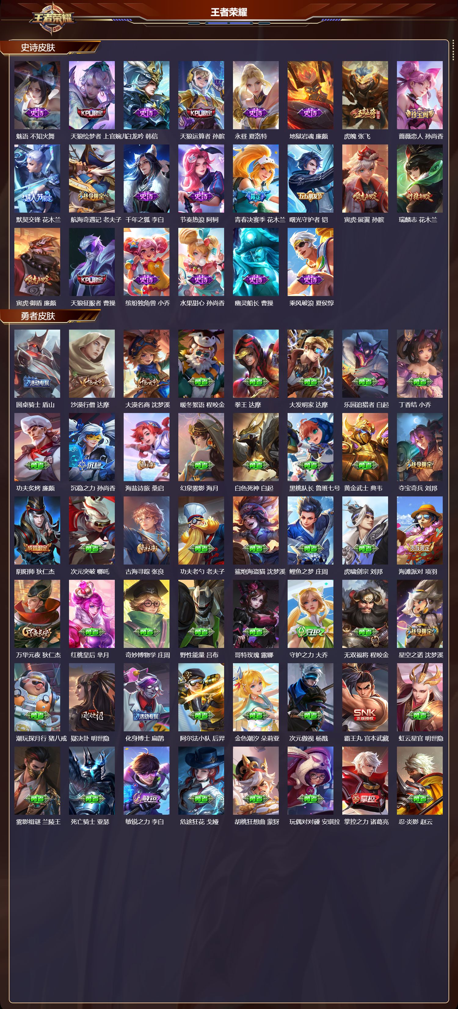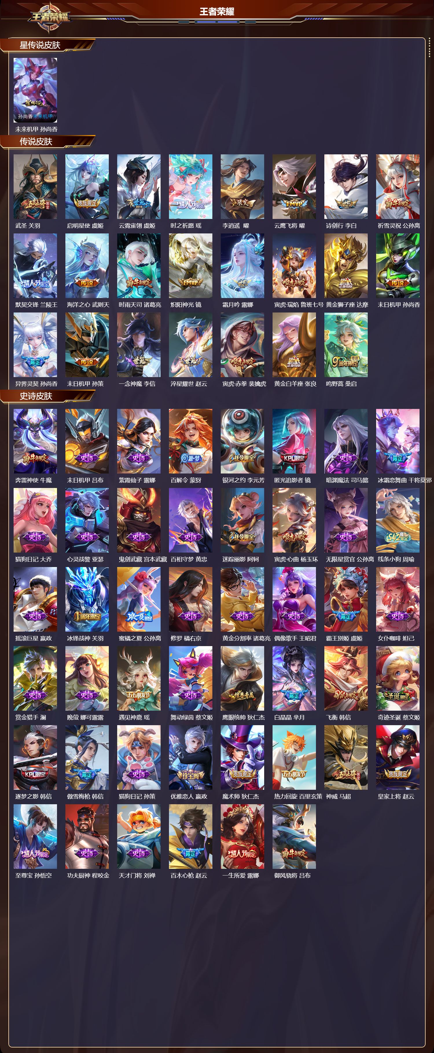 【68,史诗皮肤】,奔雷神使,牛魔,末日机甲,吕布,紫霞仙子,露娜,百解令,蒙犽,银河之约,李元芳,匿光追影者,镜,暗渊魔法,司马懿,冰霜恋舞曲,干将莫邪,猫狗日记,大乔,心灵战警,亚瑟,鬼剑武藏,宫本武藏,百相守梦,黄忠,迷踪丽影,阿轲,寅虎·心曲,杨玉环,无限星赏官,公孙离,线条小狗,周瑜,摇滚巨星,嬴政,冰锋战神,关羽,蜜橘之夏,公孙离,修罗,橘右京,黄金分割率,诸葛亮,偶像歌手,王昭君,霸王别姬,虞姬,女仆咖啡,妲己,赏金猎手,澜,晚萤,娜可露露,遇见神鹿,瑶,舞动绿茵,蔡文姬,鹰眼统帅,狄仁杰,白晶晶,芈月,飞衡,韩信,奇迹圣诞,蔡文姬,逐梦之影,韩信,傲雪梅枪,韩信,猫狗日记,孙策,优雅恋人,嬴政,魔术师,狄仁杰,热力回旋,百里玄策,神威,马超,皇家上将,赵云,至尊宝,孙悟空,功夫厨神,程咬金,天才门将,刘禅,百木心枪,赵云,一生所爱,露娜,御风骁将,吕布,魅语,不知火舞,天狼绘梦者,上官婉儿,白龙吟,韩信,天狼运算者,孙膑,永昼,夏洛特,地狱岩魂,廉颇,虎魄,张飞,蔷薇恋人,孙尚香,默契交锋,花木兰,航海奇遇记,老夫子,千年之狐,李白,节奏热浪,阿轲,青春决赛季,花木兰,曙光守护者,铠,寅虎·展翼,孙膑,瑞麟志,花木兰,寅虎·御盾,廉颇,天狼征服者,曹操,缤纷独角兽,小乔,水果甜心,孙尚香,幽灵船长,曹操,乘风破浪,夏侯惇,