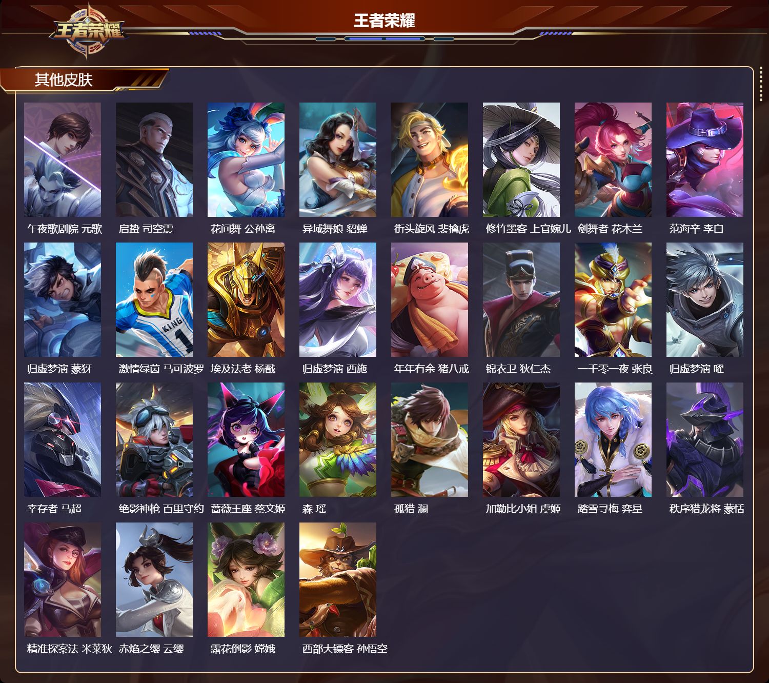 【49,其他皮肤】,伊势巫女,大乔,前尘,金蝉,圣殿之光,刘邦,芝加哥教父,黄忠,三太子,哪吒,棒球奇才,沈梦溪,龙域领主,铠,生化警戒,钟无艳,死神来了,曹操,花见巫女,伽罗,未来旅行,孙膑,万圣前夜,小乔,海之征途,孙策,帝国元帅,项羽,精灵王,后羿,绯红之刃,露娜,冰刃幻境,镜,碧珀绯影,暃,星航指挥官,诸葛亮,魇语军师,司马懿,英喵野望,刘禅,午夜歌剧院,元歌,启蛰,司空震,花间舞,公孙离,异域舞娘,貂蝉,街头旋风,裴擒虎,修竹墨客,上官婉儿,剑舞者,花木兰,范海辛,李白,归虚梦演,蒙犽,激情绿茵,马可波罗,埃及法老,杨戬,归虚梦演,西施,年年有余,猪八戒,锦衣卫,狄仁杰,一千零一夜,张良,归虚梦演,曜,幸存者,马超,绝影神枪,百里守约,蔷薇王座,蔡文姬,森,瑶,孤猎,澜,加勒比小姐,虞姬,踏雪寻梅,弈星,秩序猎龙将,蒙恬,精准探案法,米莱狄,赤焰之缨,云缨,露花倒影,嫦娥,西部大镖客,孙悟空,