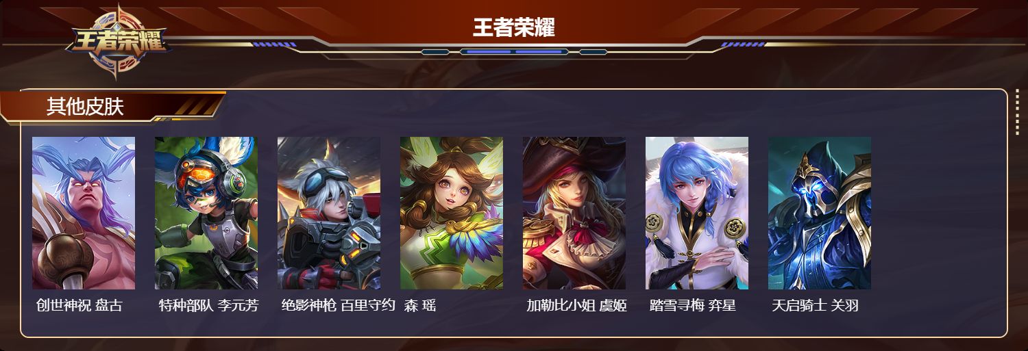 【18,其他皮肤】,熊喵少女,阿古朵,帝国元帅,项羽,精灵王,后羿,归虚梦演,鲁班大师,占星师,明世隐,归虚梦演,蒙犽,激情绿茵,马可波罗,阿摩司公爵,鬼谷子,年年有余,猪八戒,尼罗河女神,女娲,战争女神,雅典娜,创世神祝,盘古,特种部队,李元芳,绝影神枪,百里守约,森,瑶,加勒比小姐,虞姬,踏雪寻梅,弈星,天启骑士,关羽,