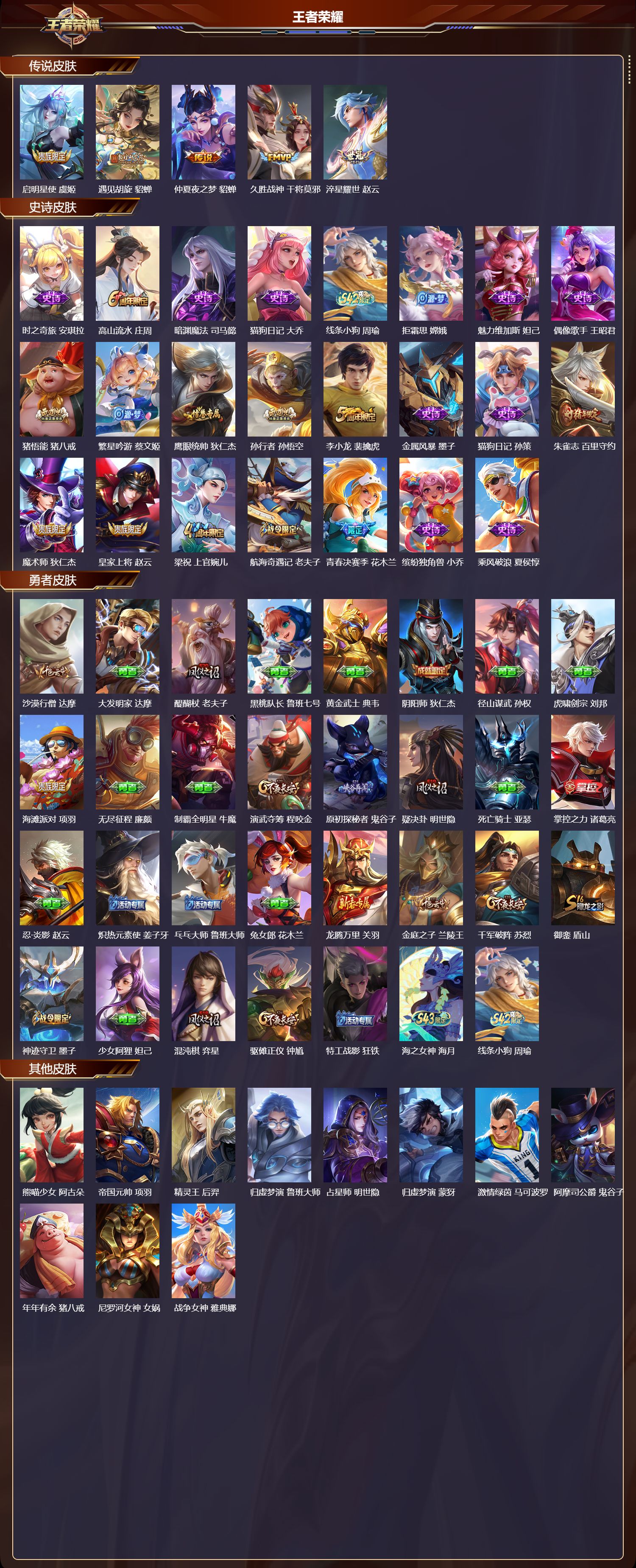 【31,勇者皮肤】,沙漠行僧,达摩,大发明家,达摩,醍醐杖,老夫子,黑桃队长,鲁班七号,黄金武士,典韦,阴阳师,狄仁杰,径山谋武,孙权,虎啸剑宗,刘邦,海滩派对,项羽,无尽征程,廉颇,制霸全明星,牛魔,演武夺筹,程咬金,原初探秘者,鬼谷子,疑决卦,明世隐,死亡骑士,亚瑟,掌控之力,诸葛亮,忍·炎影,赵云,炽热元素使,姜子牙,乓乓大师,鲁班大师,兔女郎,花木兰,龙腾万里,关羽,金庭之子,兰陵王,千军破阵,苏烈,御銮,盾山,神迹守卫,墨子,少女阿狸,妲己,混沌棋,弈星,驱傩正仪,钟馗,特工战影,狂铁,海之女神,海月,线条小狗,周瑜,